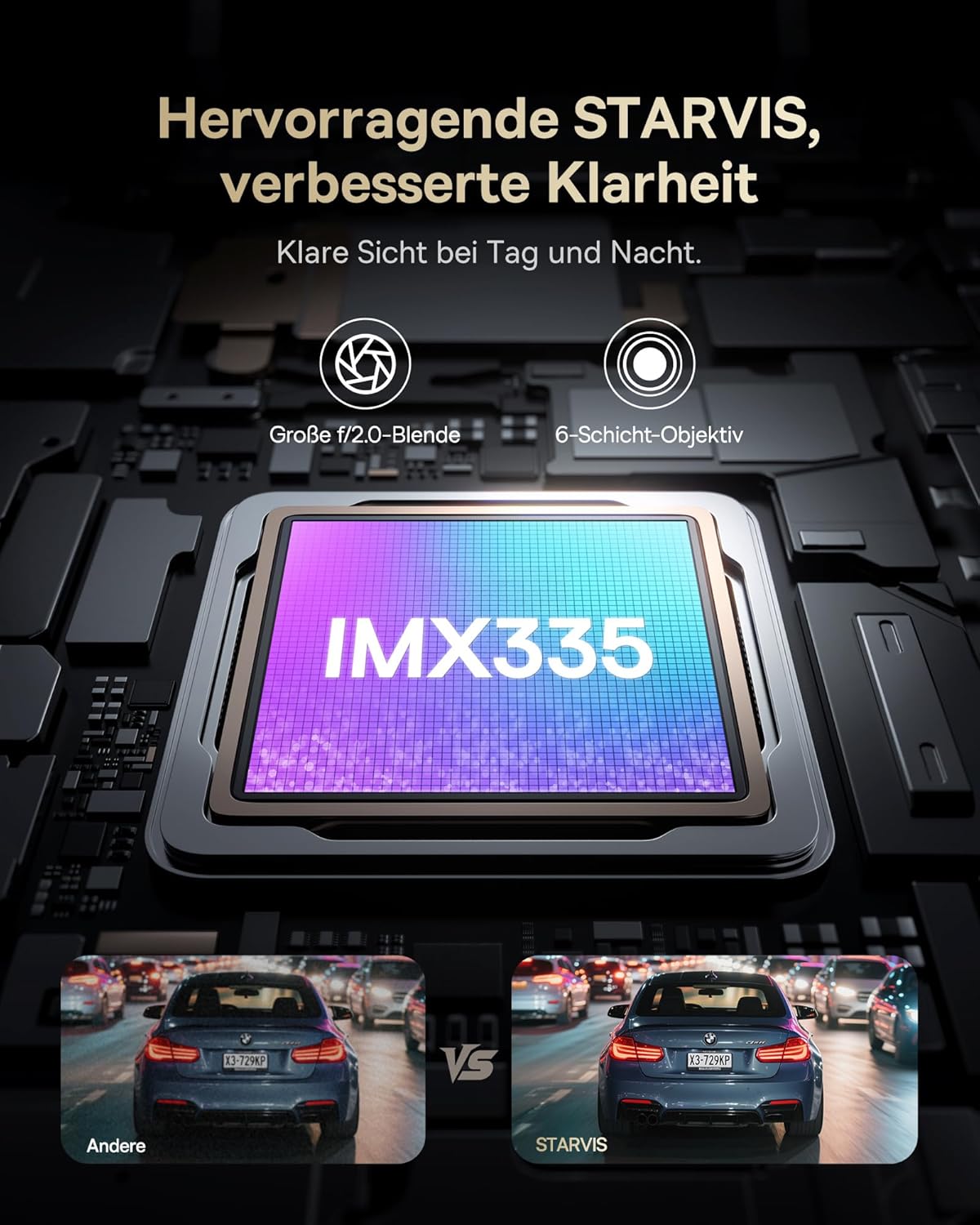 • 【Подобрено нощно виждане STARVIS】 - Оборудван със сензор IMX335, 6-елементен обектив и бленда f/1.6, този видеорегистратор осигурява изключителни резултати дори при слаба светлина. Независимо дали в тунели, дъжд или почти пълен мрак, важните детайли се записват надеждно.