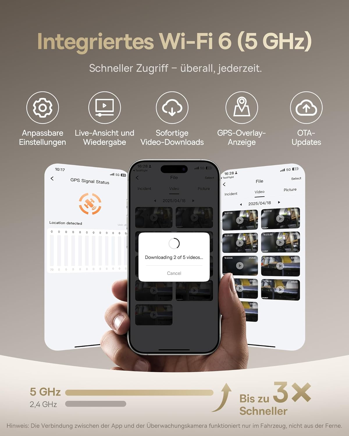 • 5 GHz WiFi 6, управление чрез приложение: Вграденият 5 GHz WiFi 6 позволява до 3 пъти по-бързо изтегляне на видео. С приложението Baseus можете да преглеждате и запазвате записи, да преглеждате GPS данни и да получавате OTA актуализации. Изгледът на приложението работи само когато телефонът ви е близо до автомобила и е свързан към WiFi мрежата на видеорегистратора. За оптимална производителност, форматирайте microSD картата директно в видеорегистратора преди първа употреба.