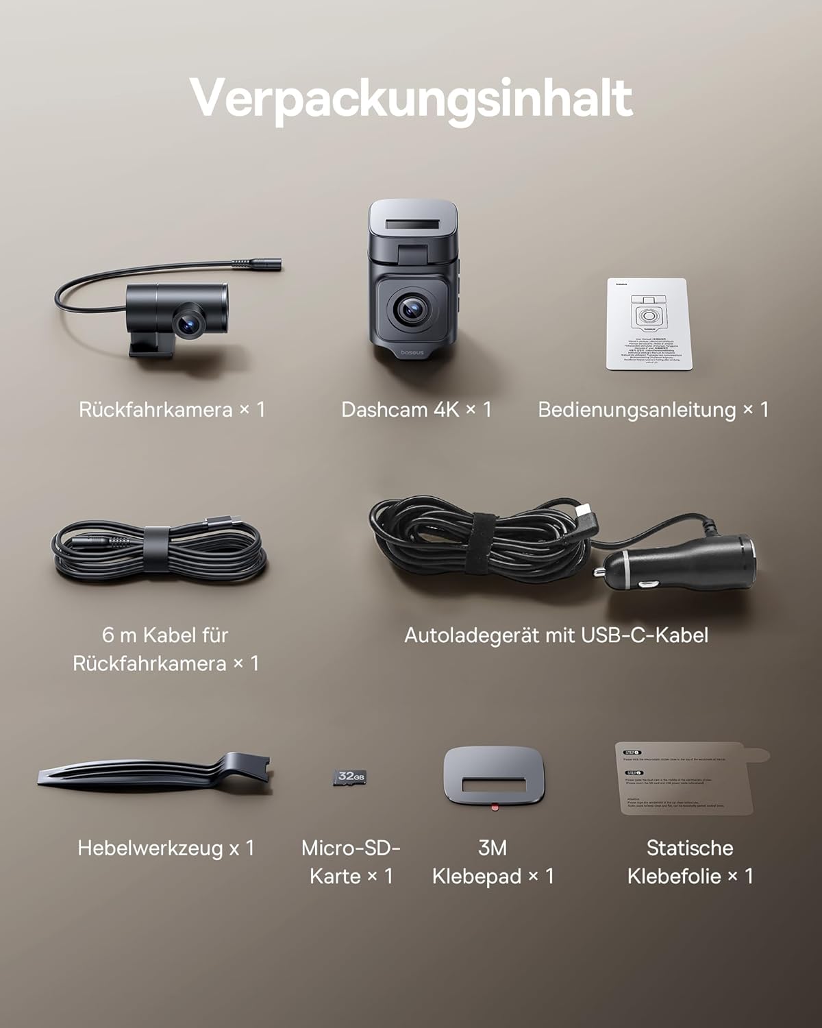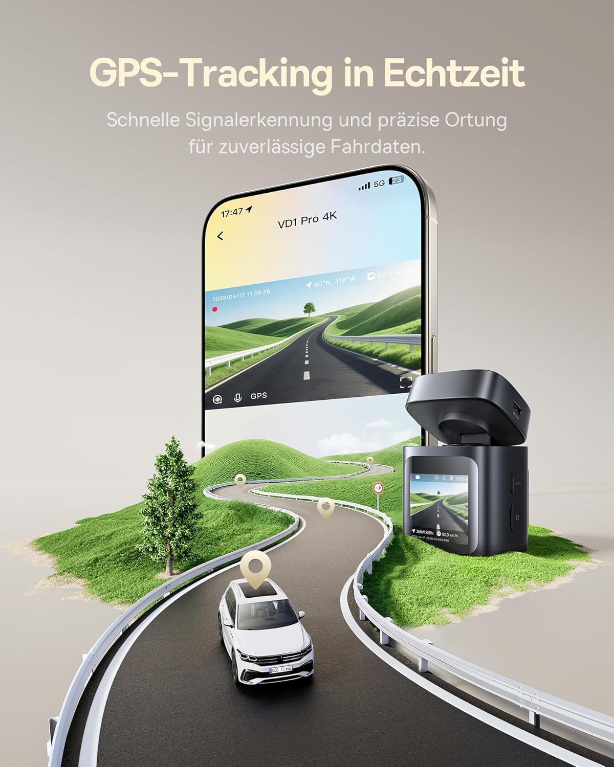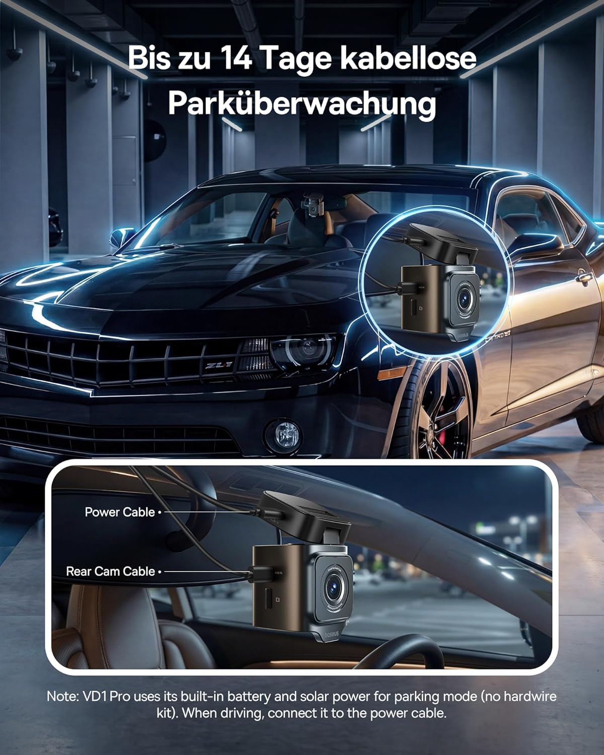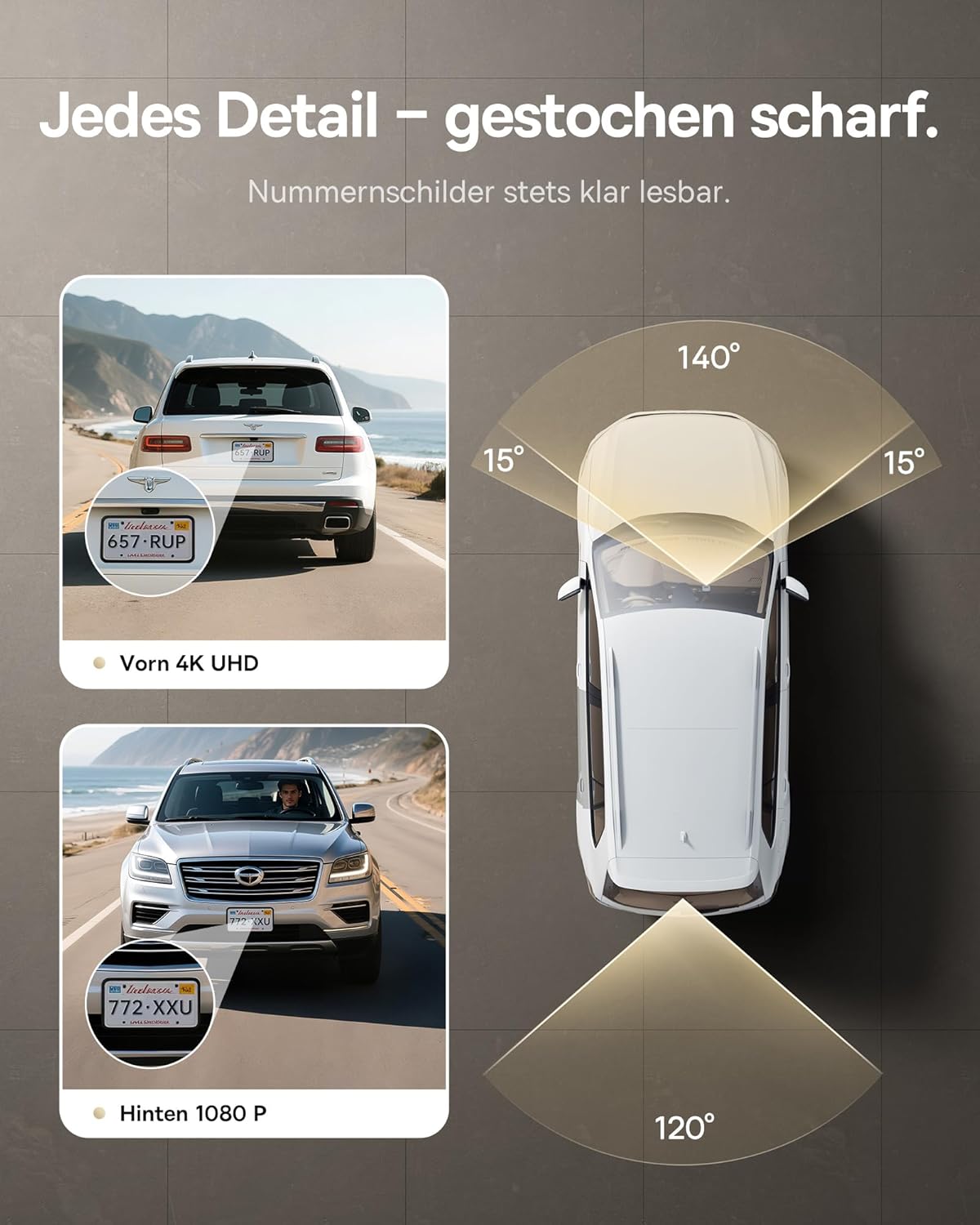 • 【4K + 1080P Двоен запис отпред и отзад】 - Независимо дали сте пред вас в 4K UHD HDR или зад вас в 1080P: Тази предна и задна видеокамера заснема всеки детайл ясно и надеждно – денем и нощем. 170° широкоъгълният преден изглед и 120° обективът за задно виждане осигуряват пълно покритие на околността на автомобила.