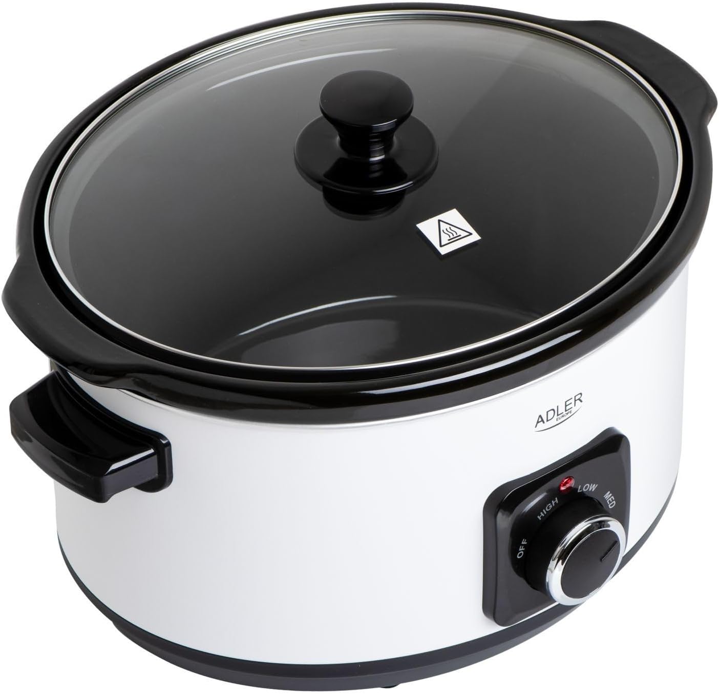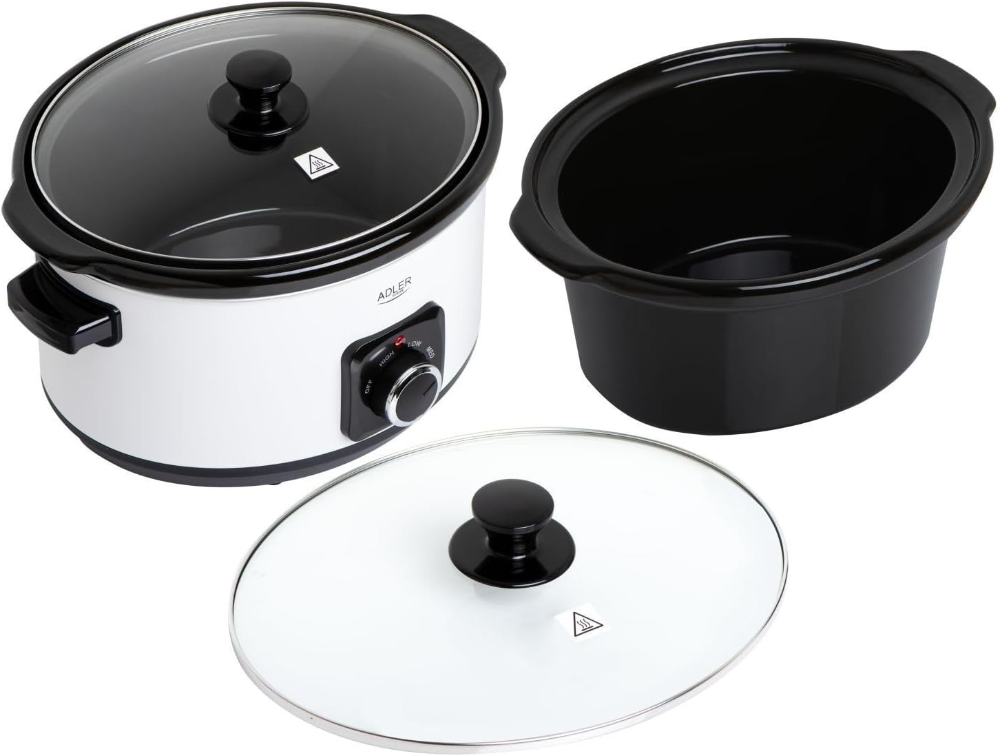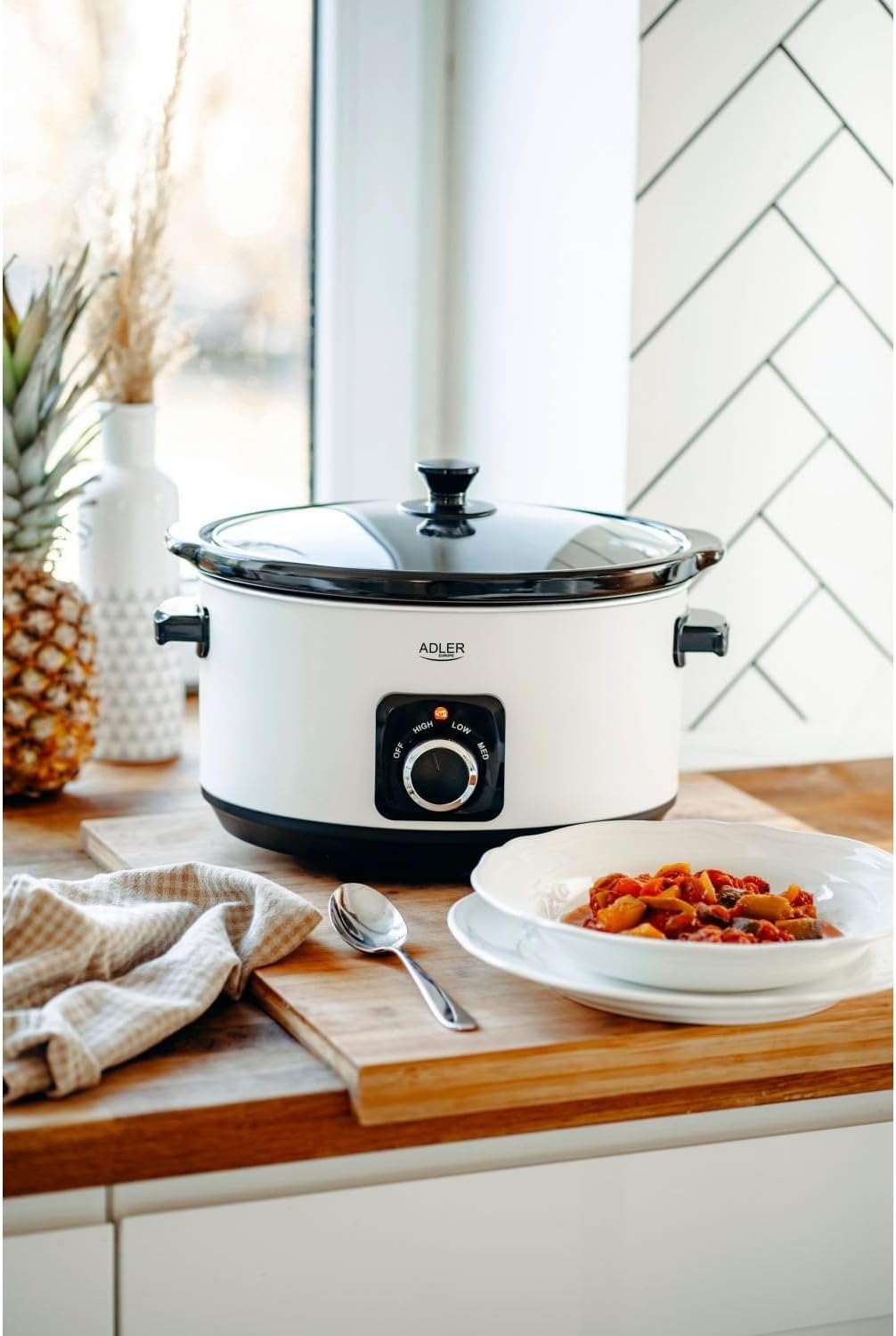 A slow cooker is a device that cooks food at a lower temperature than conventional cooking. The slow cooker 6413r from ADLER is the perfect solution for anyone who wants to preserve the taste and health benefits of their dishes while cooking. Dishes prepared in the slow cooker are rich in trace elements and vitamins that are destroyed during conventional cooking at temperatures close to boiling point. The removable ceramic bowl is easy to clean. Its natural raw material does not change the taste of the food and guarantees even heat distribution and long storage in the container. Even when the device gets hot during operation, the cool touch handles allow for comfortable handling. The glass lid is made of safe tempered glass, making it easier to monitor the cooking process without having to open the bowl. The bowl volume of 5.8 litres allows you to prepare a stew dish for a large family or for 2 days. The device has 3 cooking temperature levels: low, medium and high, which you can adjust to the type of food you prepare. From practice: Bigos cooked in a slow cooker - cooked in low mode for 10 hours - tastes like Grandma's Bigos, prepared for several days by alternating cooking and cooling. For preparing meat dishes, goulash, meatballs, the device works well in low mode and for 8 hours. Pasta dishes (spaghetti bolognese) taste delicious when the slow cooker is set to high mode for 4 hours. Soups and broths will surprise you with the depth of taste after 6 hours of cooking in HIGH mode. Bowl and lid are dishwasher safe.