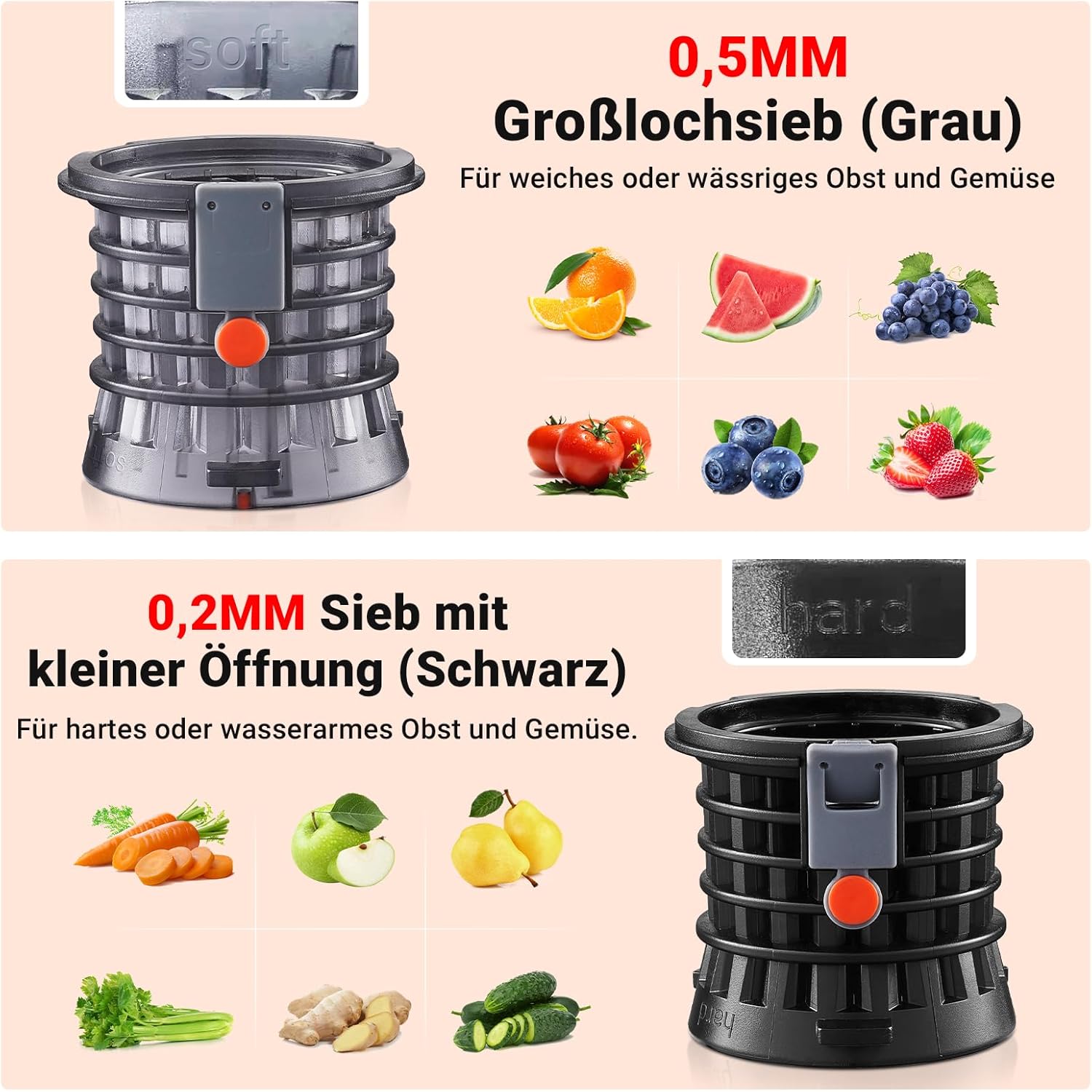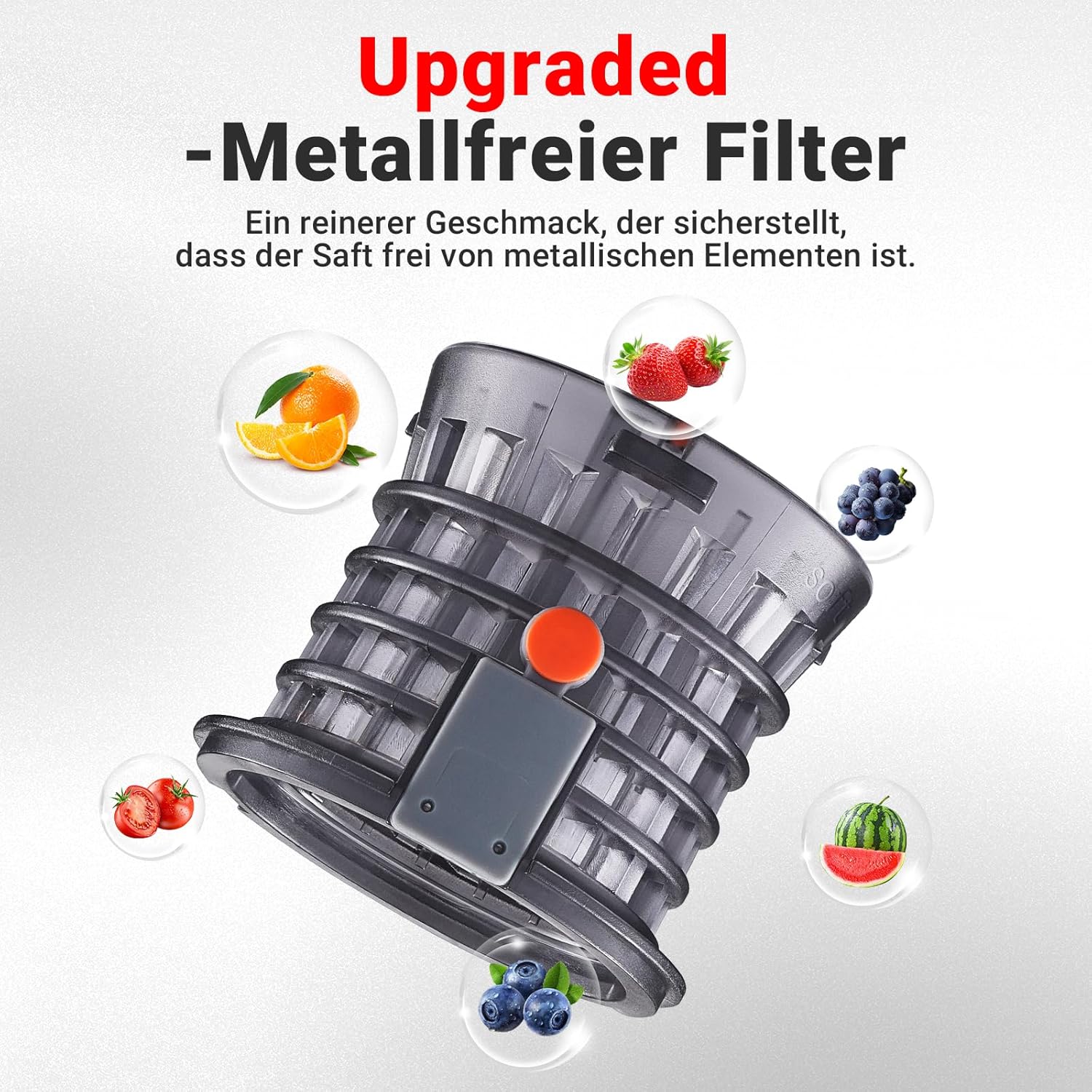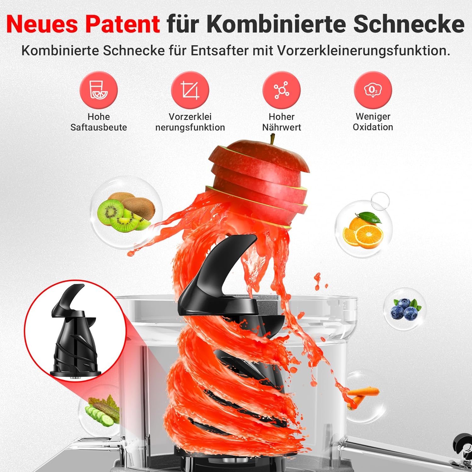 • Нов дизайн на спирална дюза: с 8-степенна спирална технология, комбинирана с уникален дизайн на зъбите на свредлото, тази сокоизстисквачка, победител в теста за зеленчуци и плодове, има функция за предварително рязане и дъвчене.