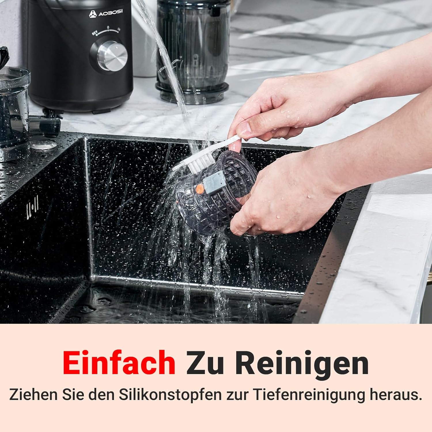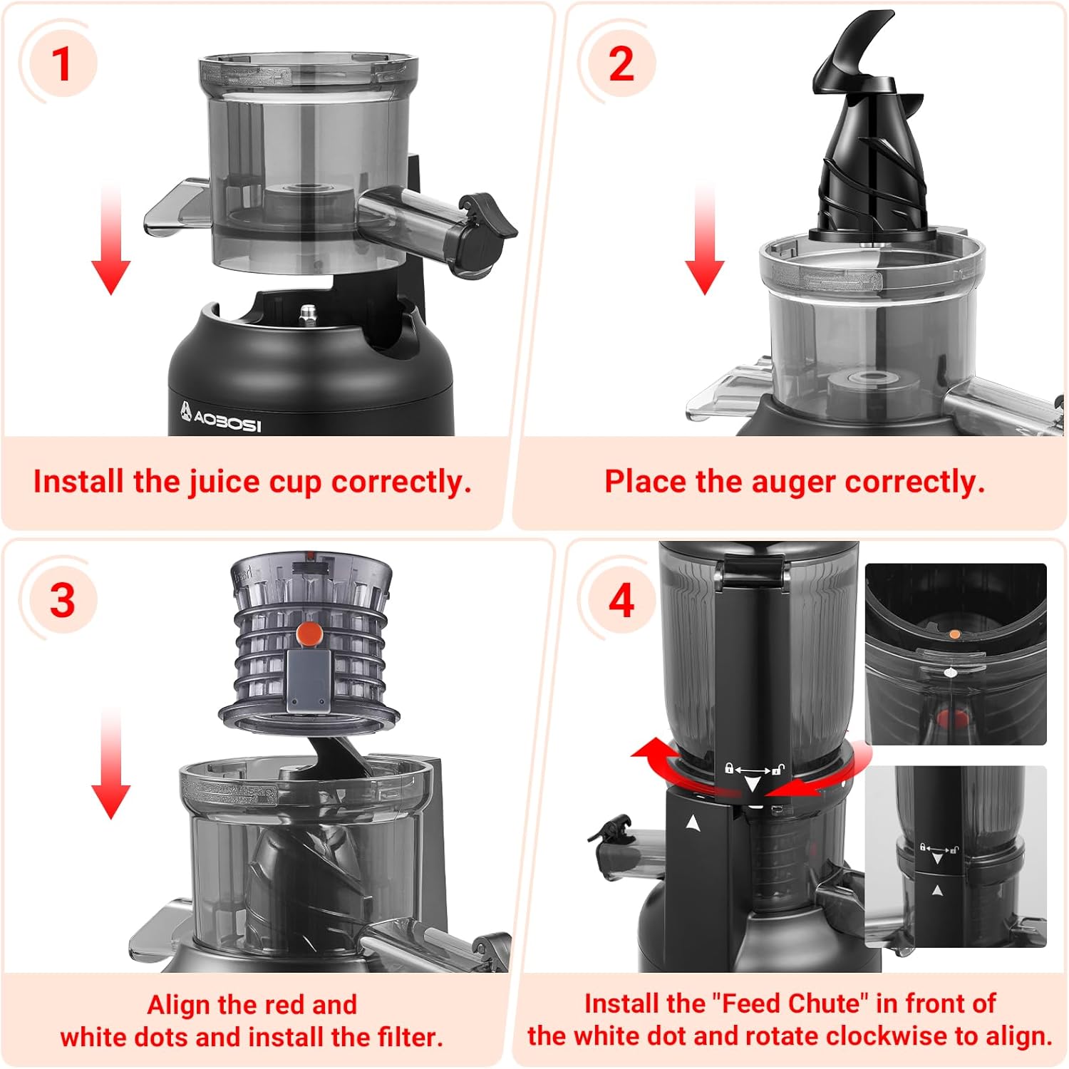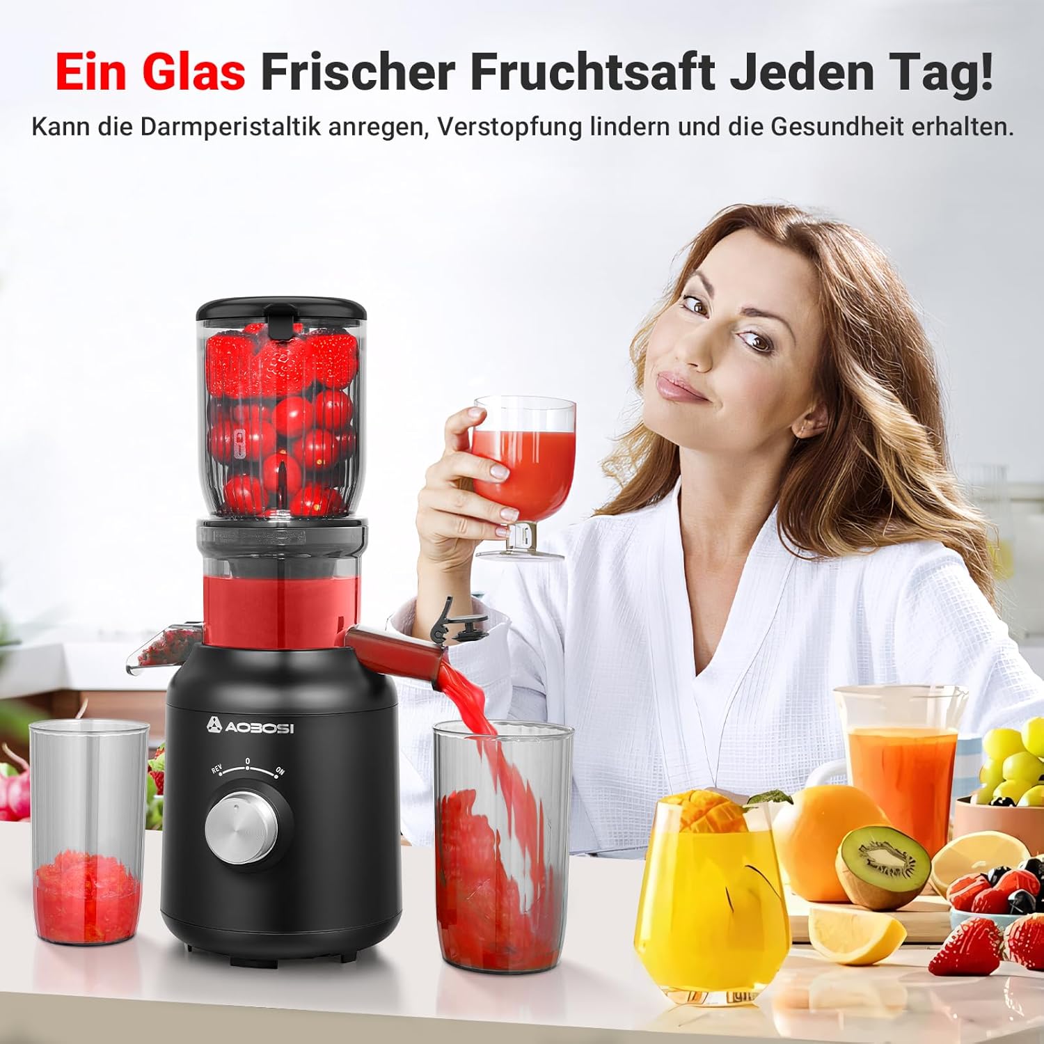 Бавна сокоизстисквачка - AOBOSI 250 W, победител в теста за зеленчуци и плодове, с отвор за пълнене 103 мм и 2 филтъра без метал, електрическа сокоизстисквачка с обем 1,2 л и 2 патента, черна