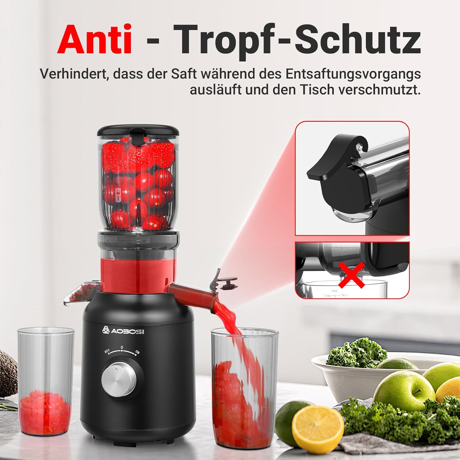 • Дизайн против прокапване: дизайн против прокапване за тази електрическа сокоизстисквачка. Предотвратява изтичането на сок и оцветяването на масата по време на процеса на изцеждане.