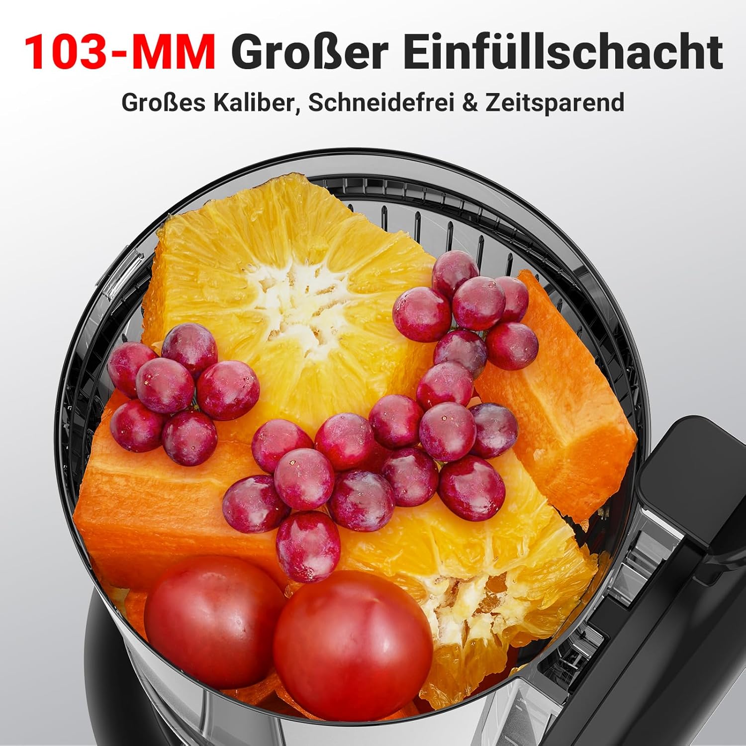 • Сокоизстисквачка с голям капацитет: калибърът 103 мм и капацитетът 1,2 л ви позволяват да изцедите повече зеленчуци и плодове.