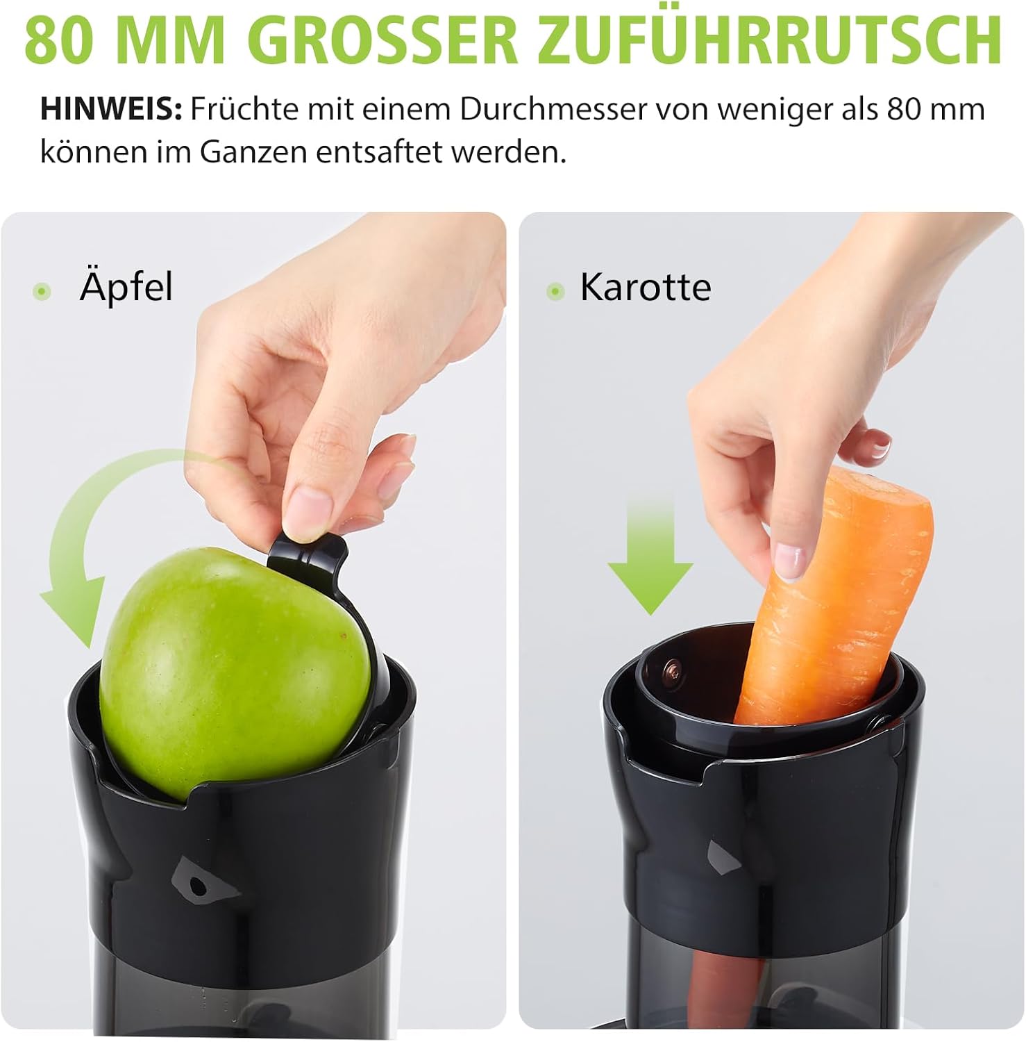 • Безопасна сокоизстисквачка: За безопасна употреба, инженерите на AOBOSI са оборудвали тази сокоизстисквачка с „обратим“ капак, който улеснява храненето и предотвратява случайно нараняване на деца и вашите ръце, което я прави по-безопасна и по-щадяща. Тази бавна сокоизстисквачка AOBOSI има голям отвор за пълнене с диаметър 80 мм, така че не е нужно да губите време в рязане на плодове и зеленчуци на много малки парченца преди изцеждане, което съкращава времето за изцеждане.