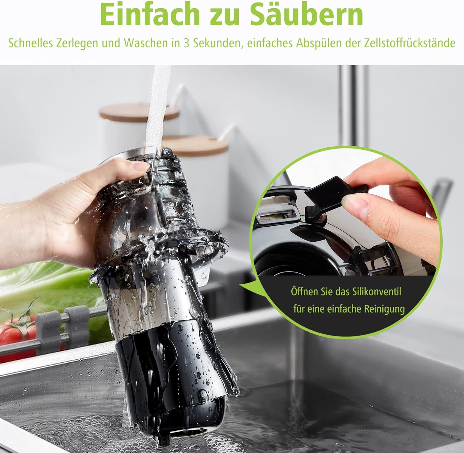 • Почистване и запушване: Победителят в теста за плодове и зеленчуци на AOBOSI, дизайнът с разглобяване с едно докосване елиминира проблема със сложното разглобяване, а иновативният дизайн променя проблема с трудното почистване в индустрията. Ако сокоизстисквачката за зеленчуци и плодове е запушена с твърде много плодове и зеленчуци, можете да използвате бутона REV, за да промените посоката на въртене и да се сбогувате с проблемите със запушването.