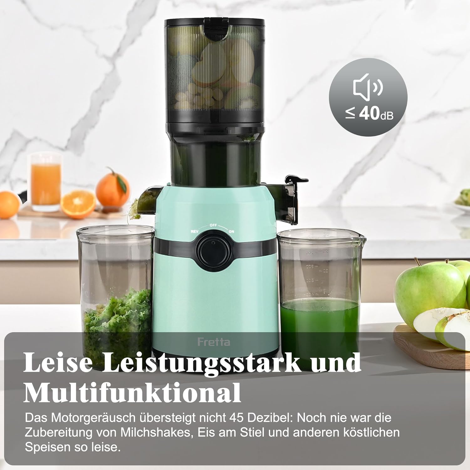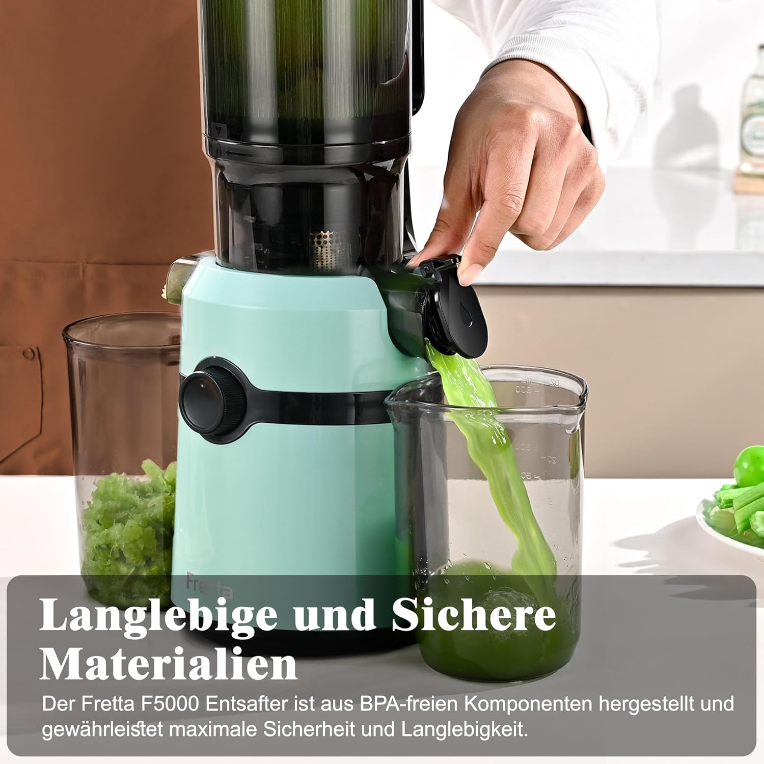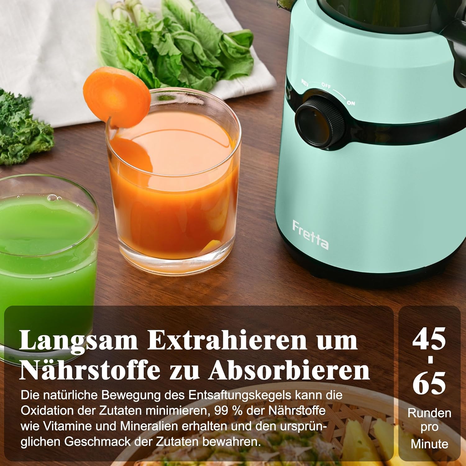 • ТЕХНОЛОГИЯ ЗА СТУДЕНО ПРЕСОВАНЕ И ТРОЙНА ФИЛТЪРНА СИСТЕМА Fretta използва най-съвременна технология за студено пресоване с подобрен шнек и троен филтър, за да увеличи максимално хранителните вещества, да сведе до минимум окисляването и пяната.