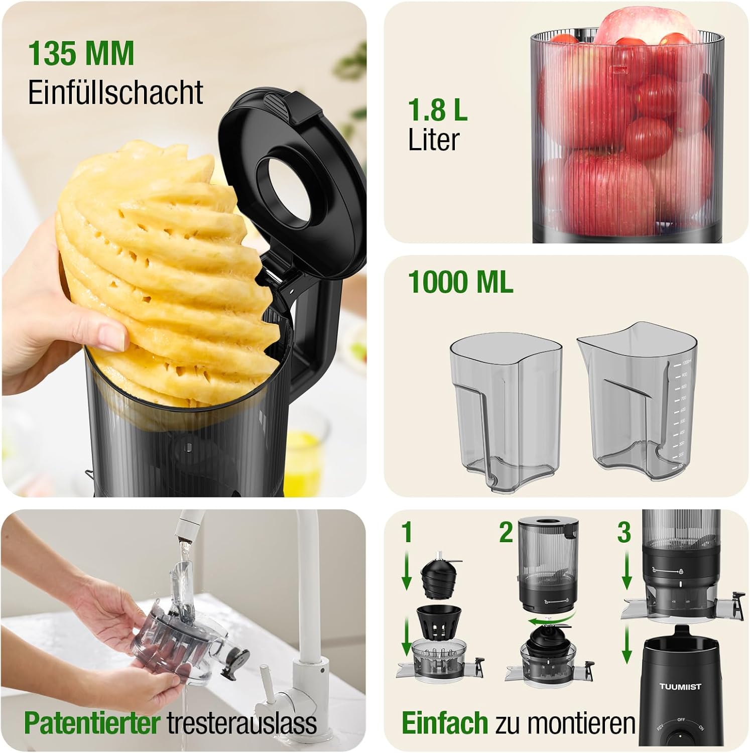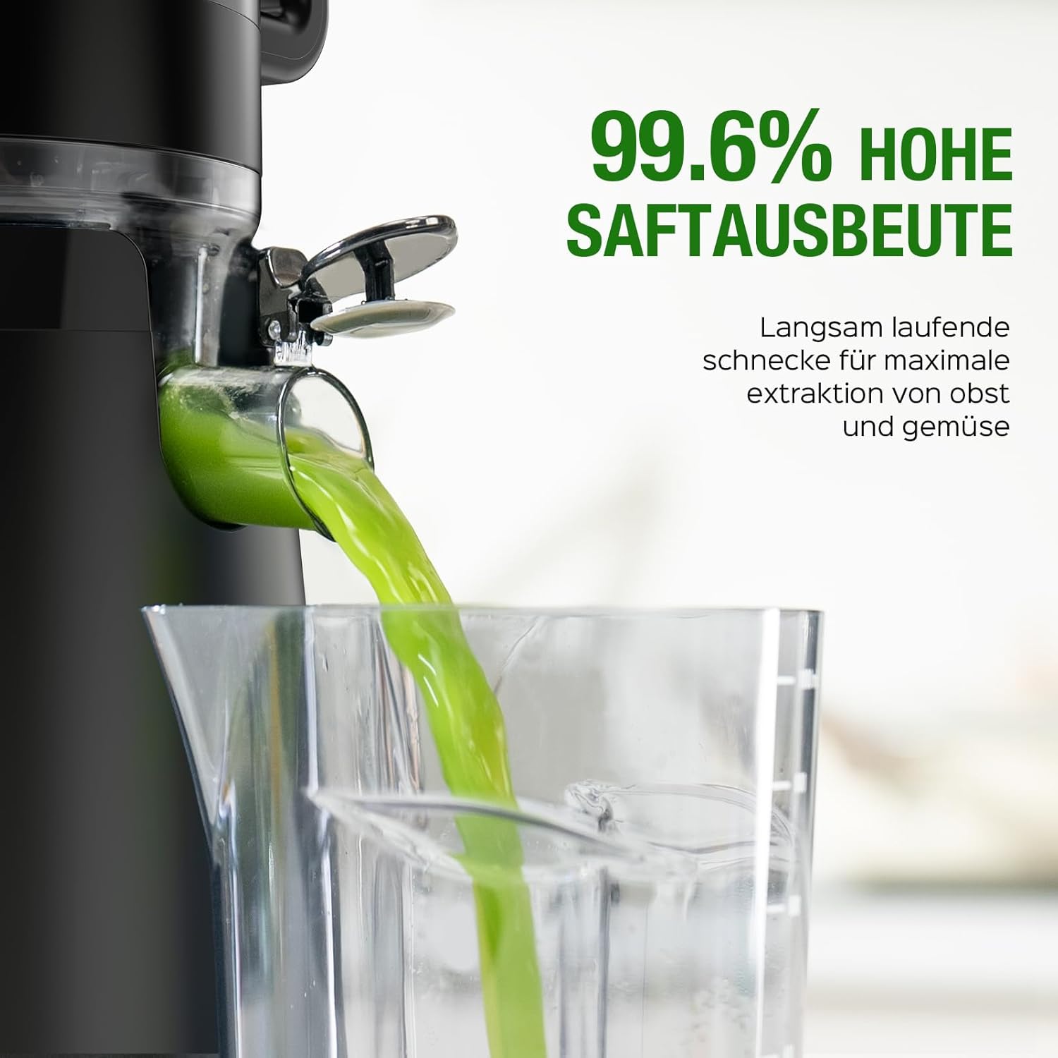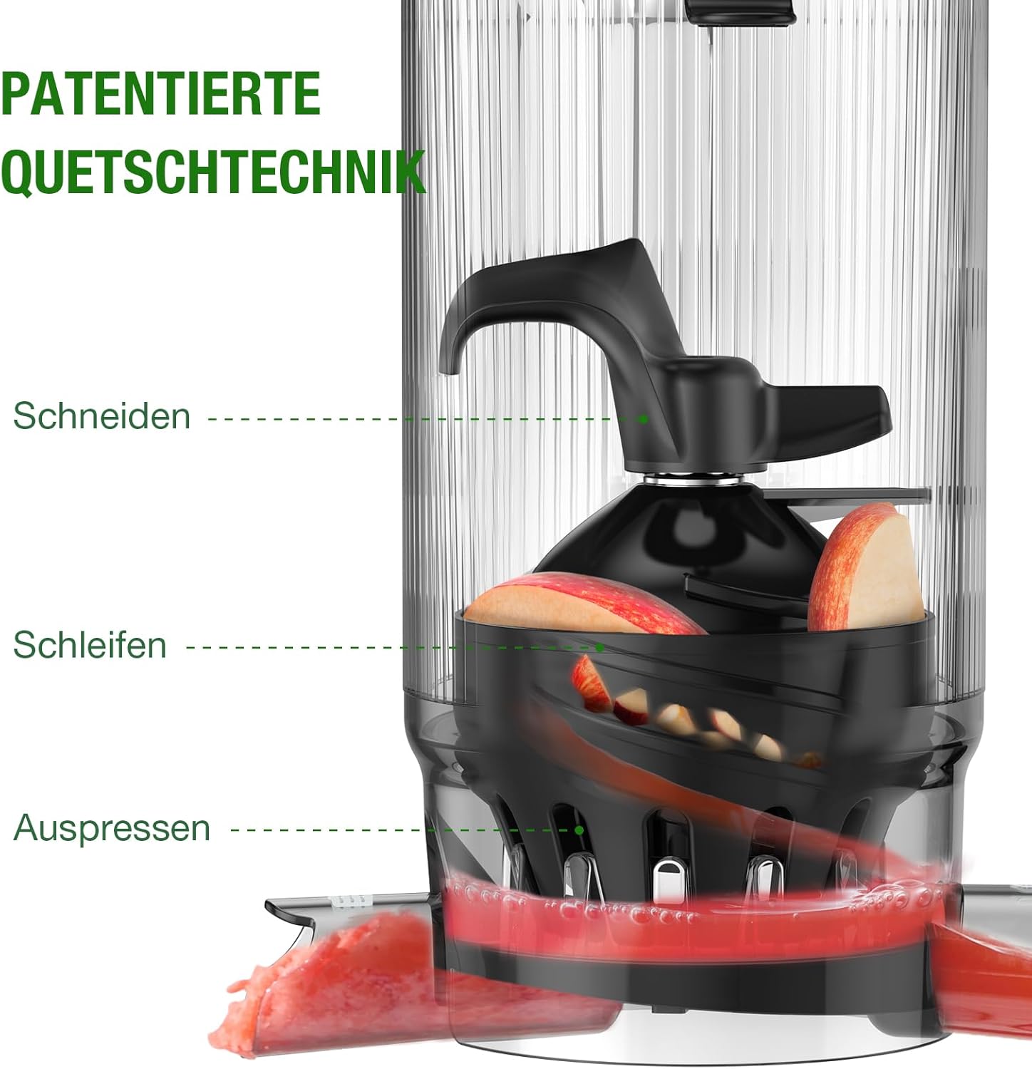 Бавна сокоизстисквачка с екстра голям отвор за пълнене 135 мм, победител в теста за сокоизстисквачка за зеленчуци и плодове, подходяща за цели плодове и зеленчуци, лесна за почистване, висок добив на сок, без BPA