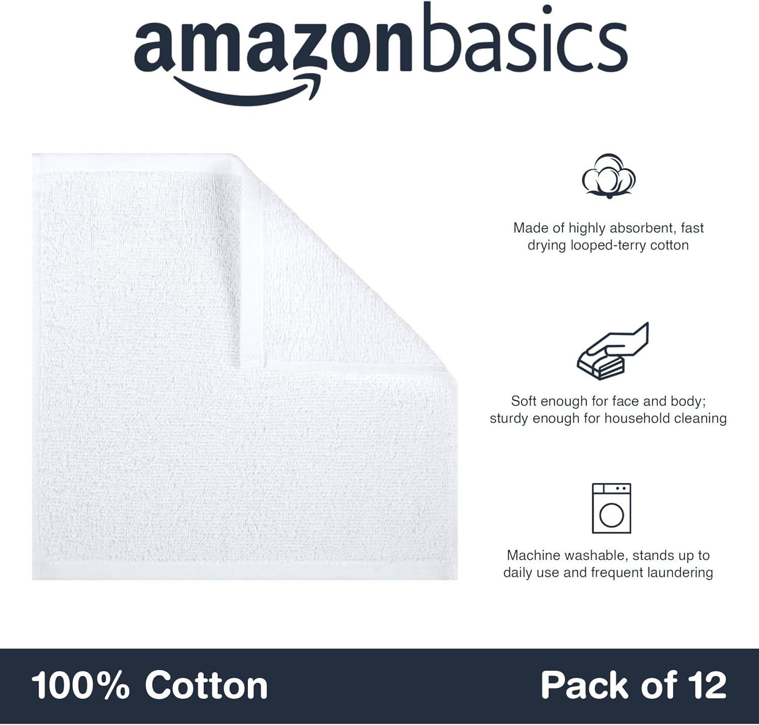 Памучните кърпички за лице AmazonBasics са перфектна комбинация от меки, но издръжливи материали, което ги прави идеални както за нежно почистване на лицето, така и за почистване на домакинството. Този пакет от 12 броя може да се раздели - можете да поставите някои в закачалката за кърпи в банята, други в детската стая, няколко в чекмеджето на кухнята или под мивката, както и един чифт в спортната си чанта.