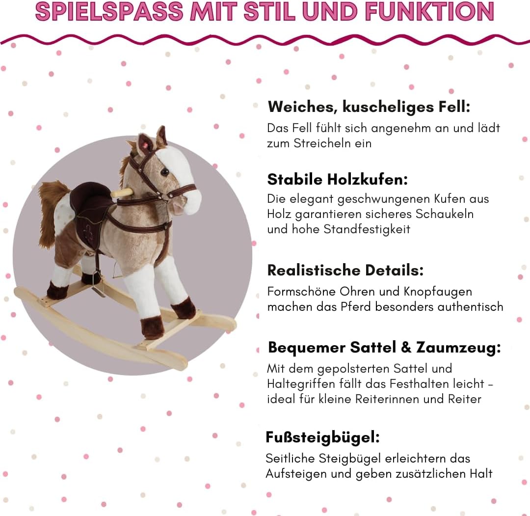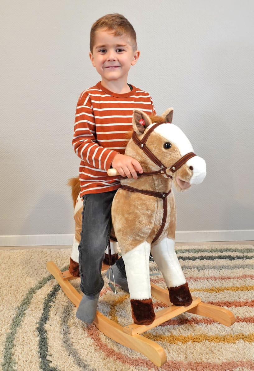 Този люлеещ се кон бързо ще се превърне в най-добрия приятел на вашето дете. Независимо дали е каубой, рицар или принцеса – всяко въображаемо приключение започва на мекия му плюшен гръб. С всяка скала детето ви игриво развива сила, двигателни умения и самочувствие. В същото време висококачествените материали и здравата конструкция на коня предлагат максимална безопасност.