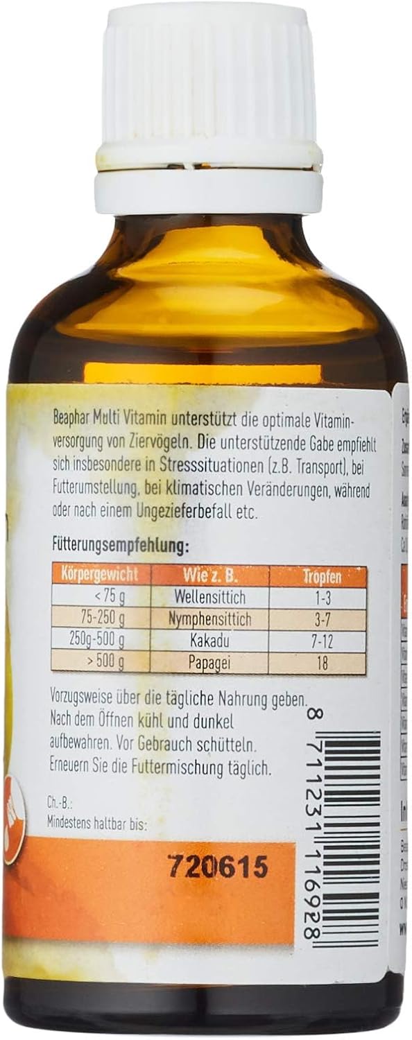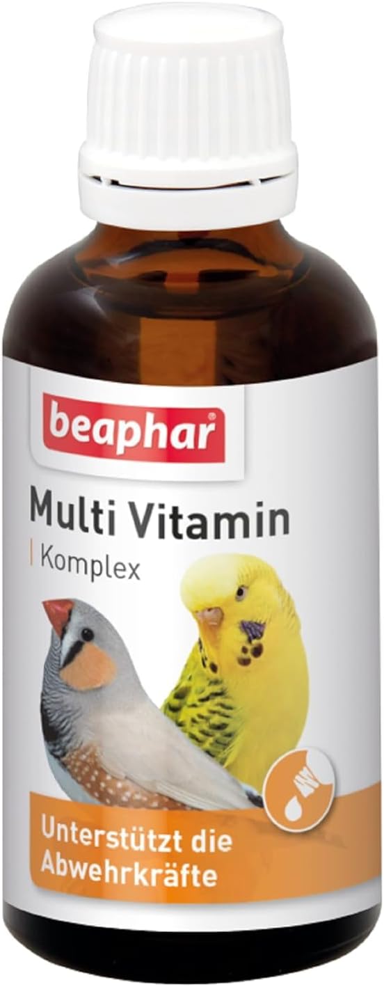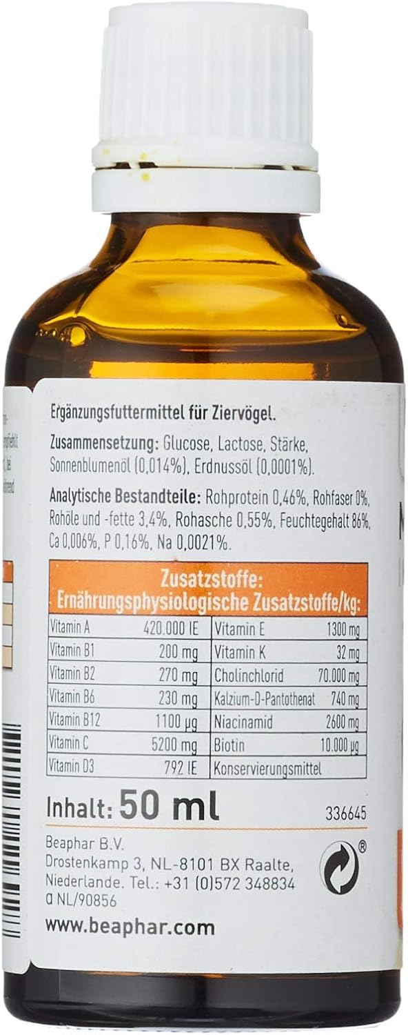 Мултивитаминен комплекс Beaphar укрепва съпротивителните сили на птицата и подкрепя организма ѝ в стресови ситуации, като например на изложби или по време на размножителния период. Винка противодейства на загубата на жизненост, която може да възникне например при небалансирано хранене. Инструкции за хранене: Добавете капките към дневната храна. Разклатете преди употреба. Подновявайте фуражната смес ежедневно.