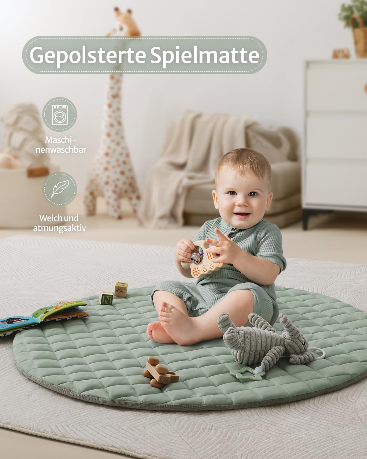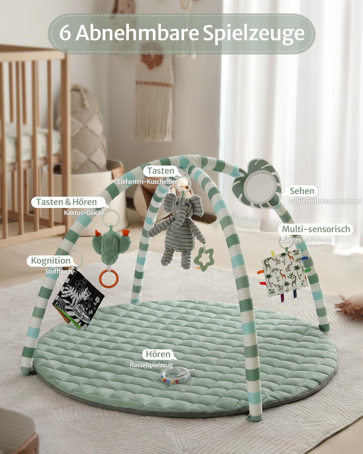 Бебешка арка за игра Blissful Diary, постелка за упражнения за бебешка гимнастика с 6 подвижни играчки, постелка за пълзене, лесна за инсталиране и почистване, основен подарък за бебе, салвиево зелено