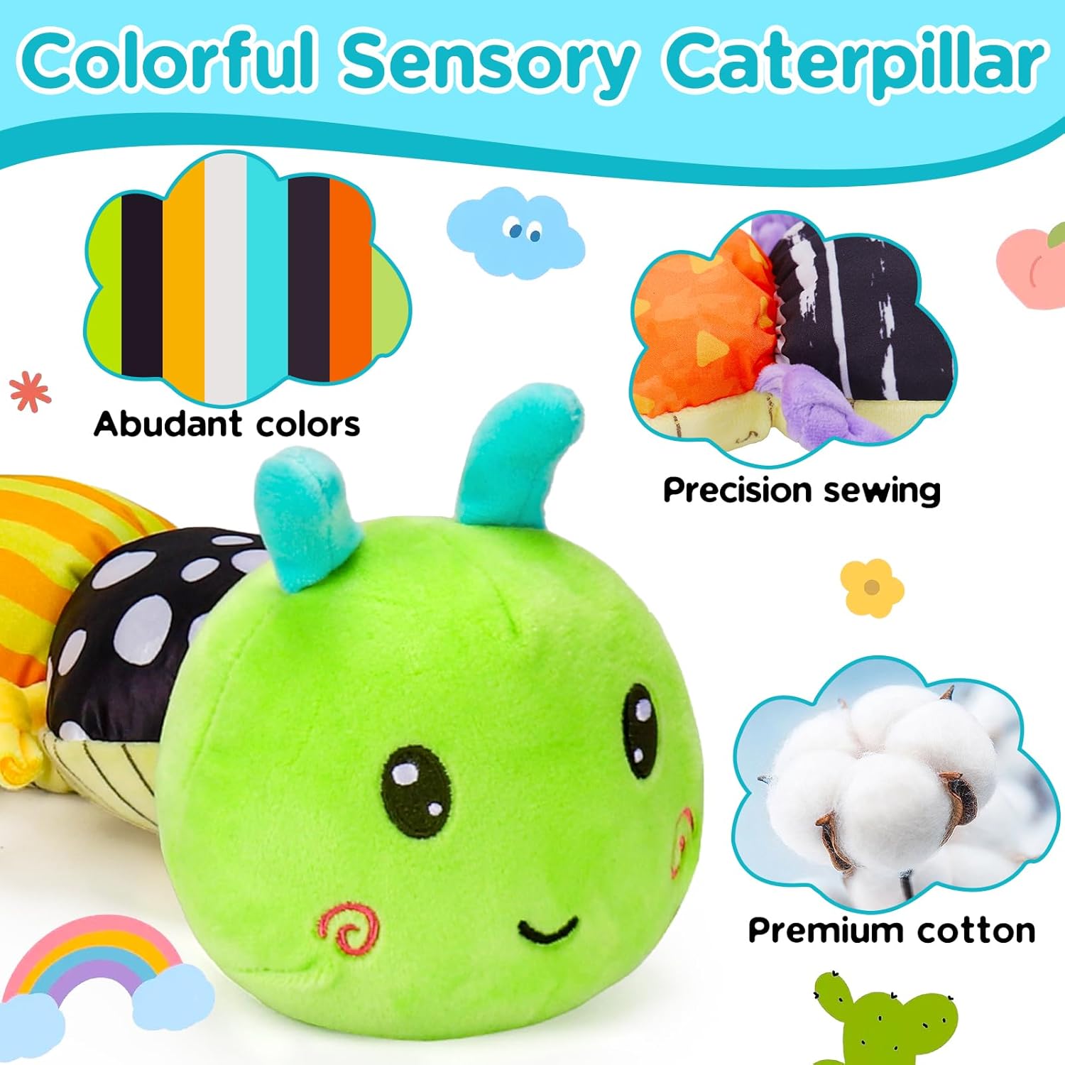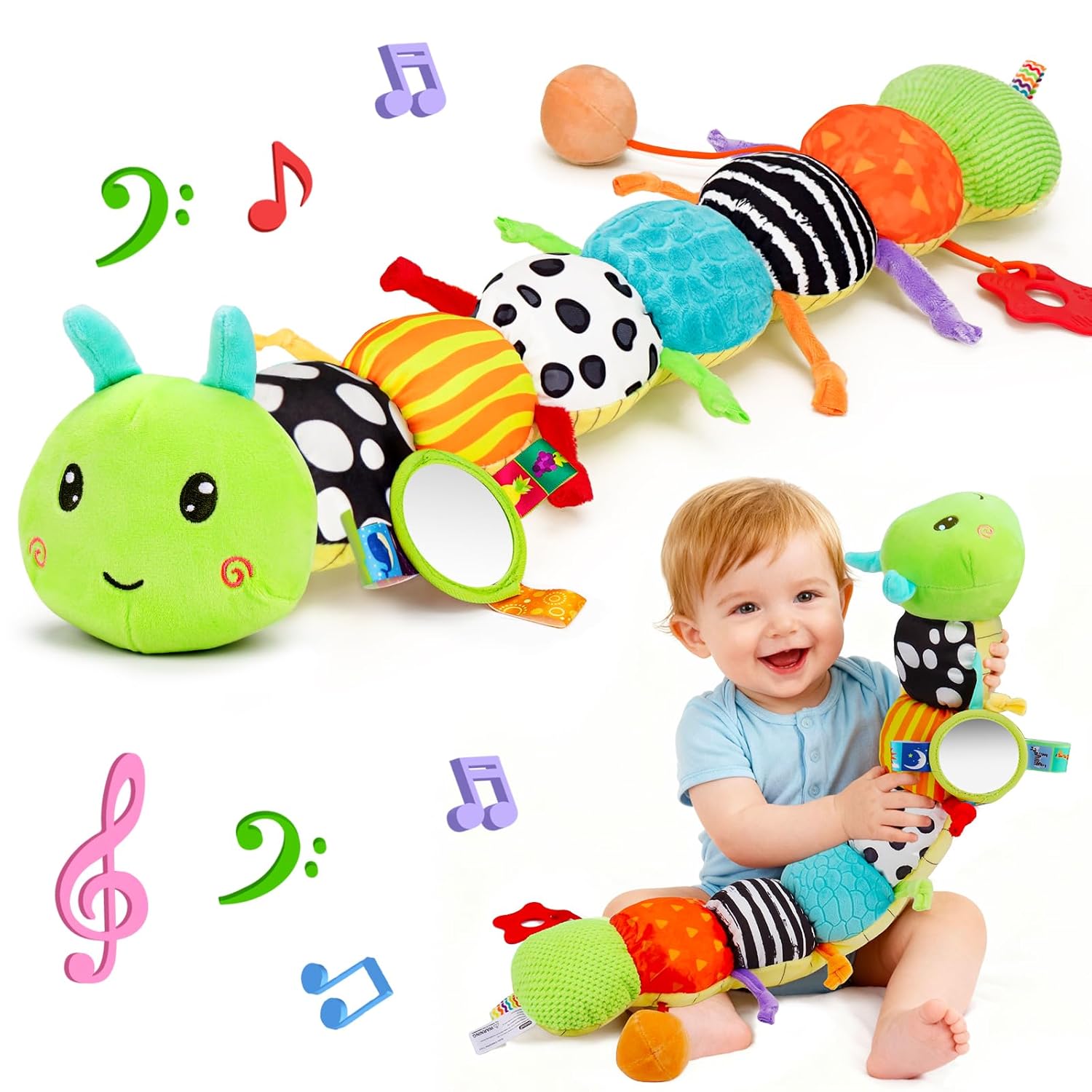 • 【Бебешка играчка 0-3-6 месеца】- Нашата бебешка играчка за новородени (0-3-6-12 месеца) разполага с музикална функция, пухкав дизайн на гъсеница, инструмент за измерване на размера на бебето, звуков ефект на гънки и играчка огледало. Вашето мъниче ще обича да си играе с тази музикална бебешка играчка (0-6-6 месеца).
