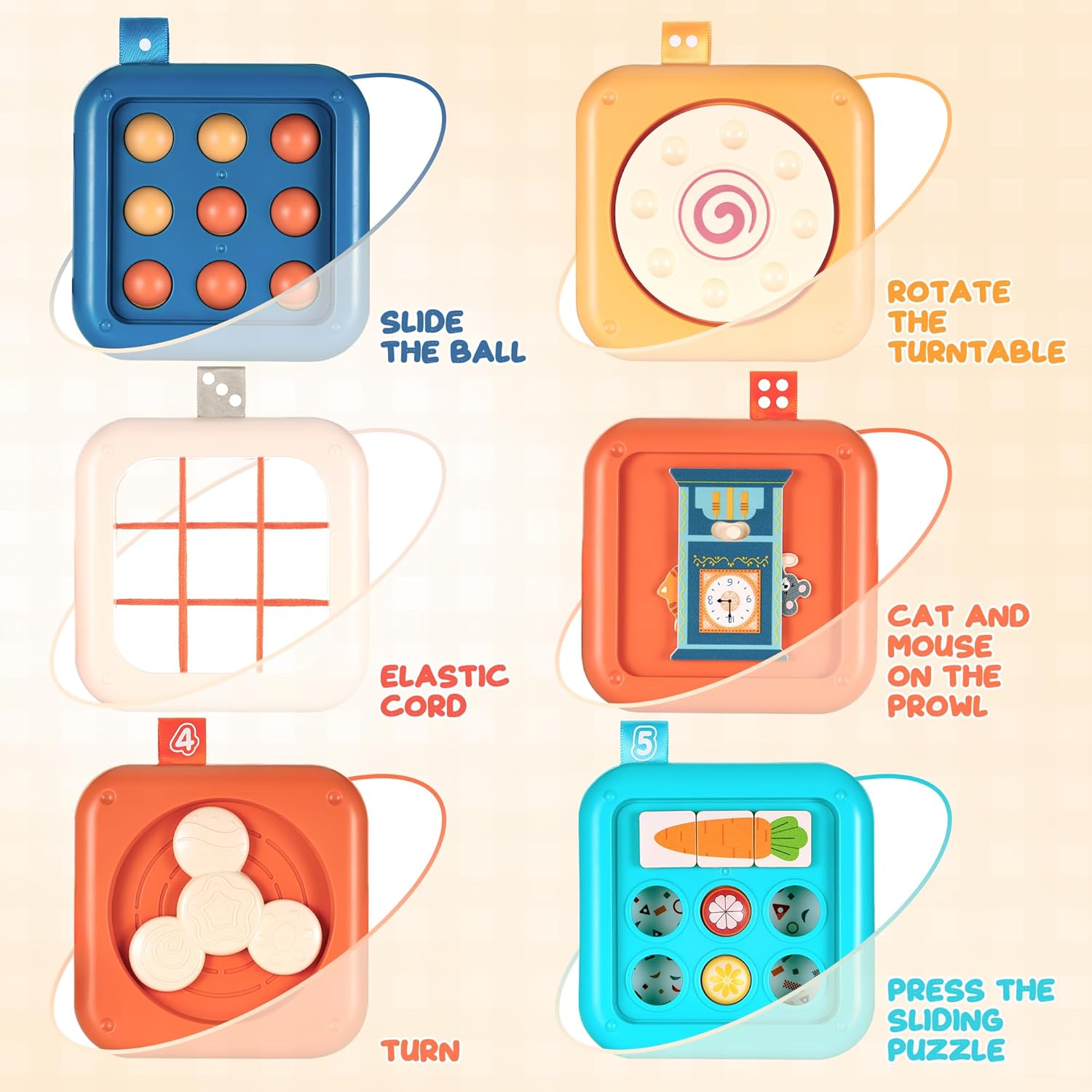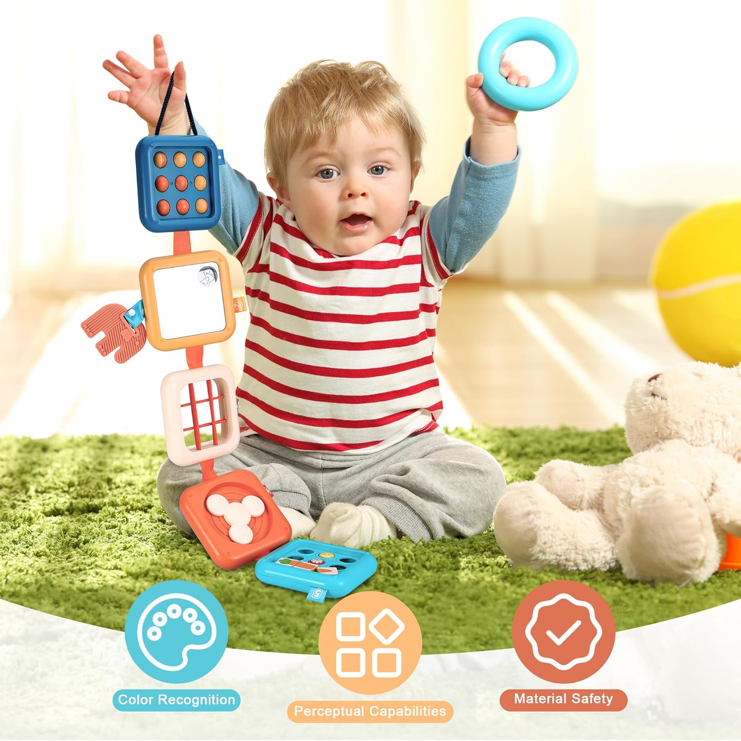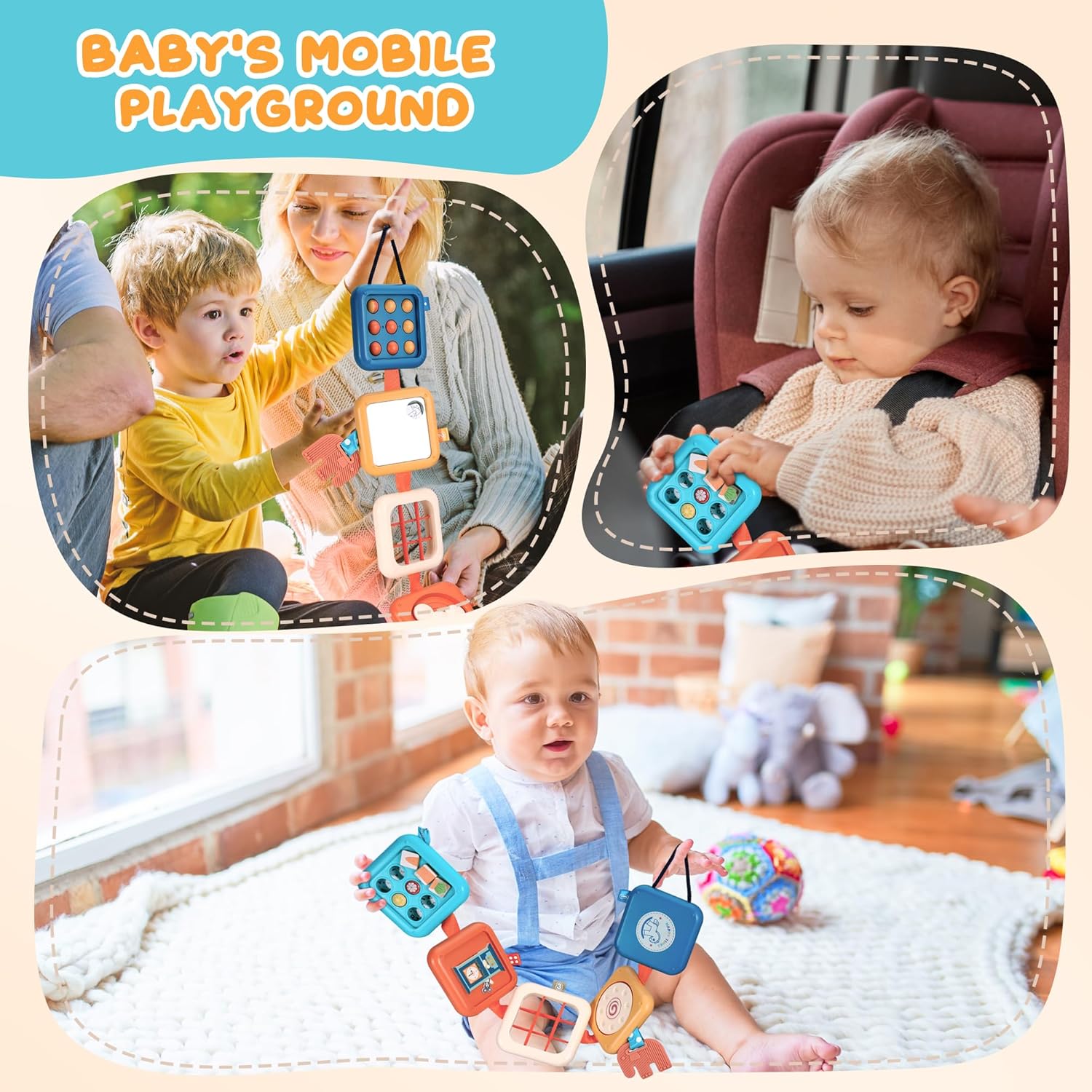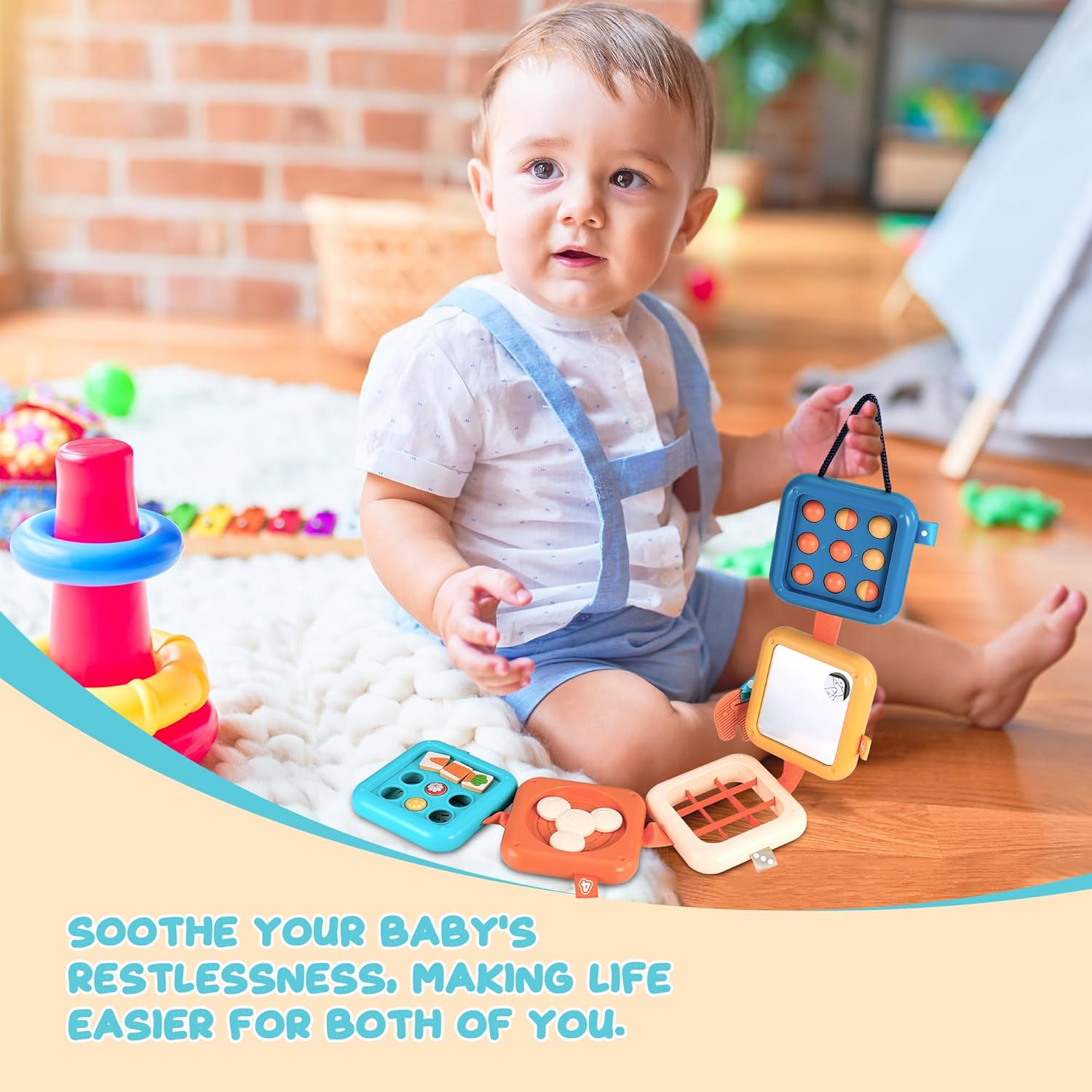 • 【Иновативна дъска за занимания: Насърчаване на разнообразни открития】 Нашата дъска за занимания е специално проектирана за малки деца на възраст от 1 до 3 години и съчетава осем вълнуващи сензорни занимания: включително забавно огледало, скрит часовник, пъзел с моркови, две въртящи се зъбни колела и еластичен шнур. Тя насърчава малките да развиват своите умения за наблюдение, концентрация и фина моторика чрез игра, което я прави идеална играчка за ранно когнитивно и сензорно развитие.