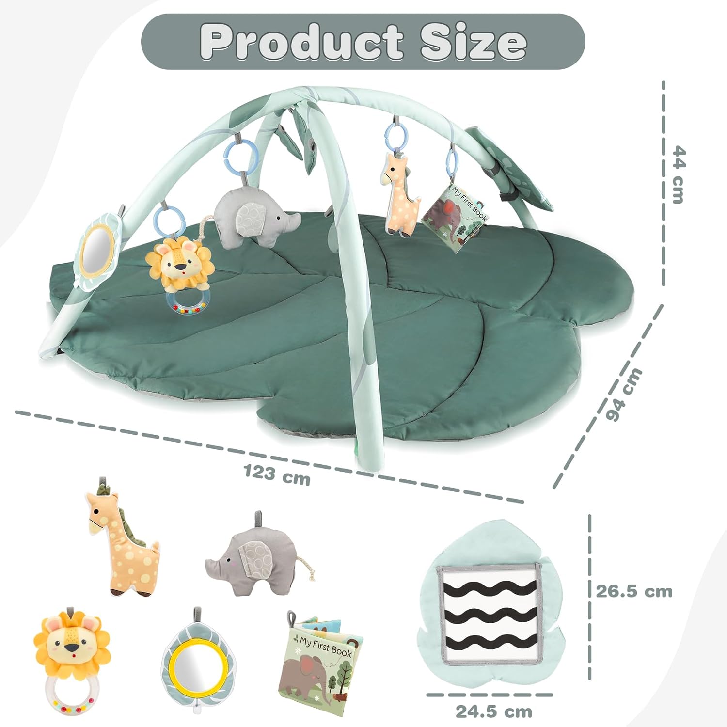 • [Бебешка подложка за игра на под] Тази подложка за игра с 6 подвижни сензорни играчки напълно отговаря на нуждите за развитие на бебето. 6-те играчки включват: огледало, безопасно за бебето, за себепознание; сензорна играчка слон за докосване; пищяща играчка жираф; тактилна дрънкалка лъв за слушане; черно-бели карти за виждане; и книжка от плат за изучаване на графики и цветове.