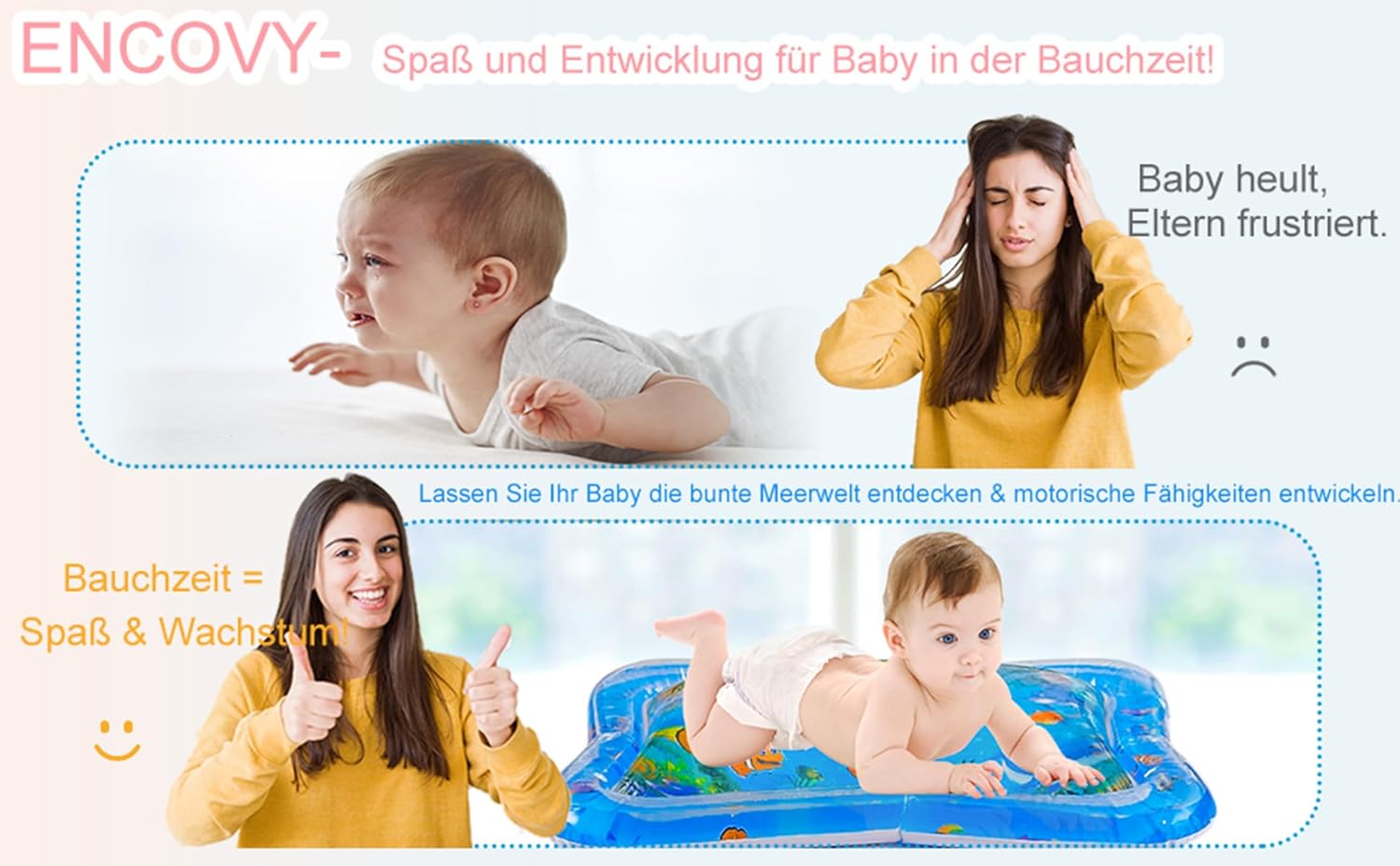 • Подкрепа за развитието – Водната постелка ENCOVY за бебета осигурява идеална среда за игриво учене. Цветните морски създания и забавният дизайн стимулират любопитството на вашето бебе, а чрез докосване и наблюдение на тези шарки, то може да подобри своите перцептивни умения и координация око-ръка.