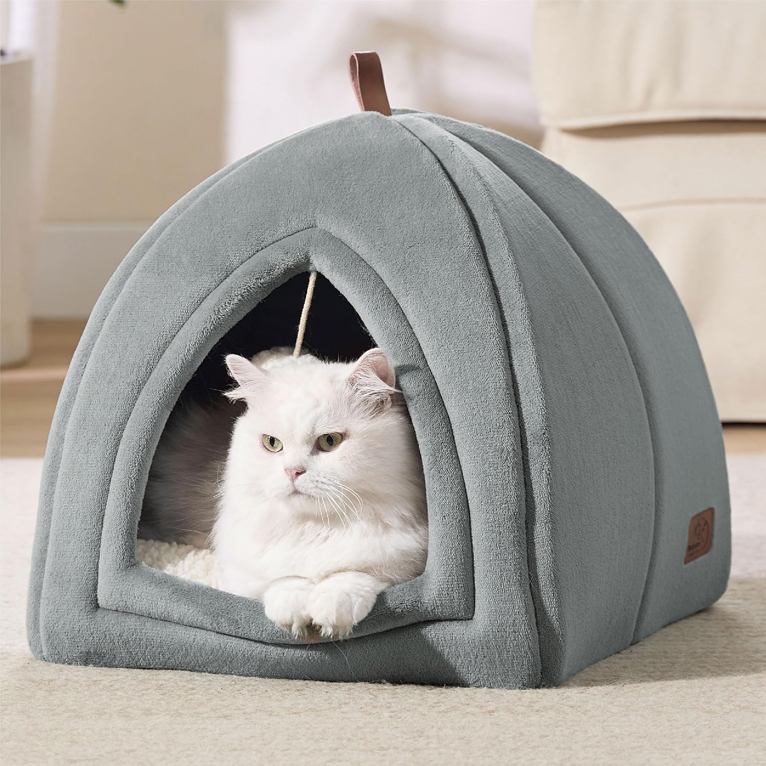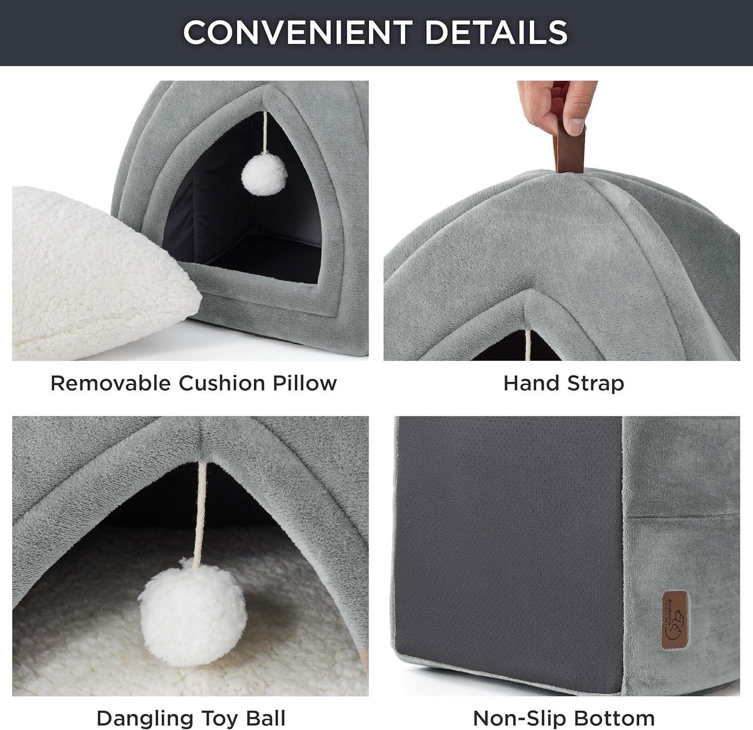 • Обмислени детайли Тази къщичка за котки е с неплъзгащ се под, който гарантира, че леглото ще остане на мястото си върху плочки или дървени подове и ще осигури стабилен дом за косматите им приятели.