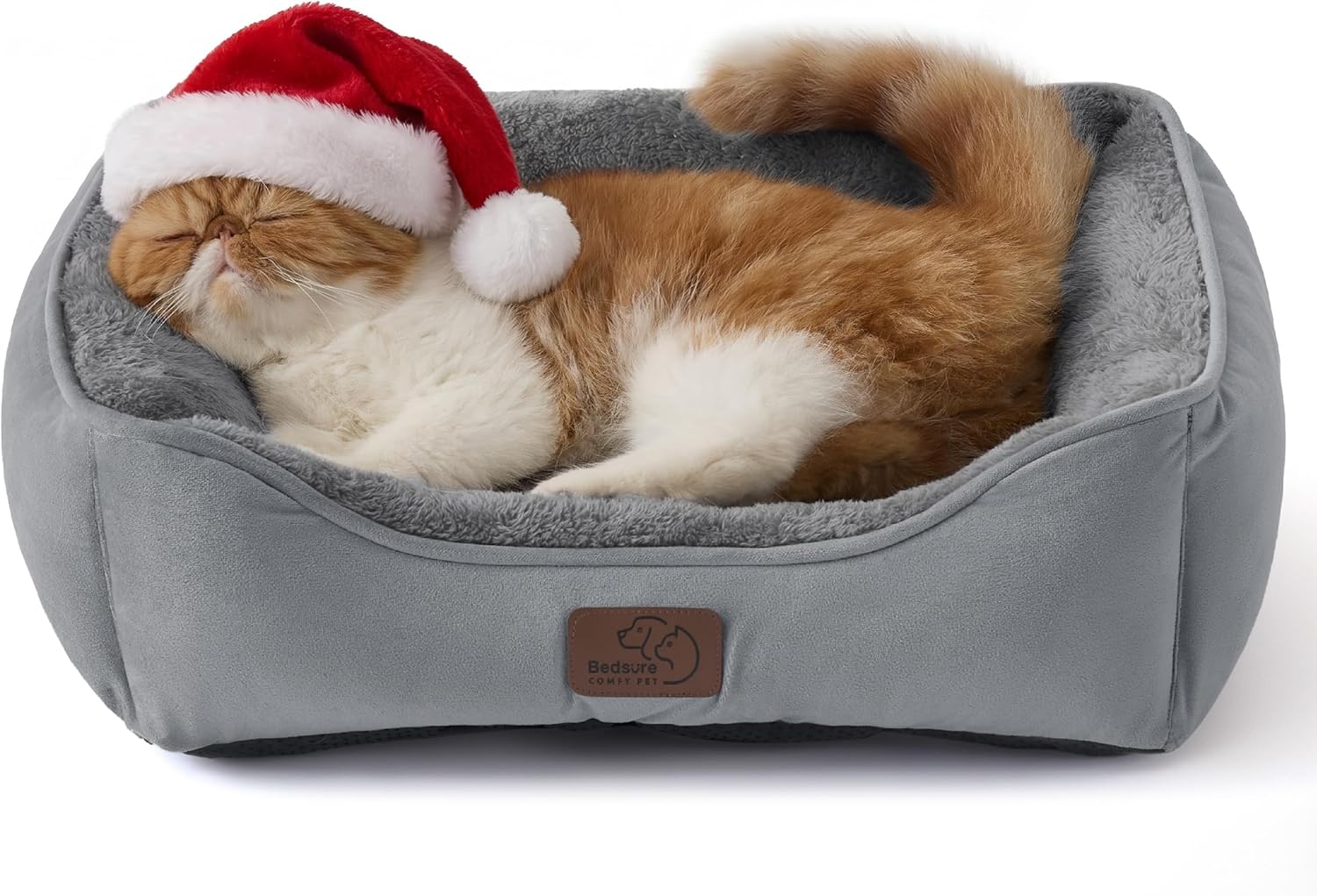 BEDSURE Легло за котки, което може да се пере - 51 x 41 см Кошница за котки за вътрешна употреба с неплъзгаща се основа, Квадратно легло за малки кучета с мек ръб, Сиво