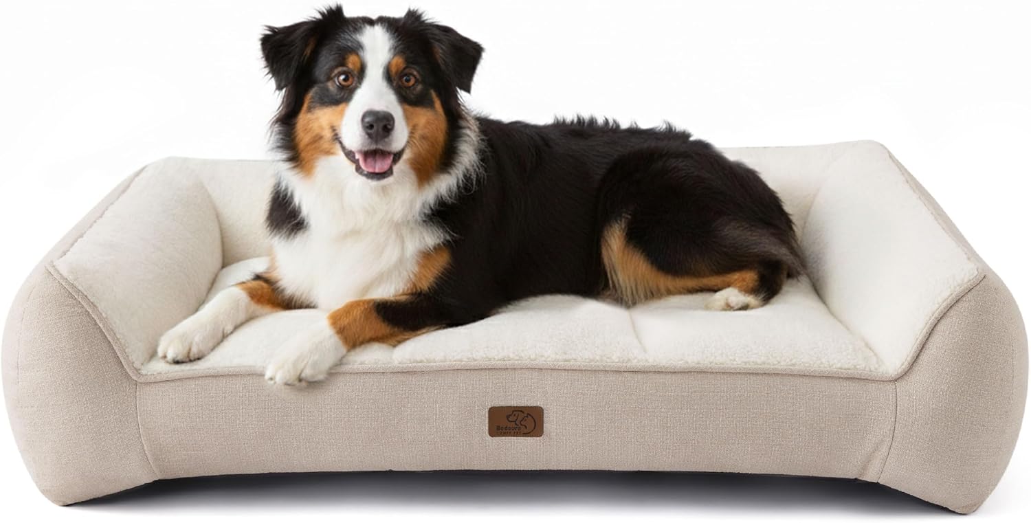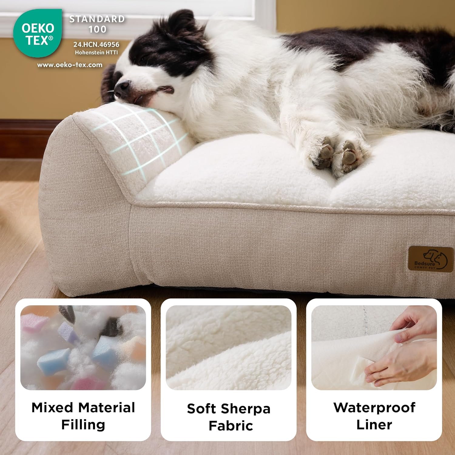 BEDSURE Легло за кучета, което може да се пере, за големи кучета - 106 x 76 см, изключително дебел, поддържащ диван за кучета с водоустойчив калъф, неплъзгаща се кошница за кучета, голяма, с мека плюшена шерпа, кремава