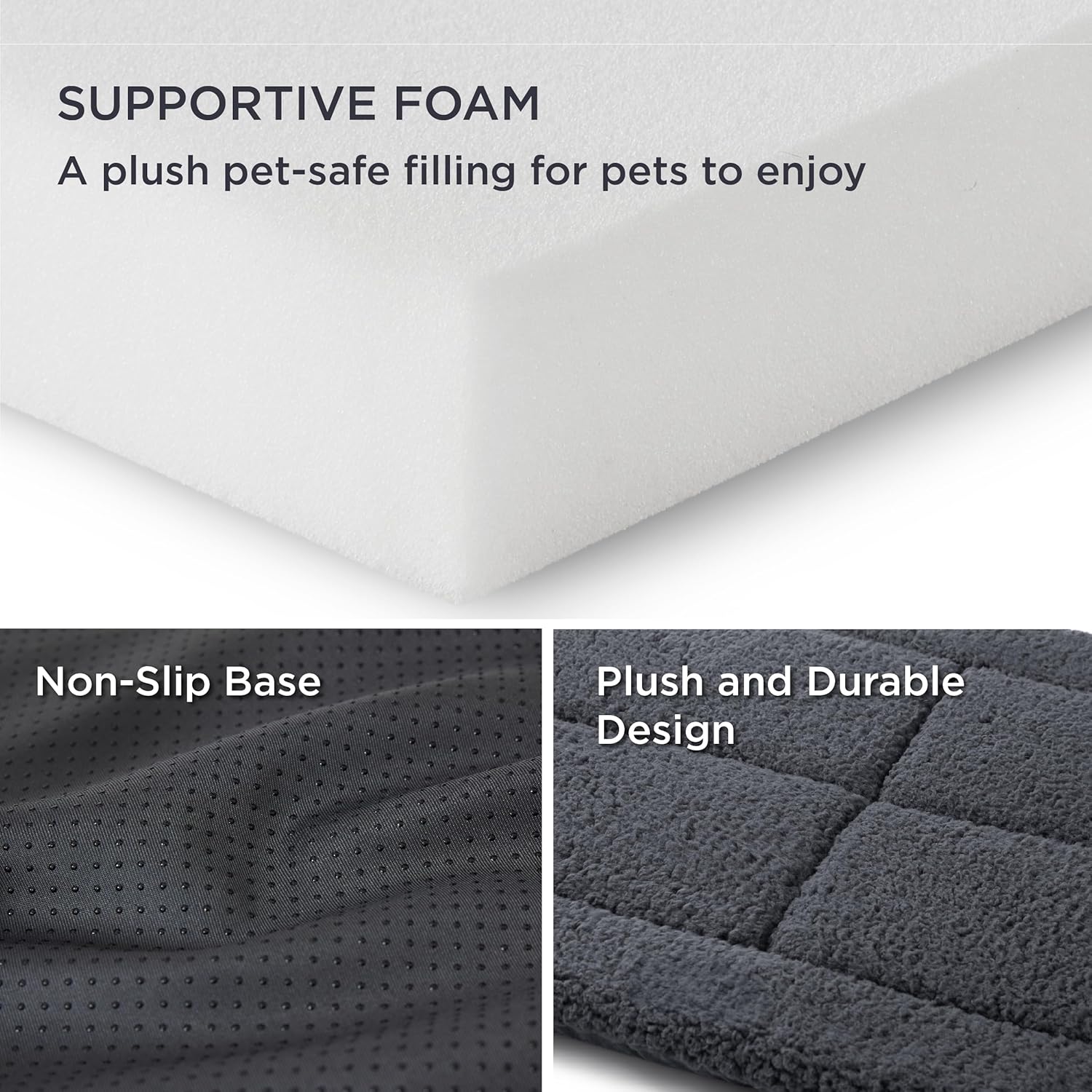 • ИЗКЛЮЧИТЕЛЕН КОМФОРТ ЗА ДОМАШНИ ЛЮБИМЦИ Подобрете релаксацията на вашия домашен любимец с подложката за домашни любимци Bedsure Fleece Foam. Изработена от ултра мек полар, тази подложка осигурява целогодишен комфорт. Неплъзгащата се основа добавя допълнителен слой сигурност, осигурява стабилно захващане на подложката, позволявайки на вашия домашен любимец да почива безопасно, без риск от подхлъзване.