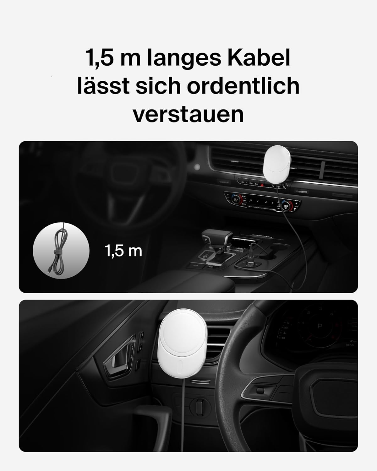 • Сигурен монтаж: Модулът MagSafe е особено здрав, за да позволи лесно поставяне в перфектно подравняване. Висококачественият държач се закрепва здраво към вентилационния отвор на автомобила и осигурява добро захващане дори в случай на удари.