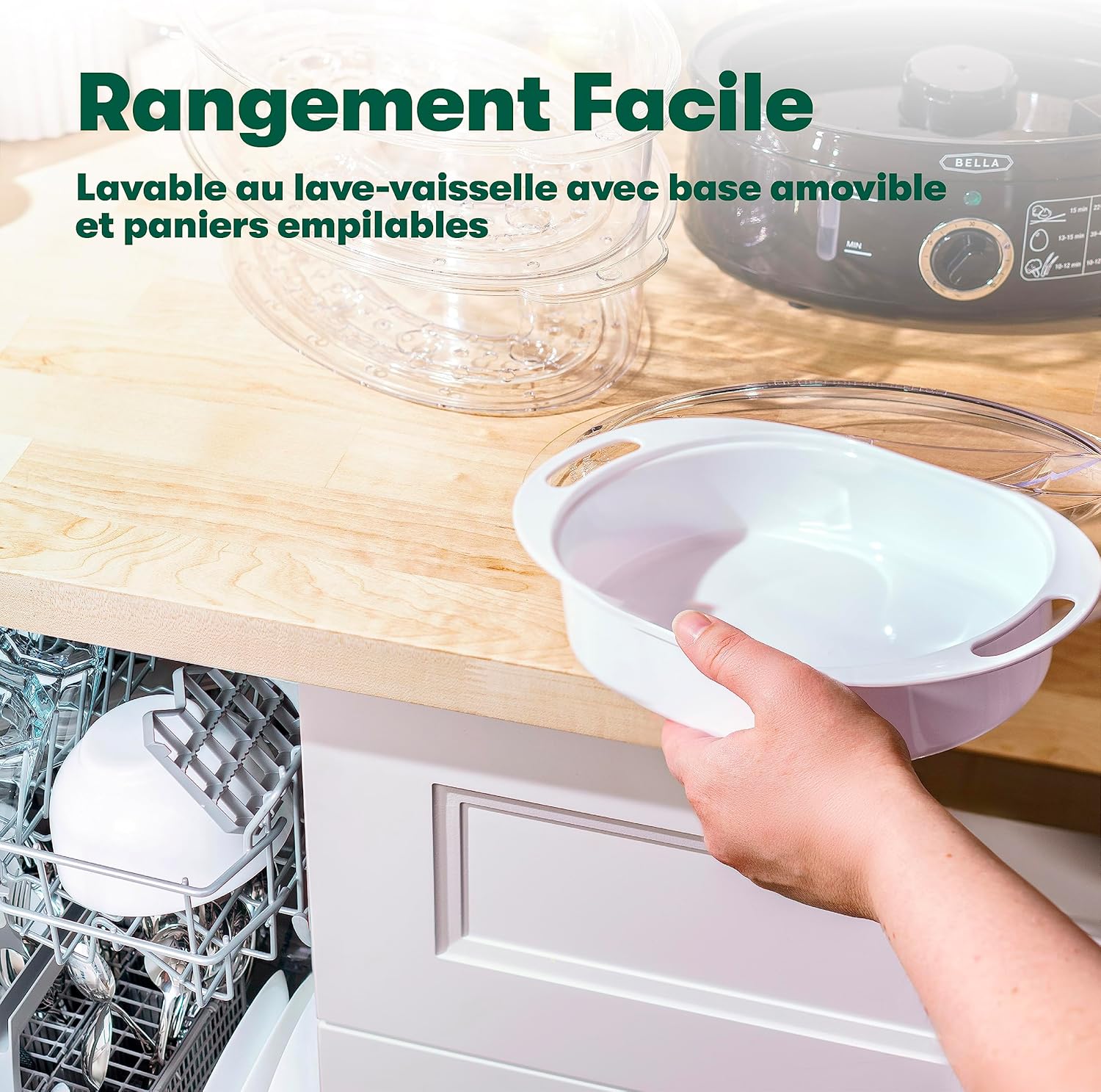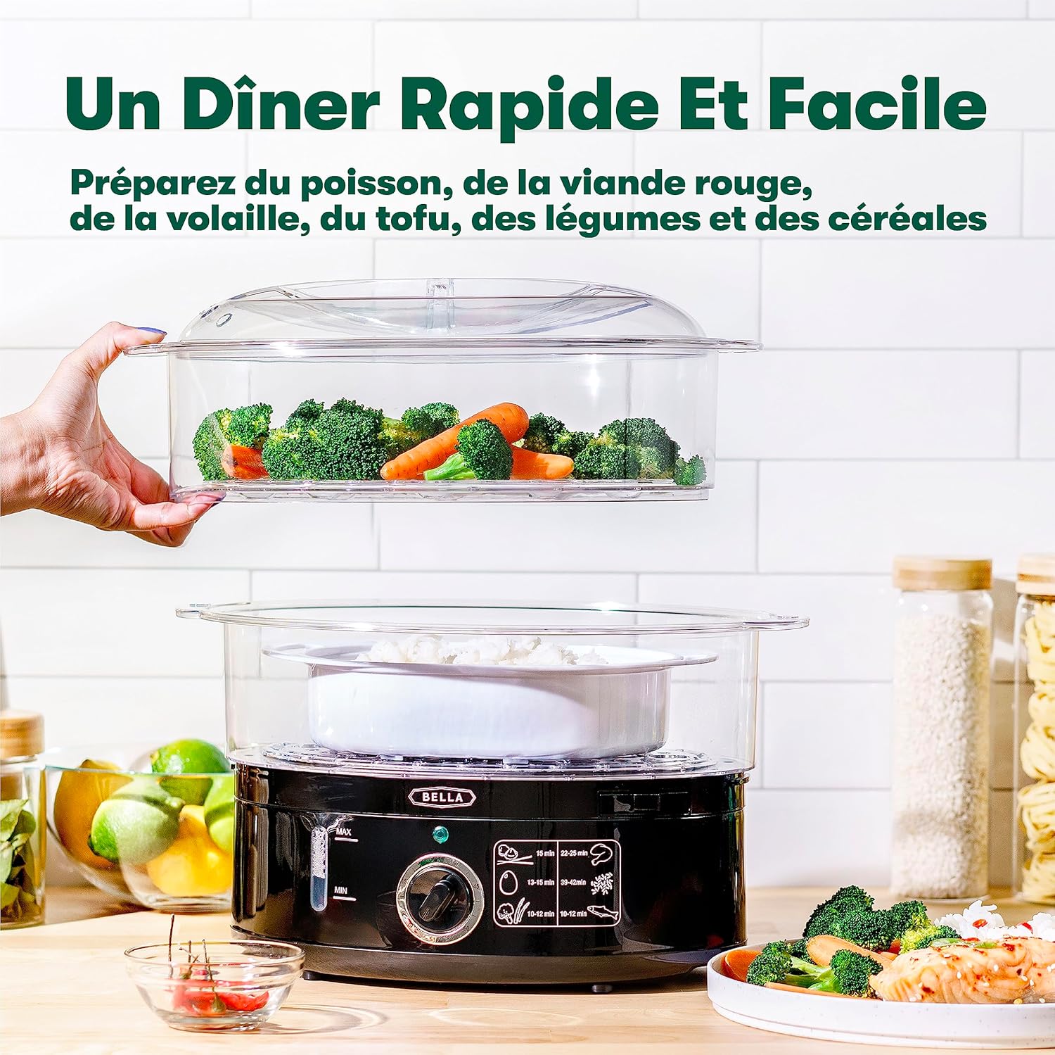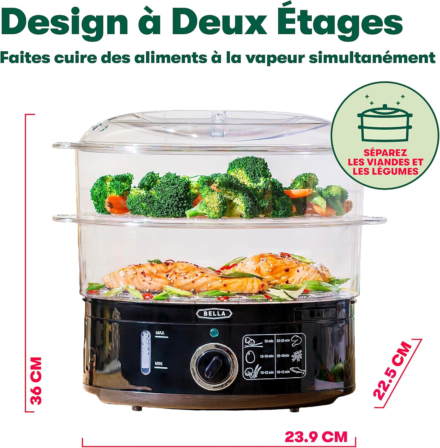 BELLA Двуетажен уред за готвене на пара с подреждащи се кошници и подвижна основа за бързо, едновременно готвене - Автоматично изключване и защита от преваряване на сухо, 7 л, Черен