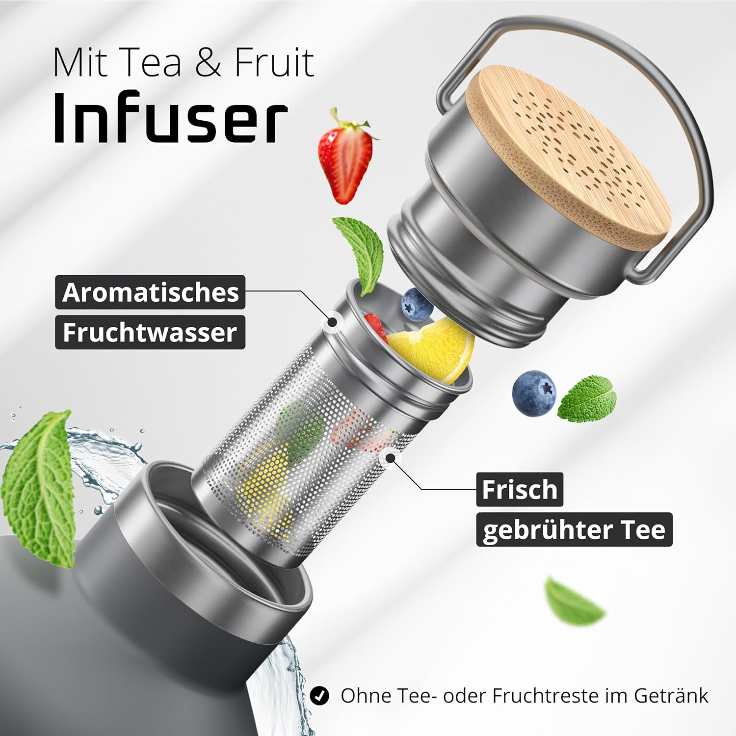 • Премиум инфузер, комплект за чай и плодове – Превърнете бутилката си за пиене в инфузер за чай или плодове за нула време и се насладете на прясно приготвен чай или пресни плодови шприцове навсякъде – без остатъци от чай или плодове да попаднат в напитката ви.