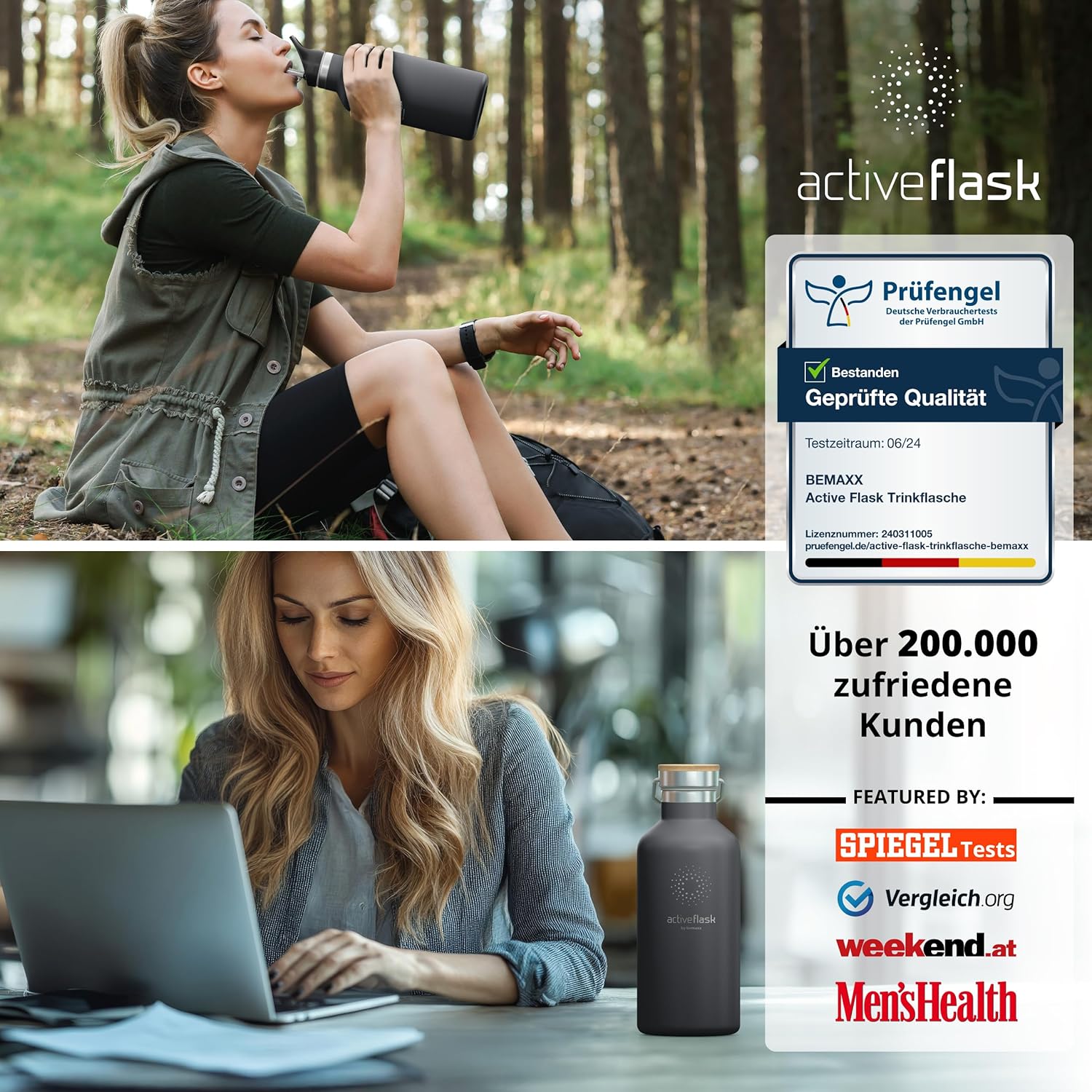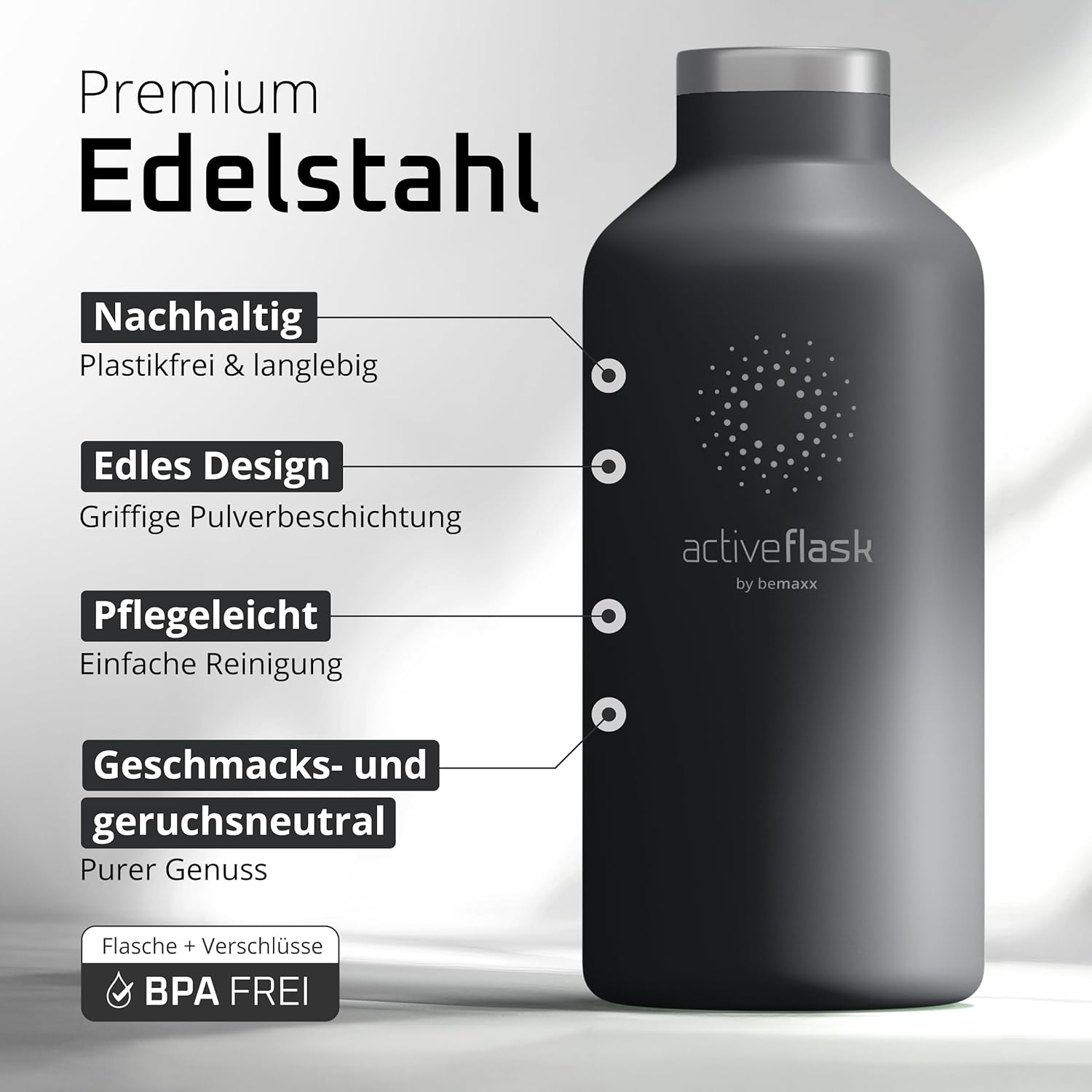 • 100% неръждаема стомана | 100% без BPA (бисфенол А) – Висококачествената полирана неръждаема стомана 18/8 не абсорбира миризми или вкусове. Сертификатите от FDA (Агенция по храните и лекарствата на САЩ) и LFGB (Тестване за контакт с храни) гарантират, че съставът, миризмата и/или вкусът на вашите напитки няма да бъдат засегнати по никакъв начин. Всички капачки на бутилки не съдържат бисфенол А и фталати, което е вредно за вашето здраве. За модели с прахово покритие и уплътнения препоръчваме ръчно миене.