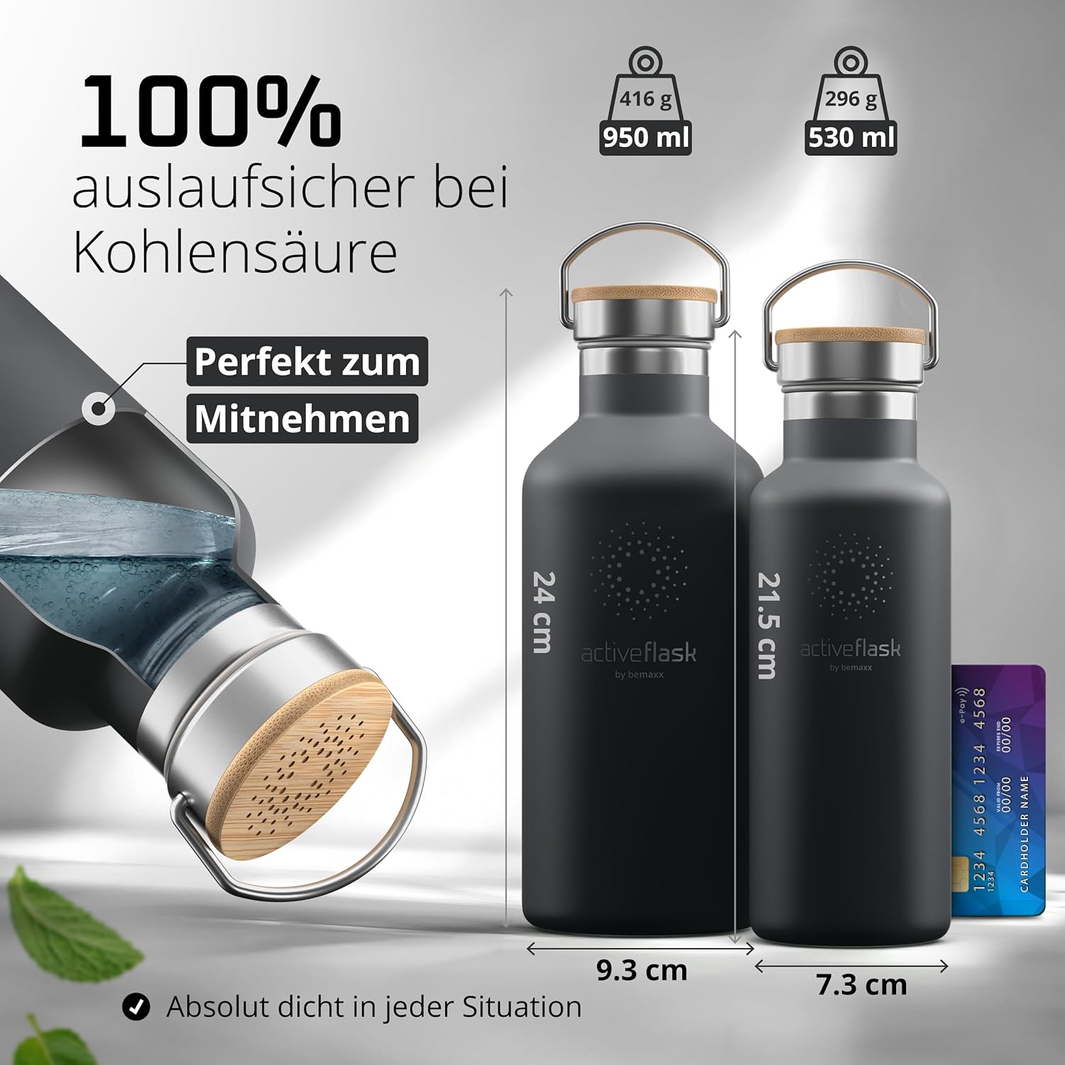 • 100% херметична бутилка за пиене. С 3-те различни, 100% херметични капачки за пиене - Sport, Straw и нашата обновена бамбукова капачка, изработена от неръждаема стомана, вашата бутилка Active е готова за всякакъв вид напитка и всички предизвикателства на ежедневието за нула време.
