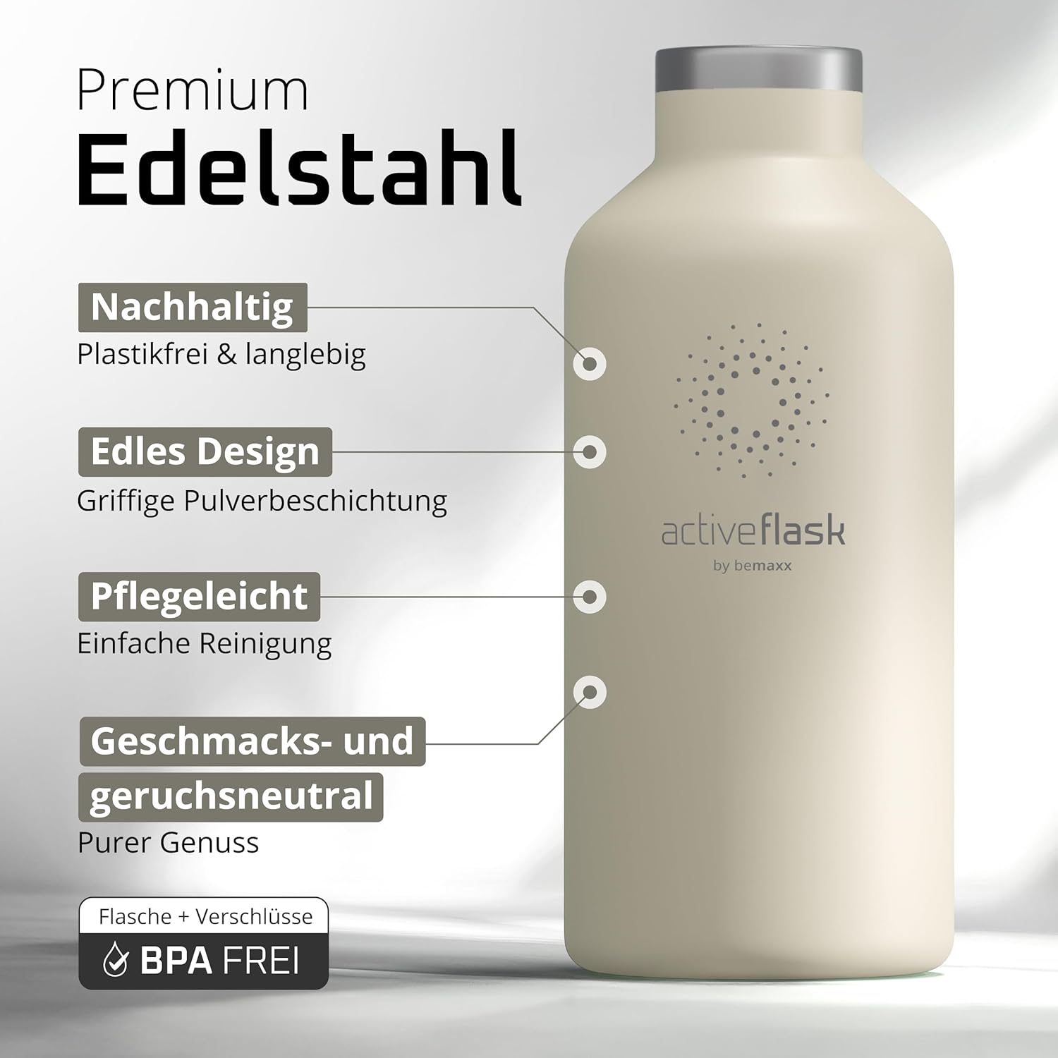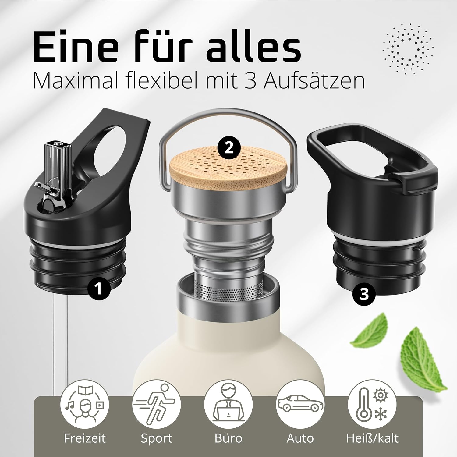 BeMaxx Active Flask бутилка за пиене от неръждаема стомана със сламка, инфузер + 3 капака: без BPA (бисфенол А), херметична, за газирани напитки, вода, термос за велосипед, изолирана, спортна бутилка, чай