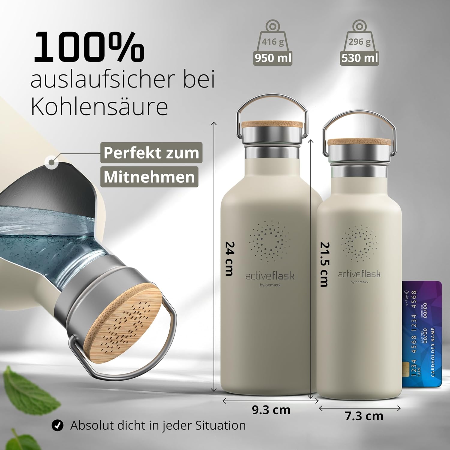 • Победител в теста: 12 часа топло и 25 часа студено | Вземете оригинала в обновен дизайн – двустенната вакуумно изолирана бутилка за пиене от неръждаема стомана с 3 различни капачки за ежедневна употреба, спорт и дейности на открито. Височина: 25 см, диаметър 9,3 см, обем: 950 мл. Тегло: 416 г. (*Настоящ победител в сравнението (категории „бутилки за пиене“ и „бутилки за пиене от неръждаема стомана“) atvergleich.org от 02/2017).