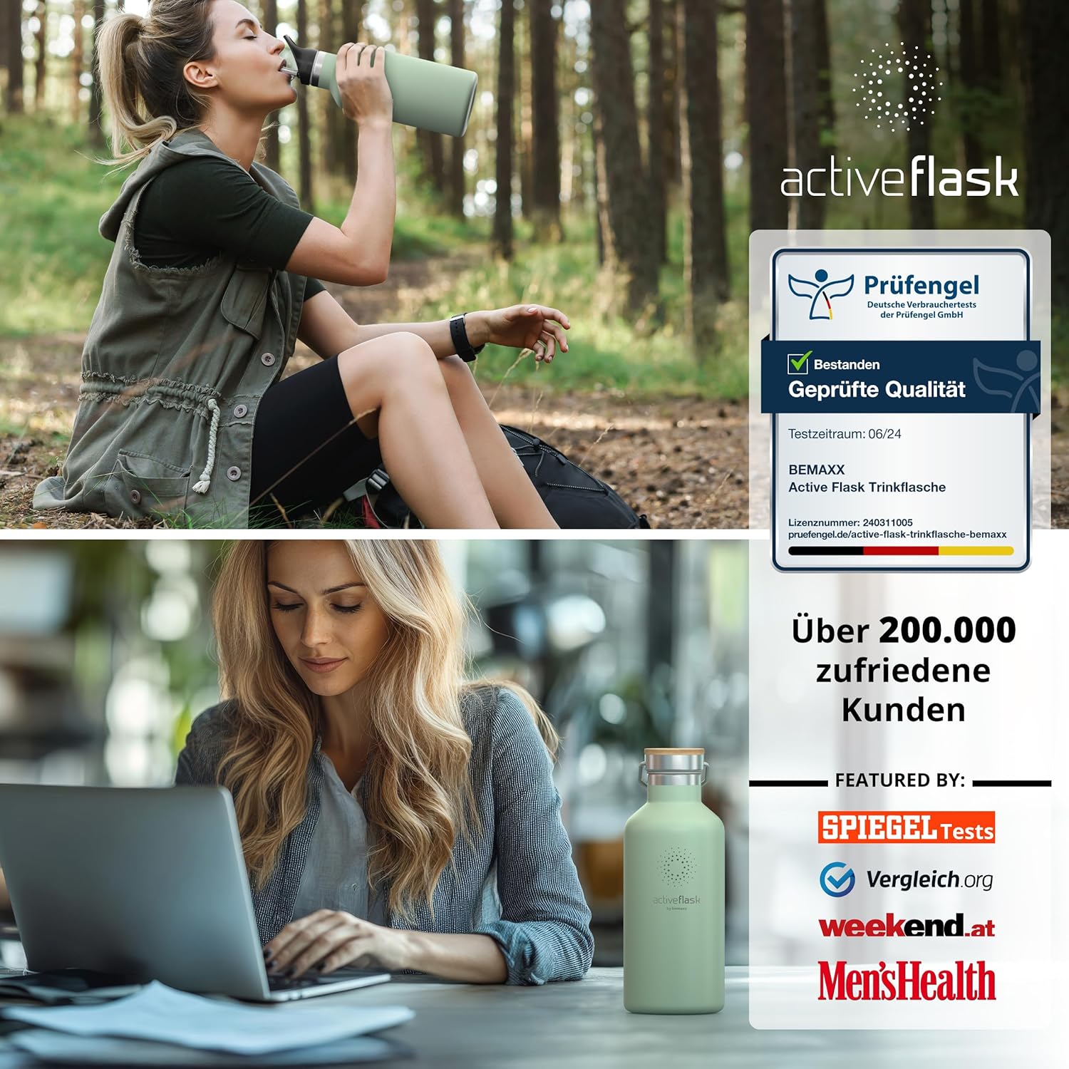 • 100% неръждаема стомана | 100% без BPA (бисфенол А) – Висококачествената полирана неръждаема стомана 18/8 не абсорбира миризми или вкусове. Сертификатите от FDA (Агенция по храните и лекарствата на САЩ) и LFGB (Тестване за контакт с храни) гарантират, че съставът, миризмата и/или вкусът на вашите напитки няма да бъдат засегнати по никакъв начин. Всички капачки на бутилки не съдържат бисфенол А и фталати, което е вредно за вашето здраве. За модели с прахово покритие и уплътнения препоръчваме ръчно миене.