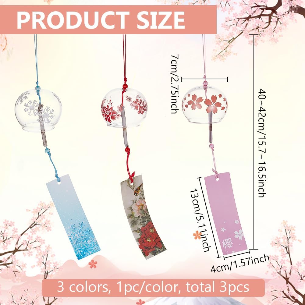 BENECREAT 3 бр. японски вятърни камбанки, розови черешови/червени/сини стъклени вятърни камбанки, ръчно изработени висулки за подарък за рожден ден и домашен декор
