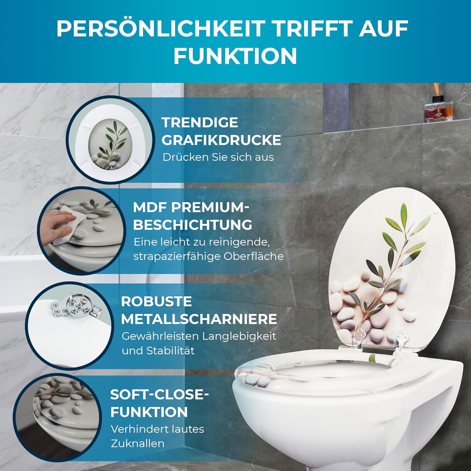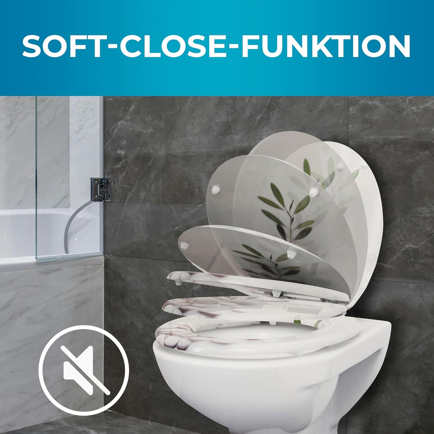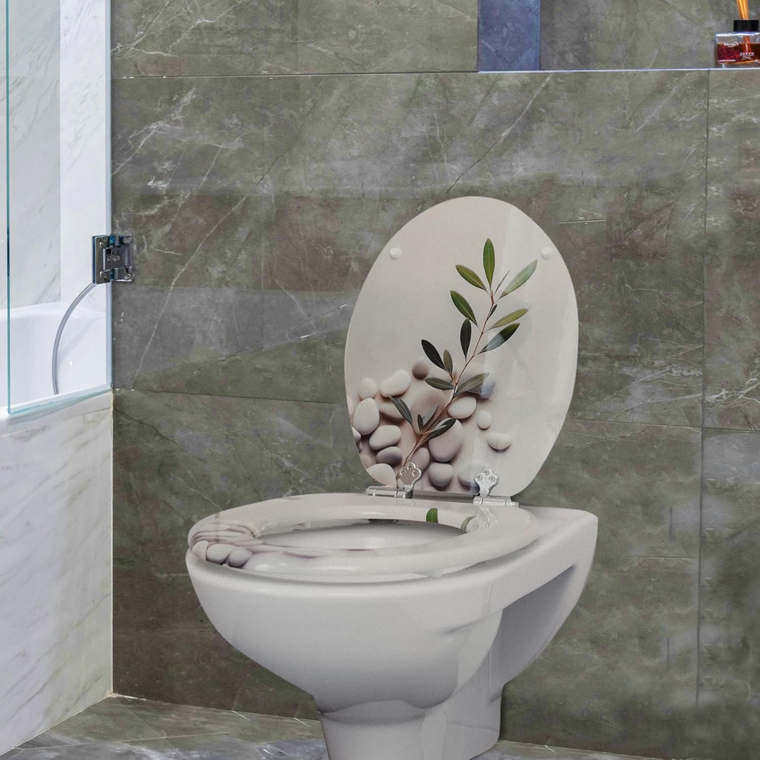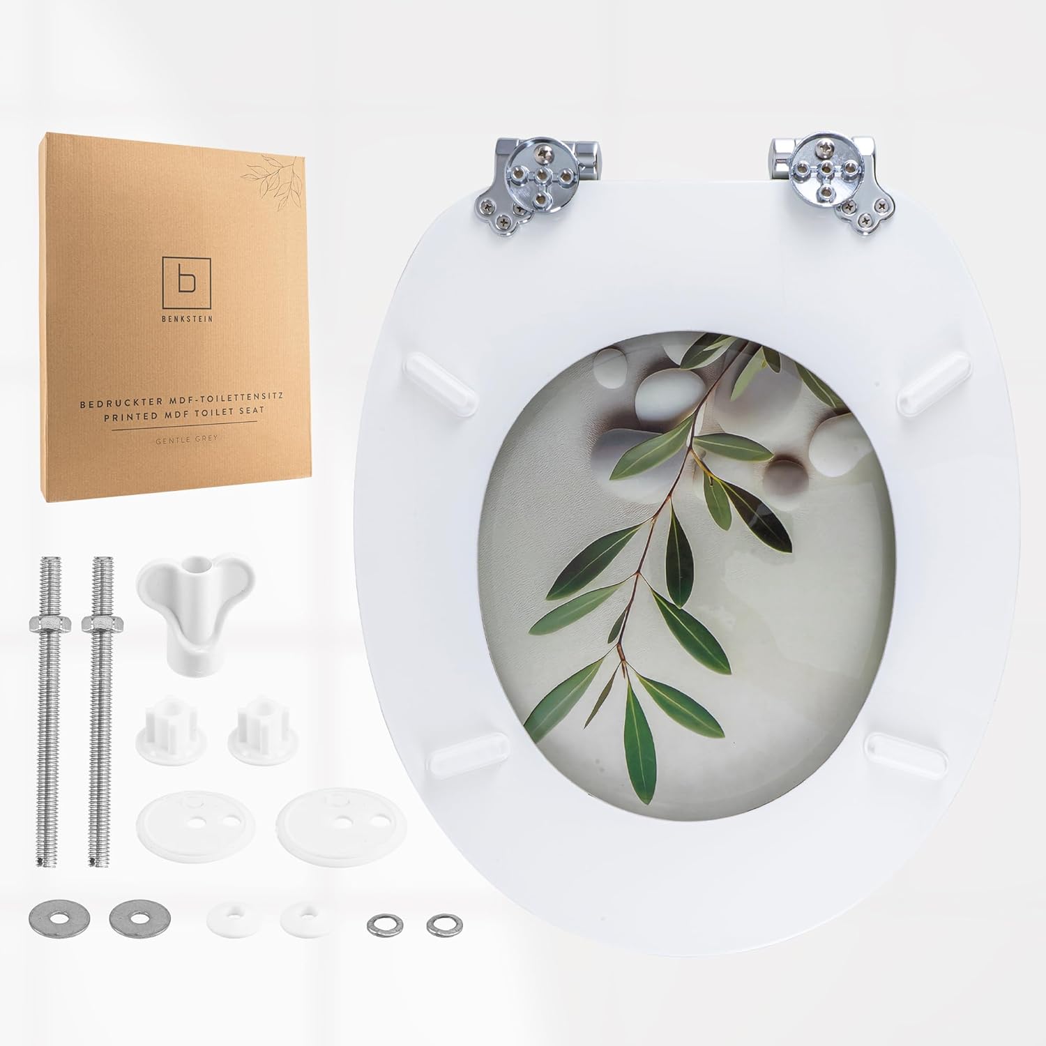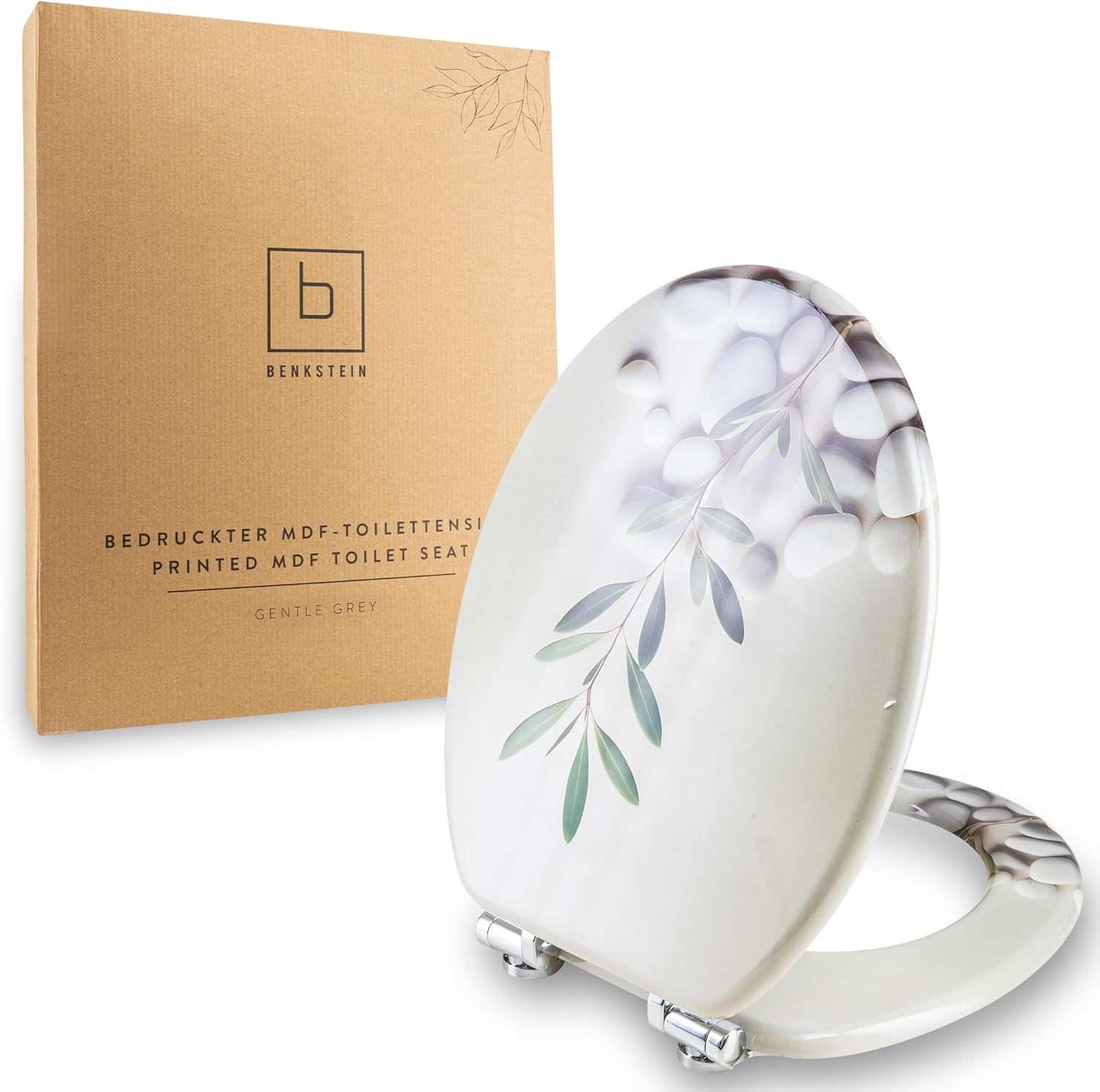 Benkstein® Premium антибактериален капак за тоалетна чиния с щампа, дуропласт капак за тоалетна чиния с механизъм за бързо освобождаване и плавно затваряне, подвижна тоалетна седалка, меко сиво