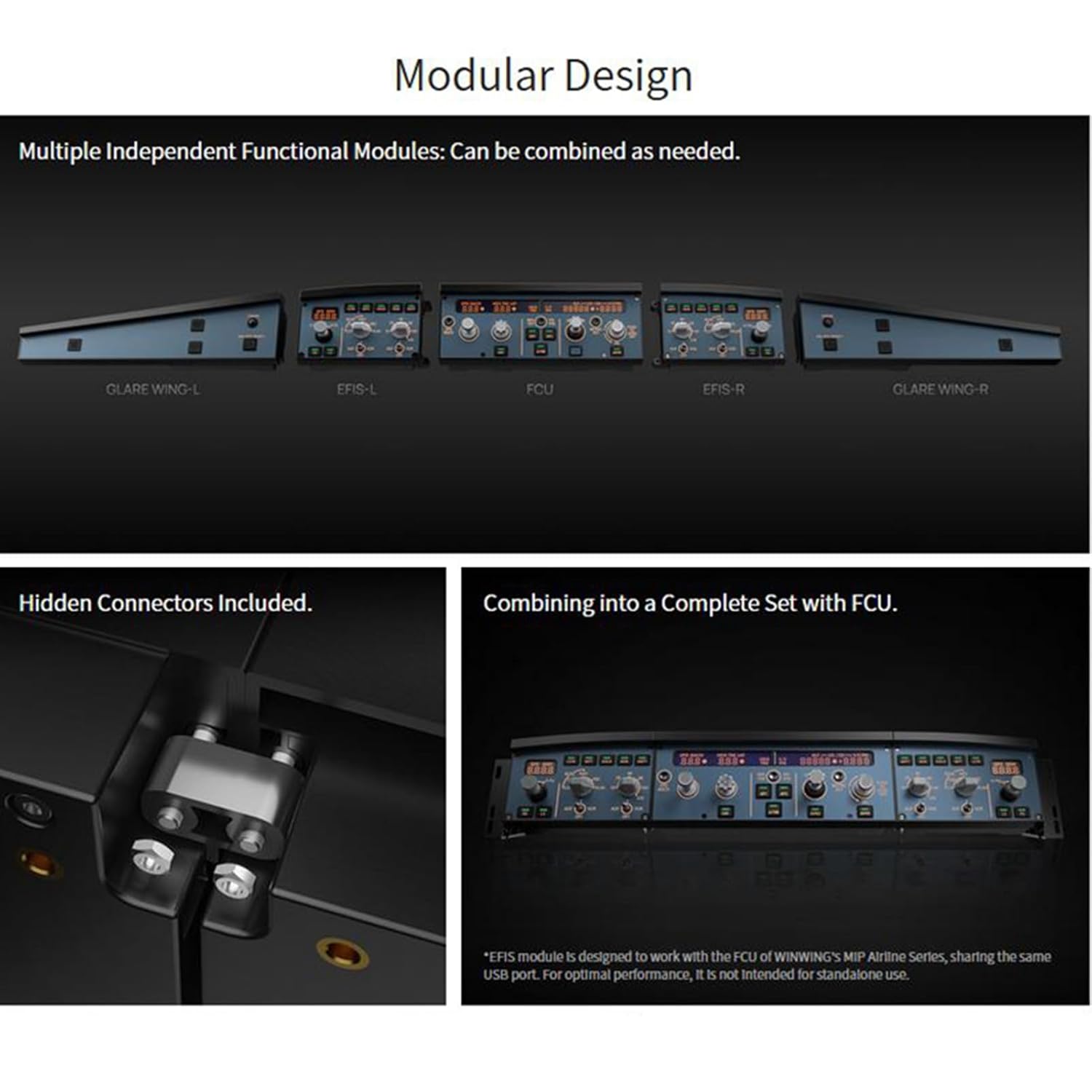 • Модулен дизайн: С множество независими функционални модули, WINWING EFIS L и EFIS R могат да се комбинират според нуждите. Включени са скрити конектори и могат да се сглобят с FCU на серията MIP Airline на WINWING в пълен комплект, споделяйки един и същ USB порт за настолна употреба.