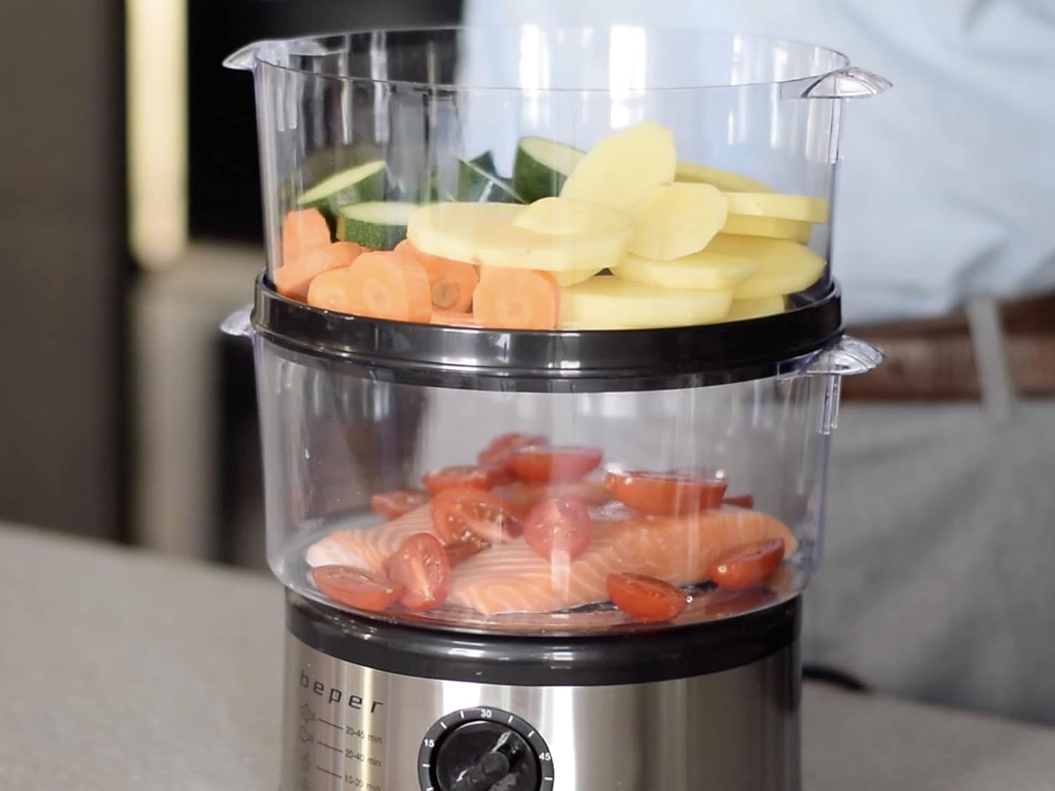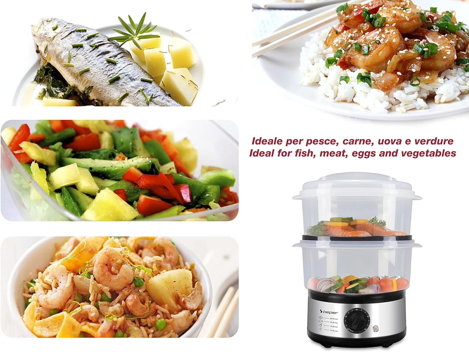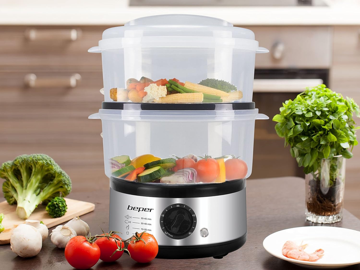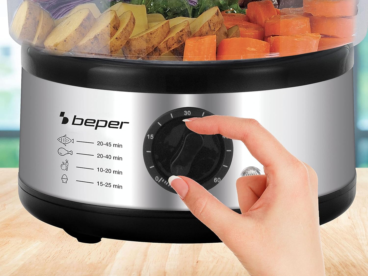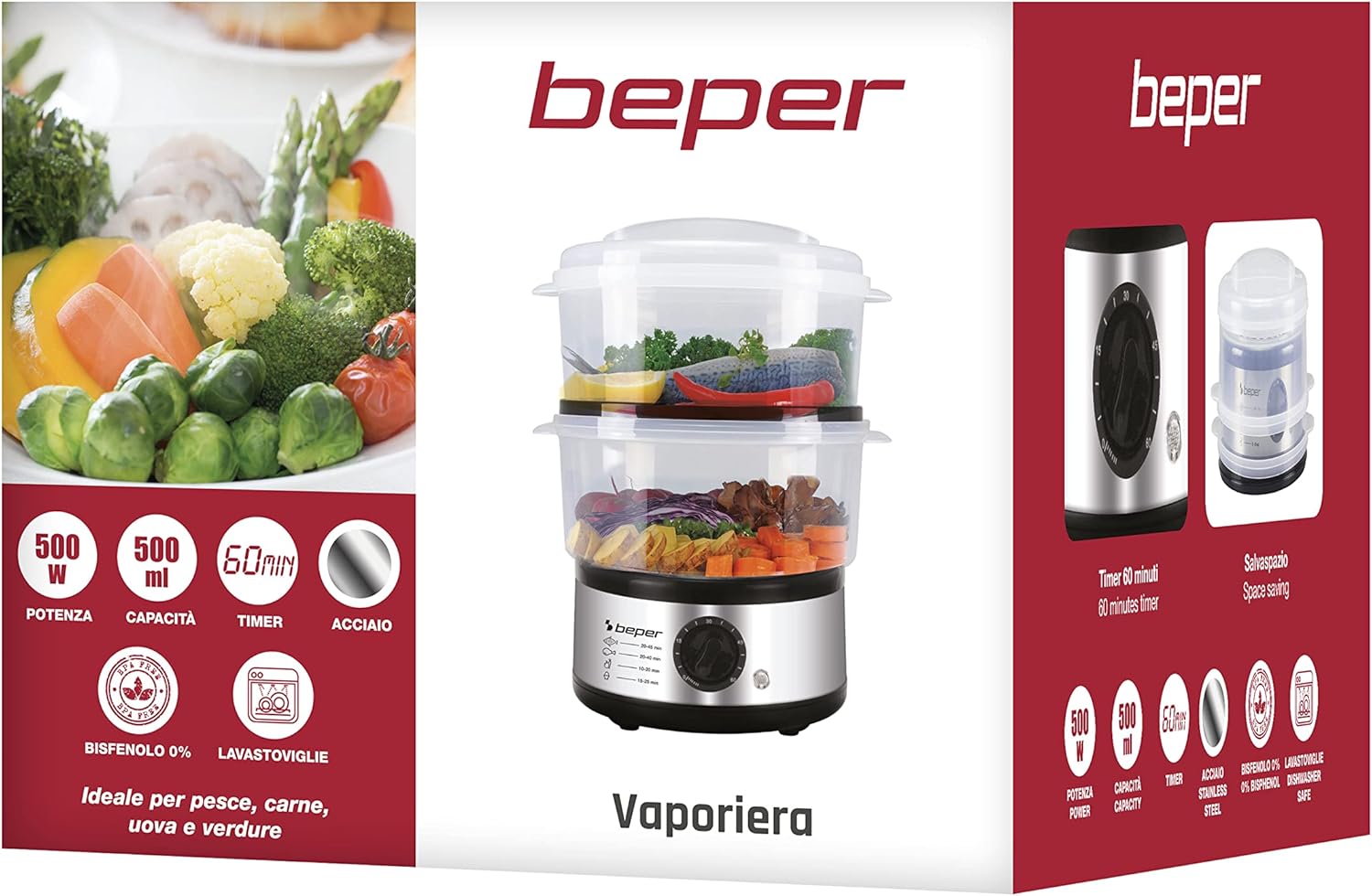 Beper - Многофункционална електрическа тенджера за пара с обем 5 литра, компактно съхранение, 60-минутен таймер, мощност 400-500 W, - сребристо и черно