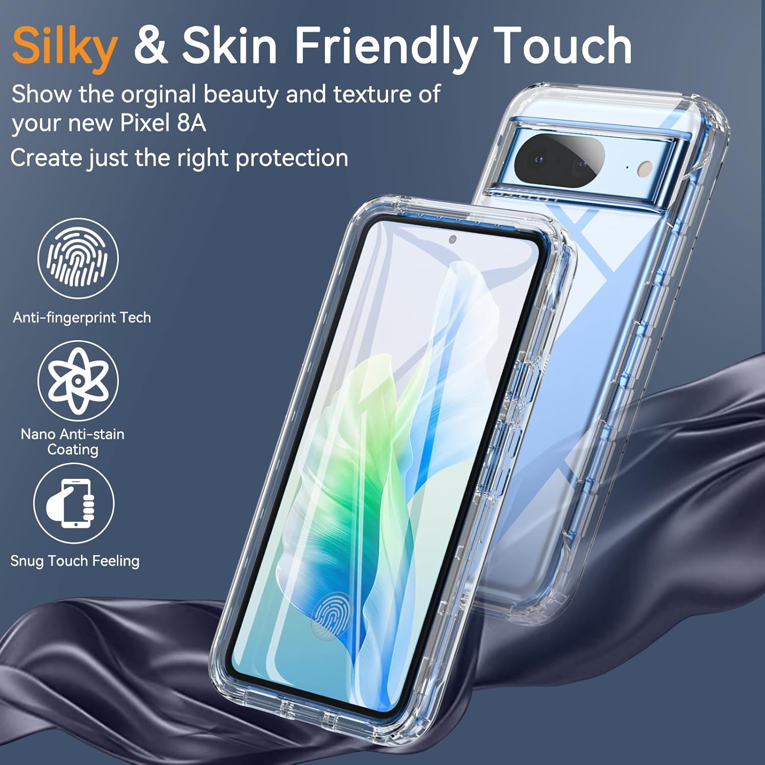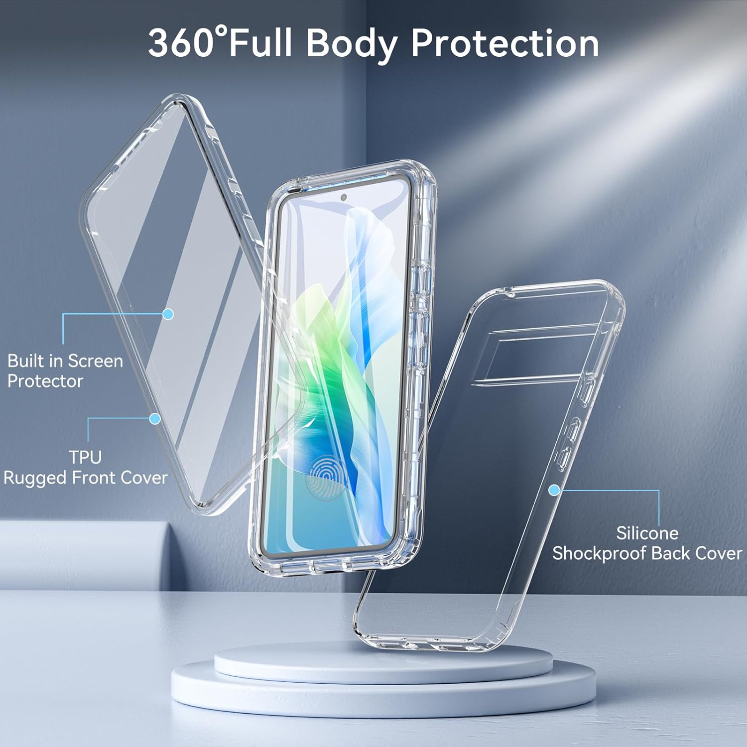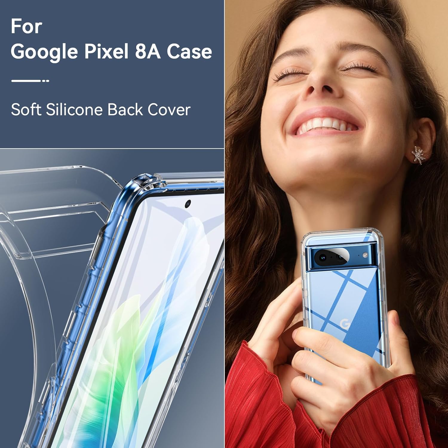 BESINPO Кейс за Google Pixel 8a, Силиконов 360° всестранна защита с вграден протектор за екрана, Здрав капак, защитен калъф за мобилен телефон за Pixel 8a за употреба на открито (прозрачен)