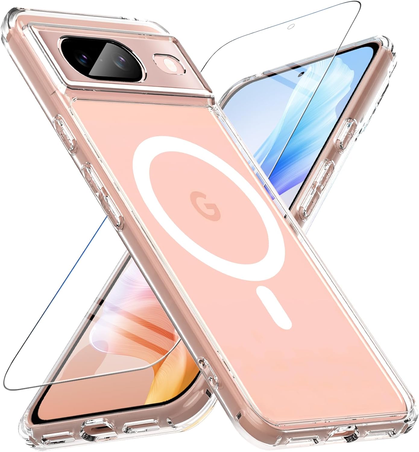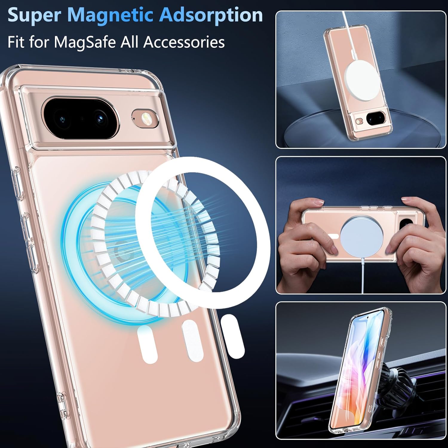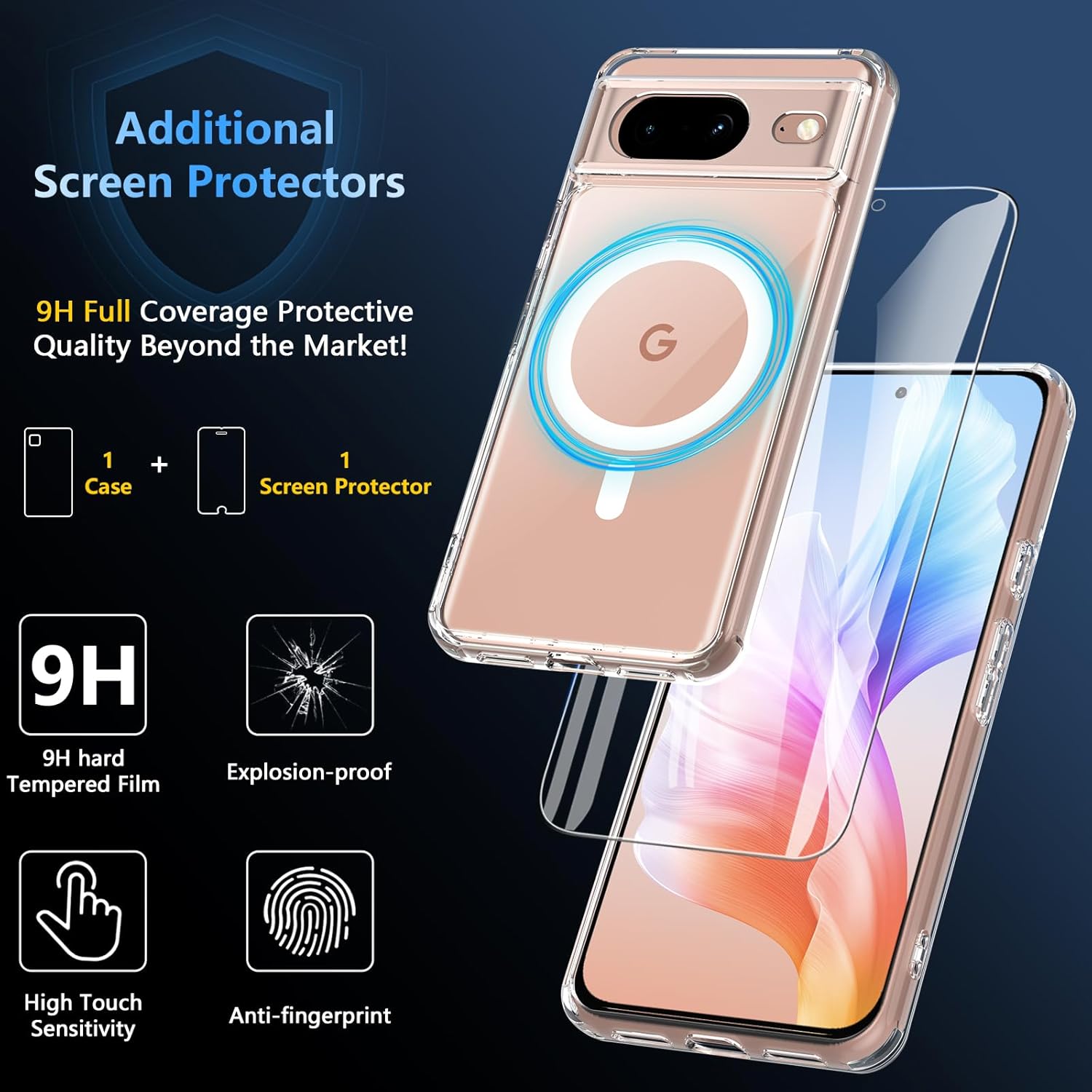 BESINPO Магнитен калъф за Google Pixel 8, с протектор за екран, военен клас, удароустойчив, здрав защитен калъф-броня, калъф за мобилен телефон за Google Pixel 8, прозрачен