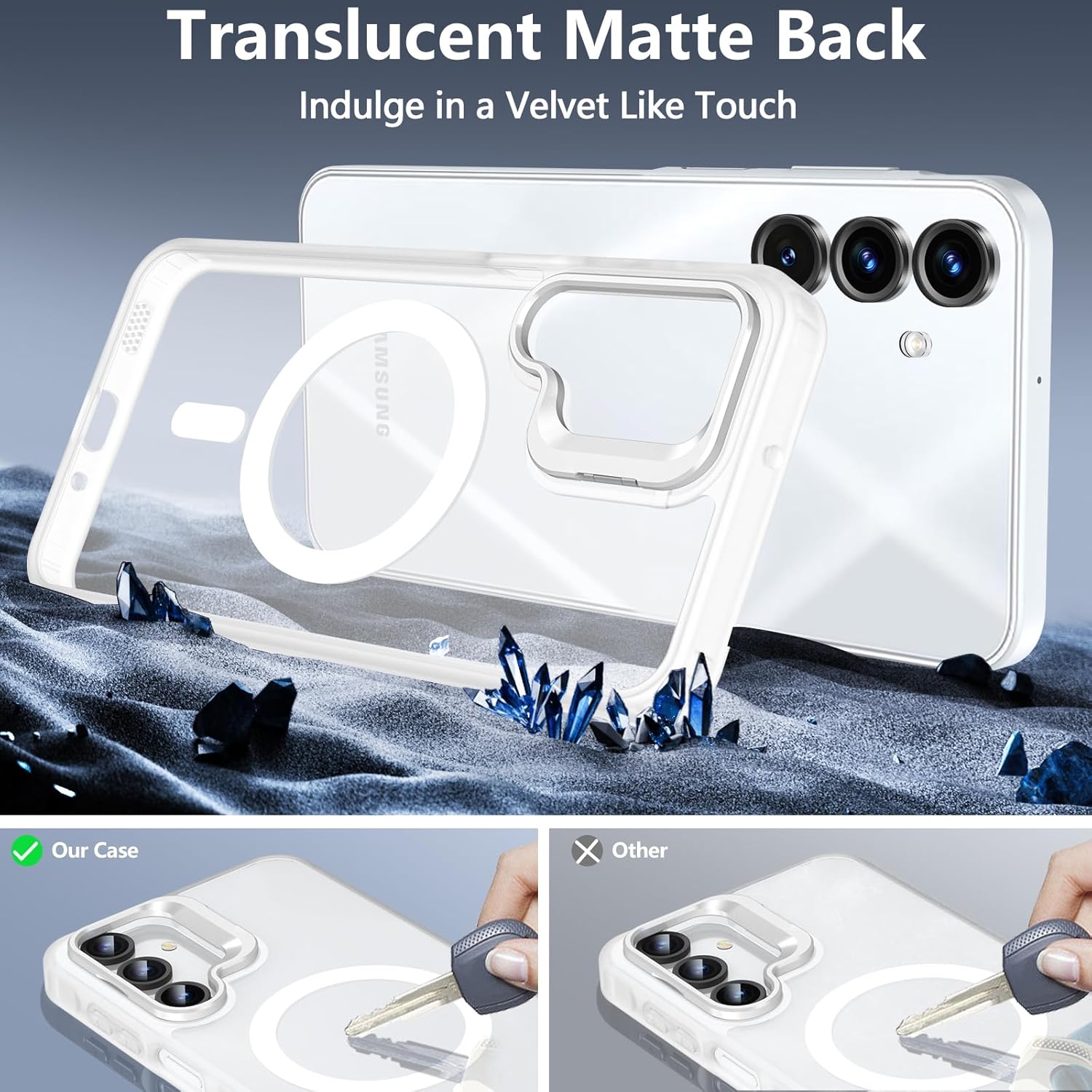 • Приятно усещане, без прах, без пожълтяване: Луксозен матов полупрозрачен дизайн. Гърбът е изработен от матиран, полупрозрачен, матиран поликарбонат (PC) за кадифено усещане.