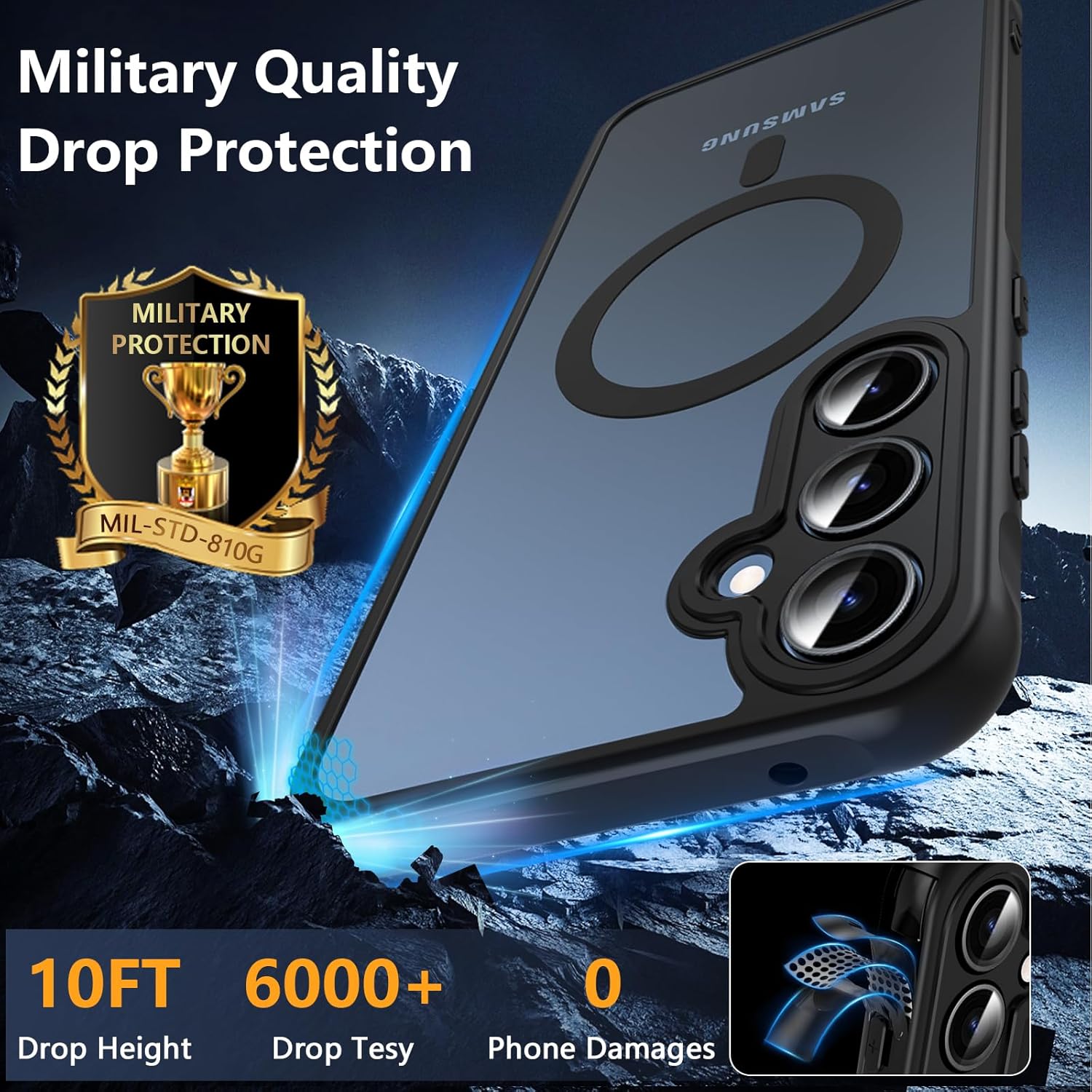 • Сертифициран военен клас, тестван за падане: Калъфът за Samsung S25 Ultra използва ударопоглъщащ TPU и има здрава структура с 4-слойно омекотяване и технология X-Shock 3.0.