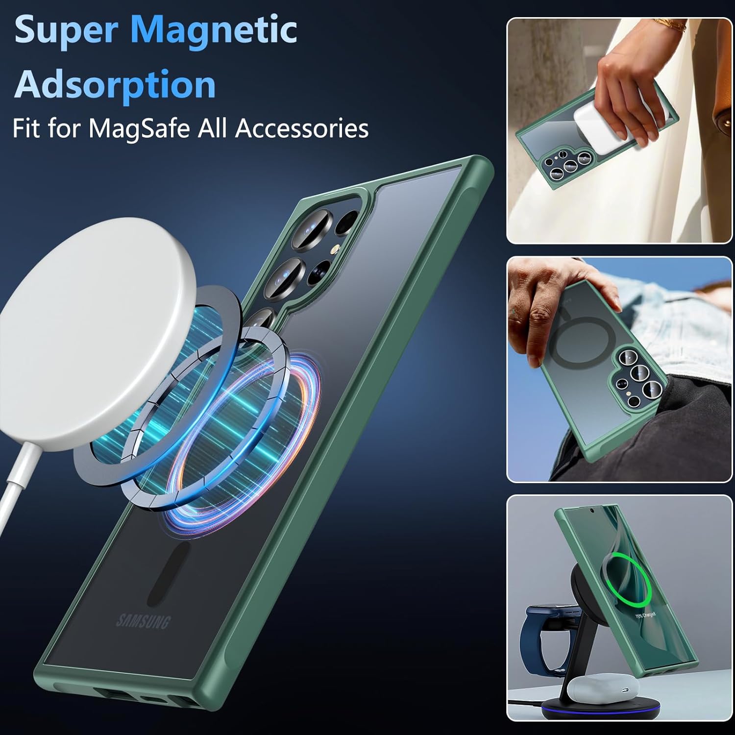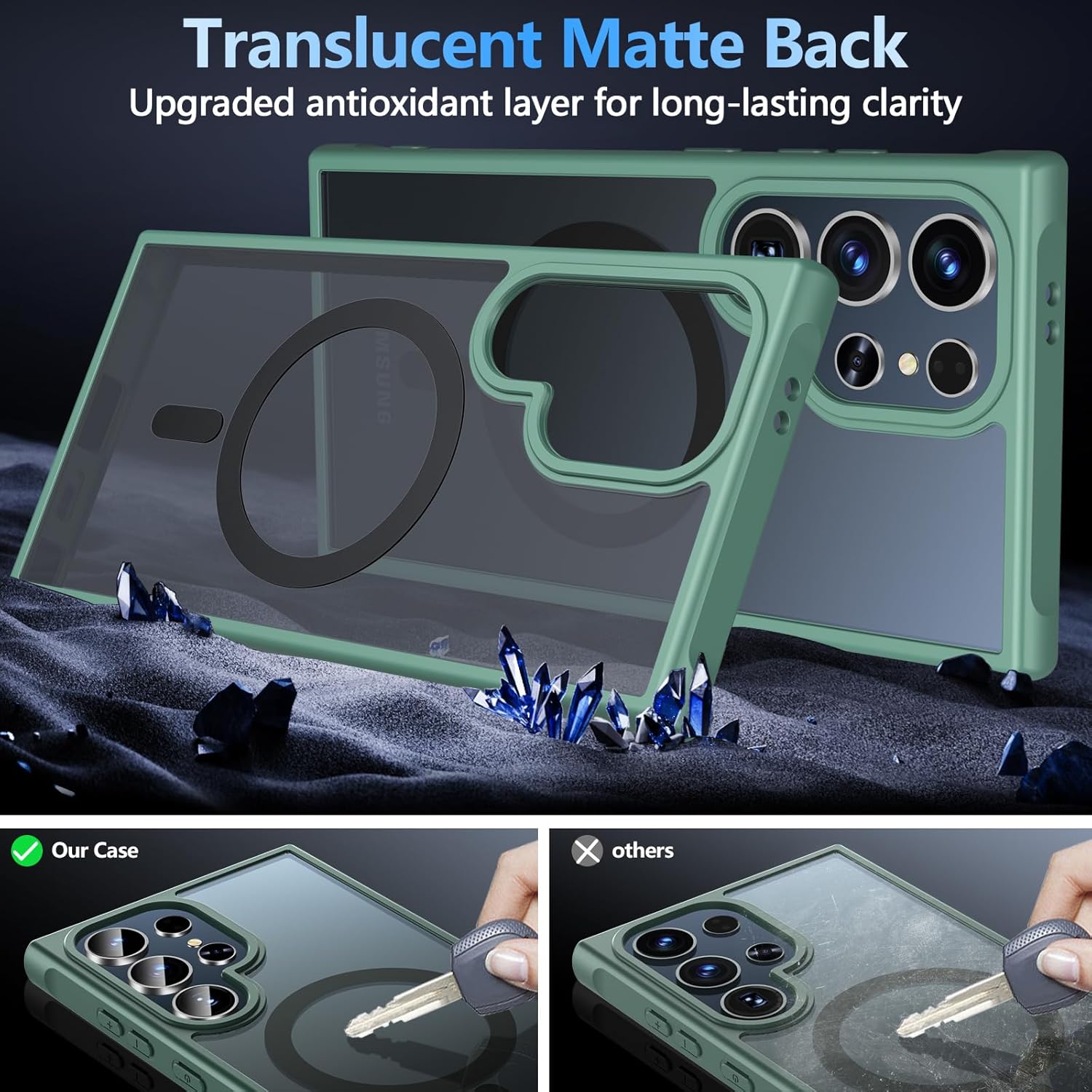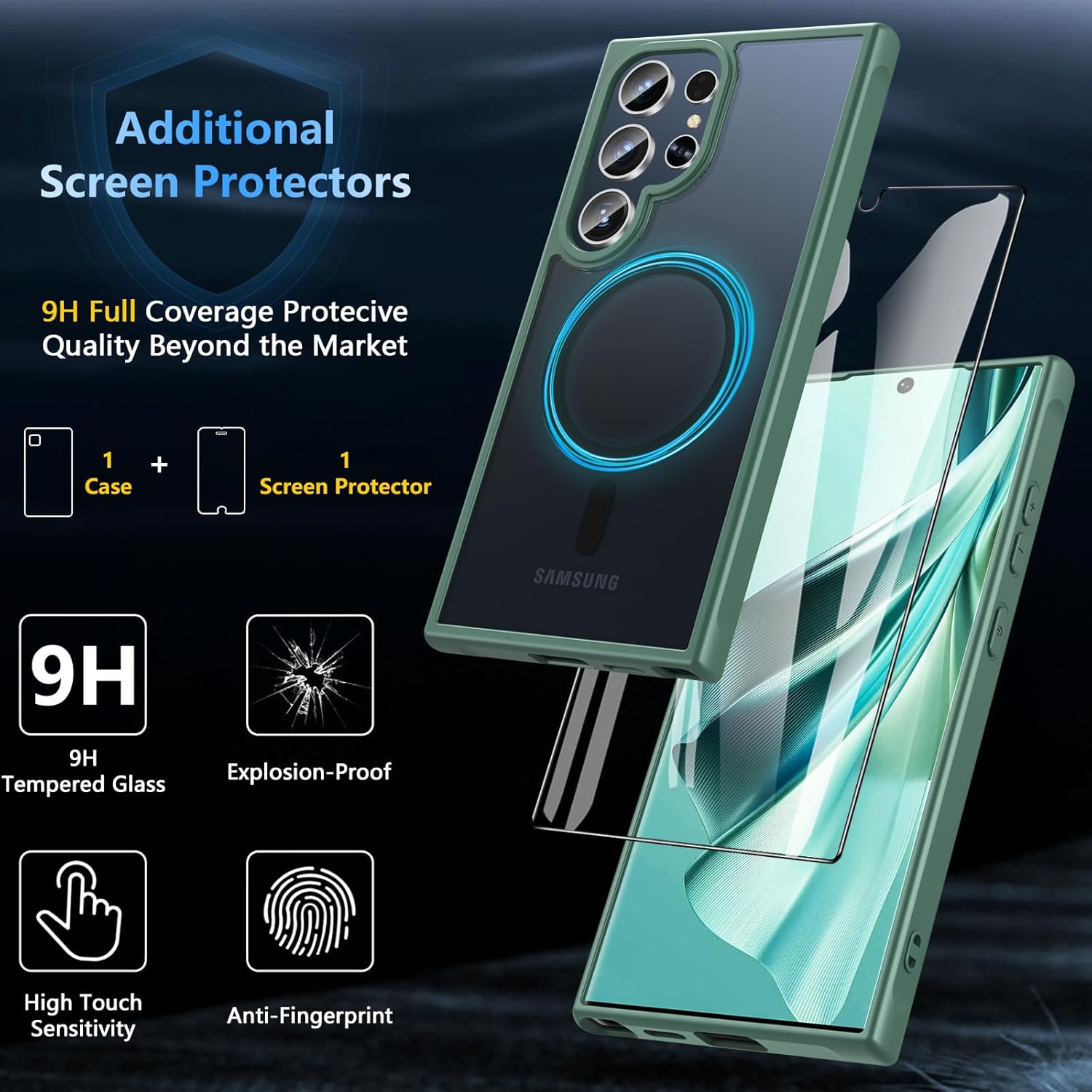 BESINPO Магнитен калъф за Samsung Galaxy S24 Ultra, със закалено стъкло, матово полупрозрачно покритие с военен клас защита, здрав защитен калъф за Samsung S24 Ultra 5G (зелен)