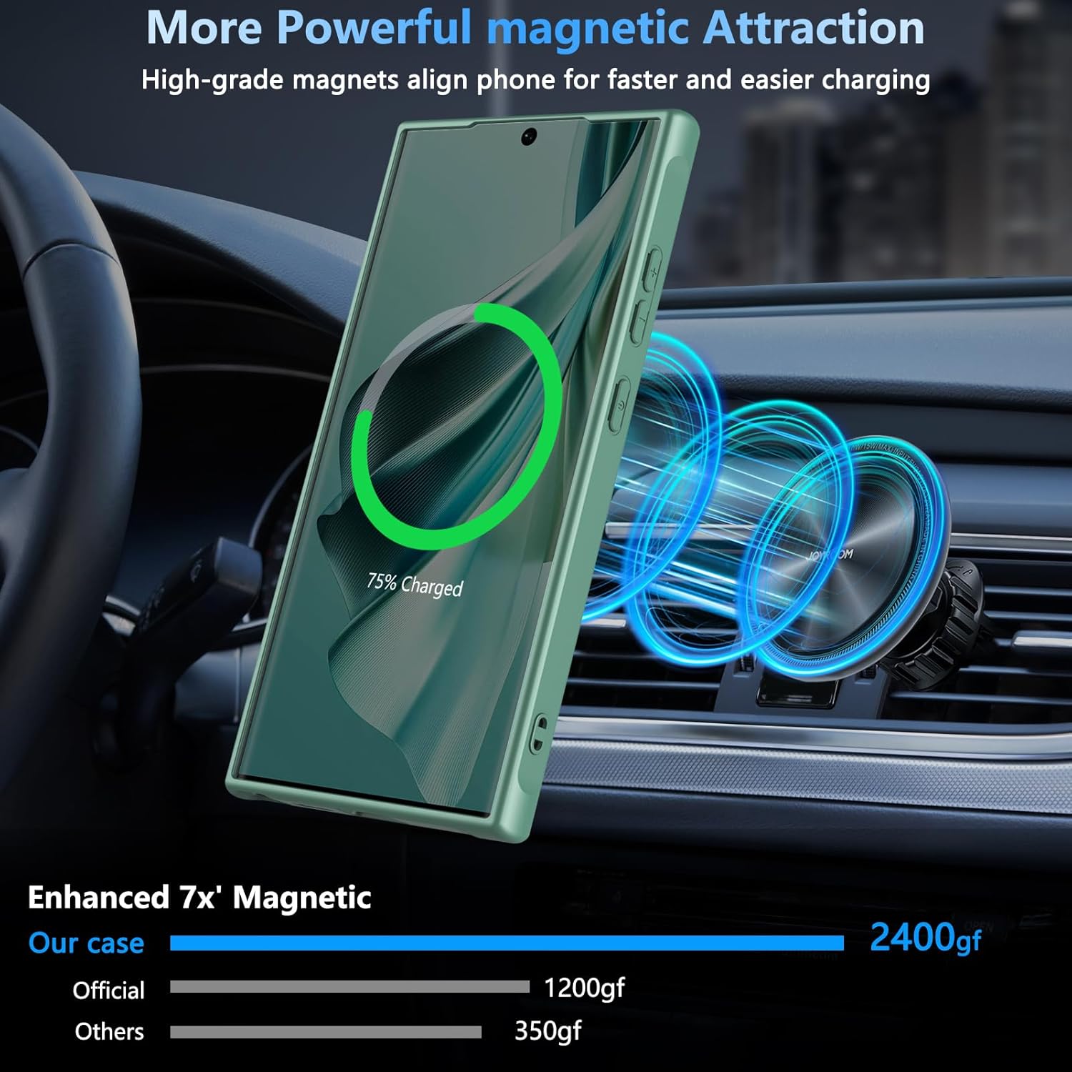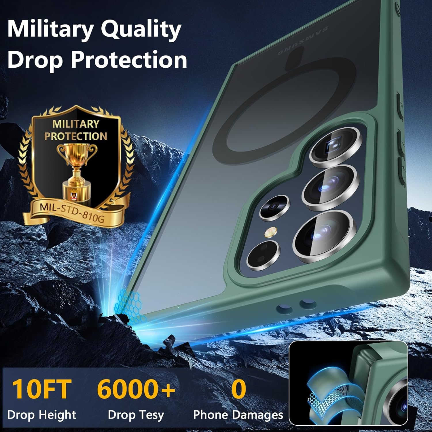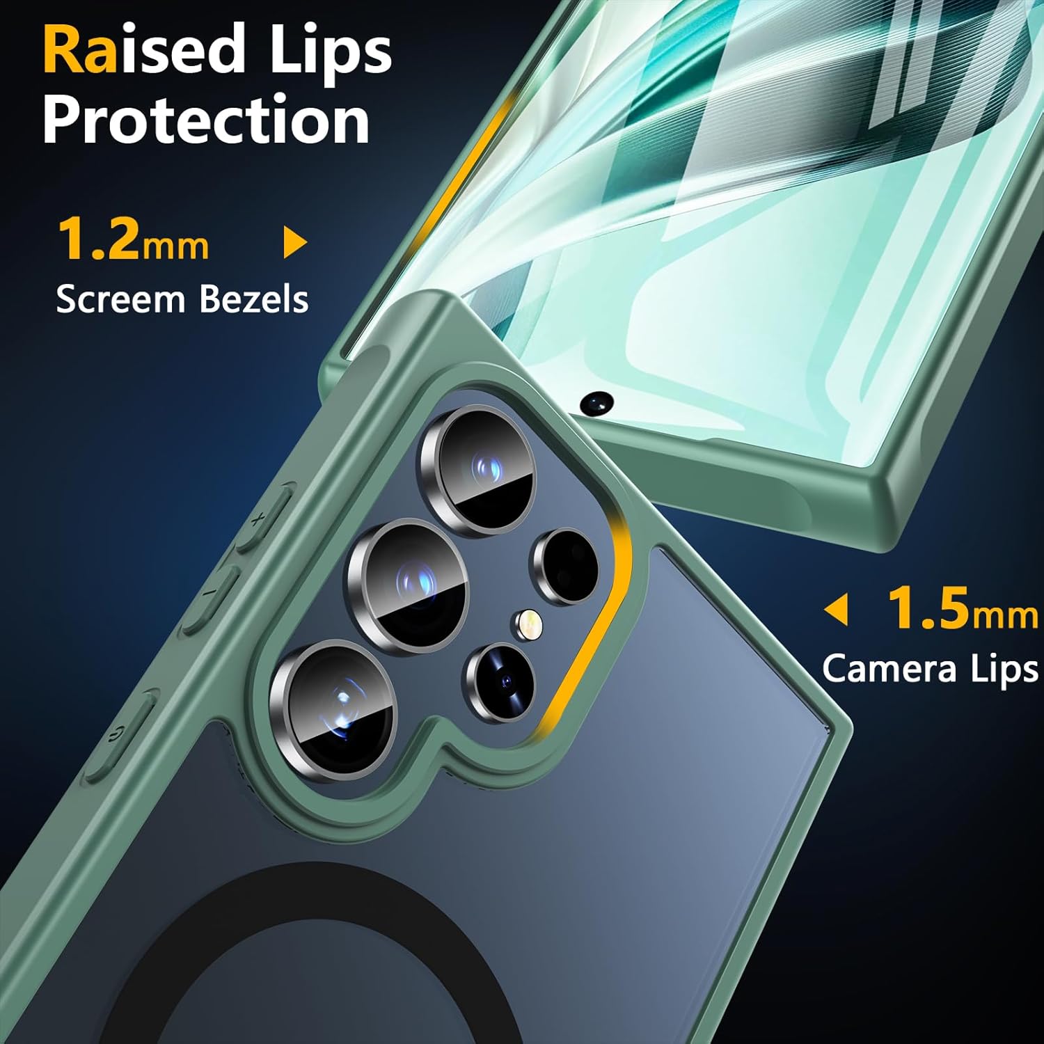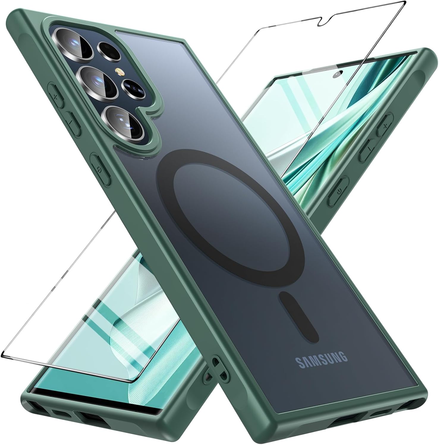 BESINPO Магнитен калъф за Samsung Galaxy S24 Ultra, със закалено стъкло, матово полупрозрачно покритие с военен клас защита, здрав защитен калъф за Samsung S24 Ultra 5G (зелен)