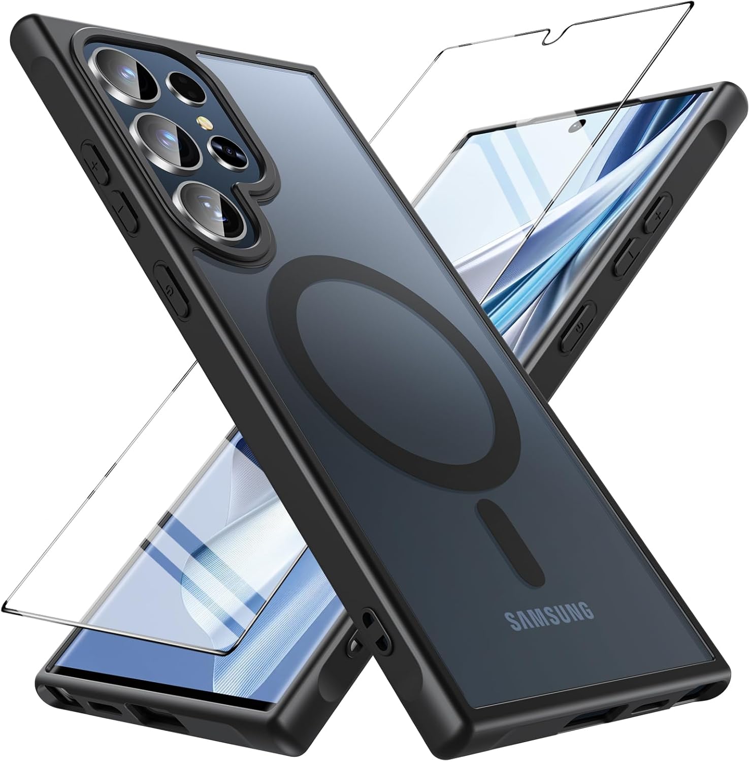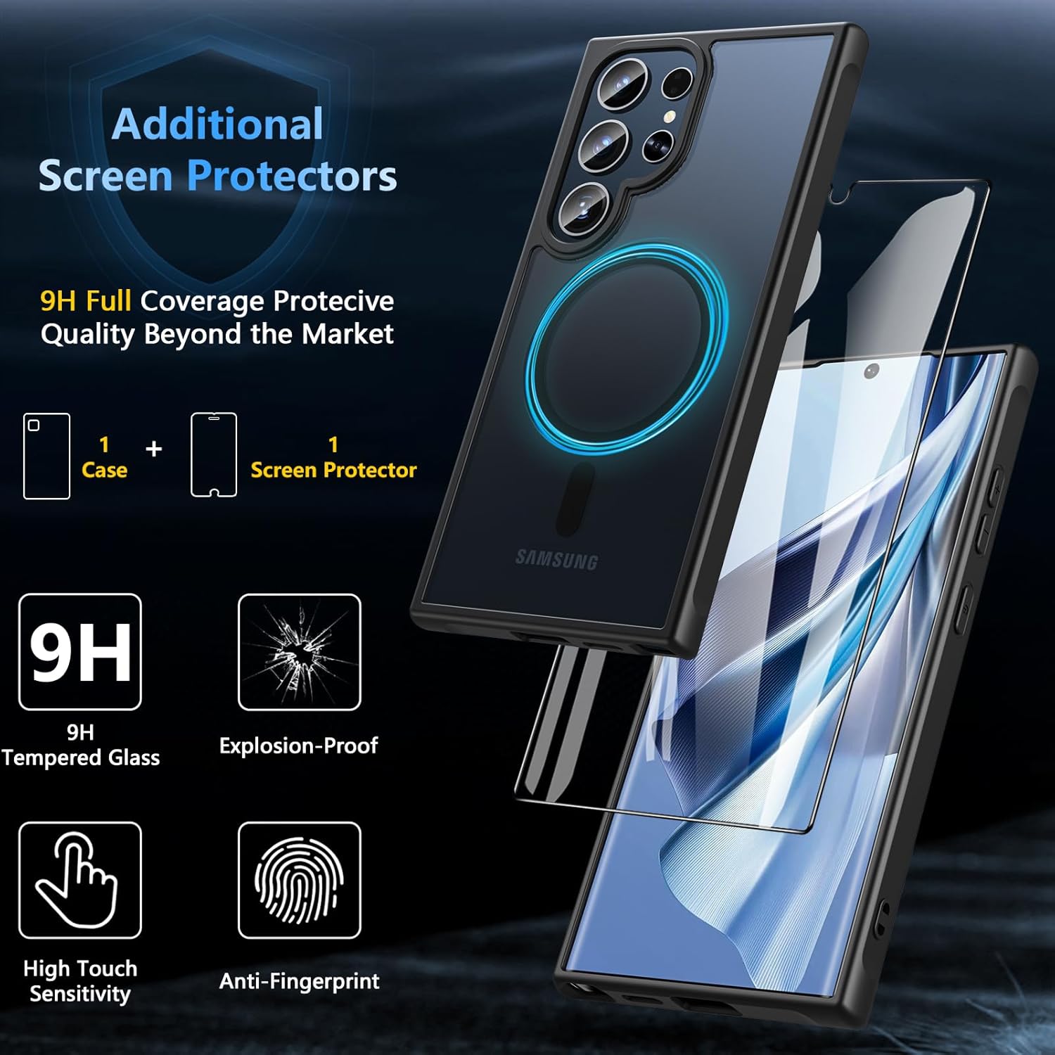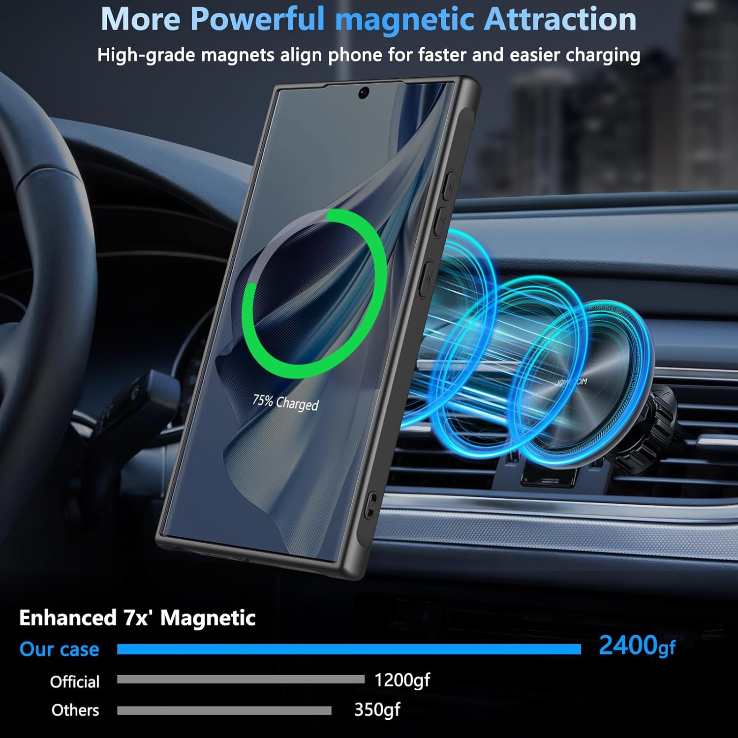 BESINPO Магнитен калъф за Samsung Galaxy S24 Ultra, със закалено стъкло, защита от военен клас, удароустойчив, здрав защитен калъф за Samsung S24 Ultra (черен)