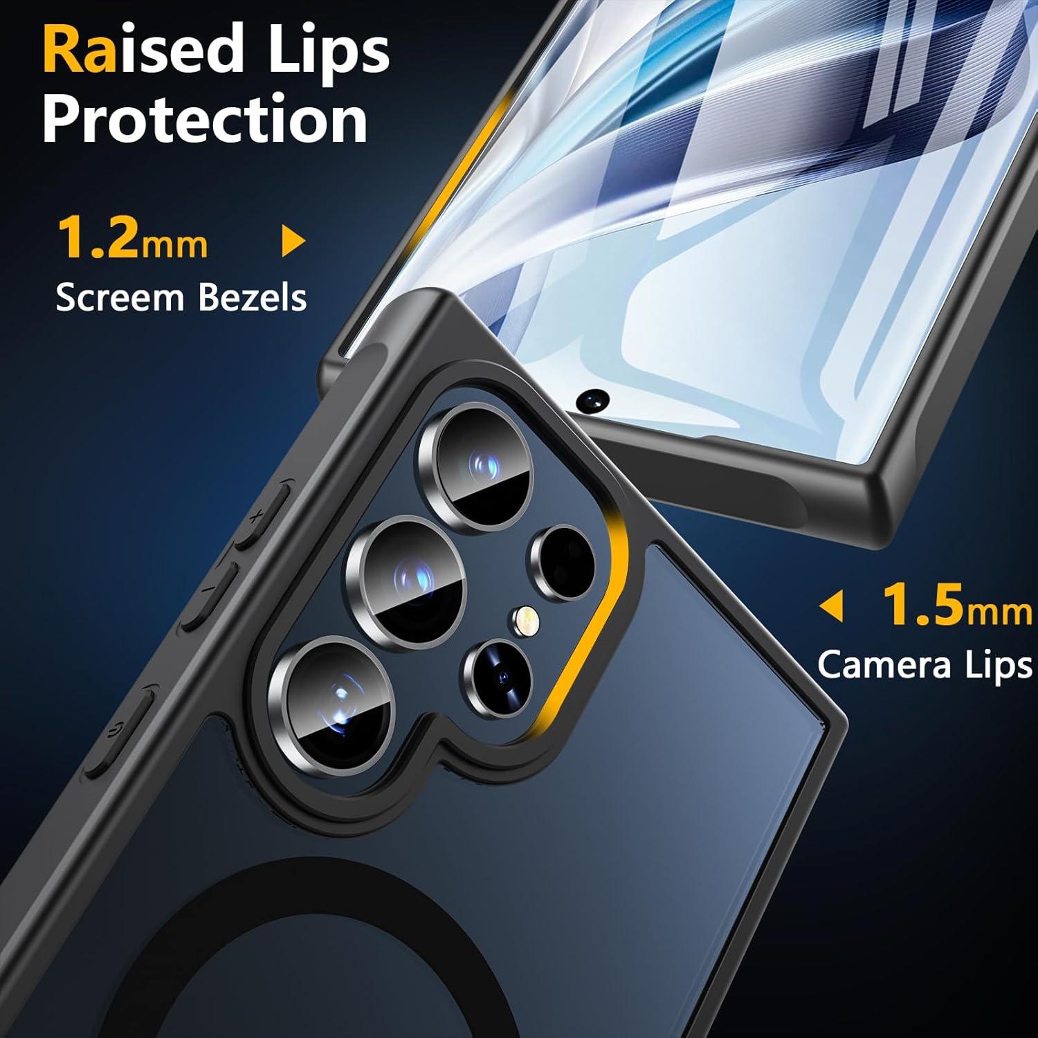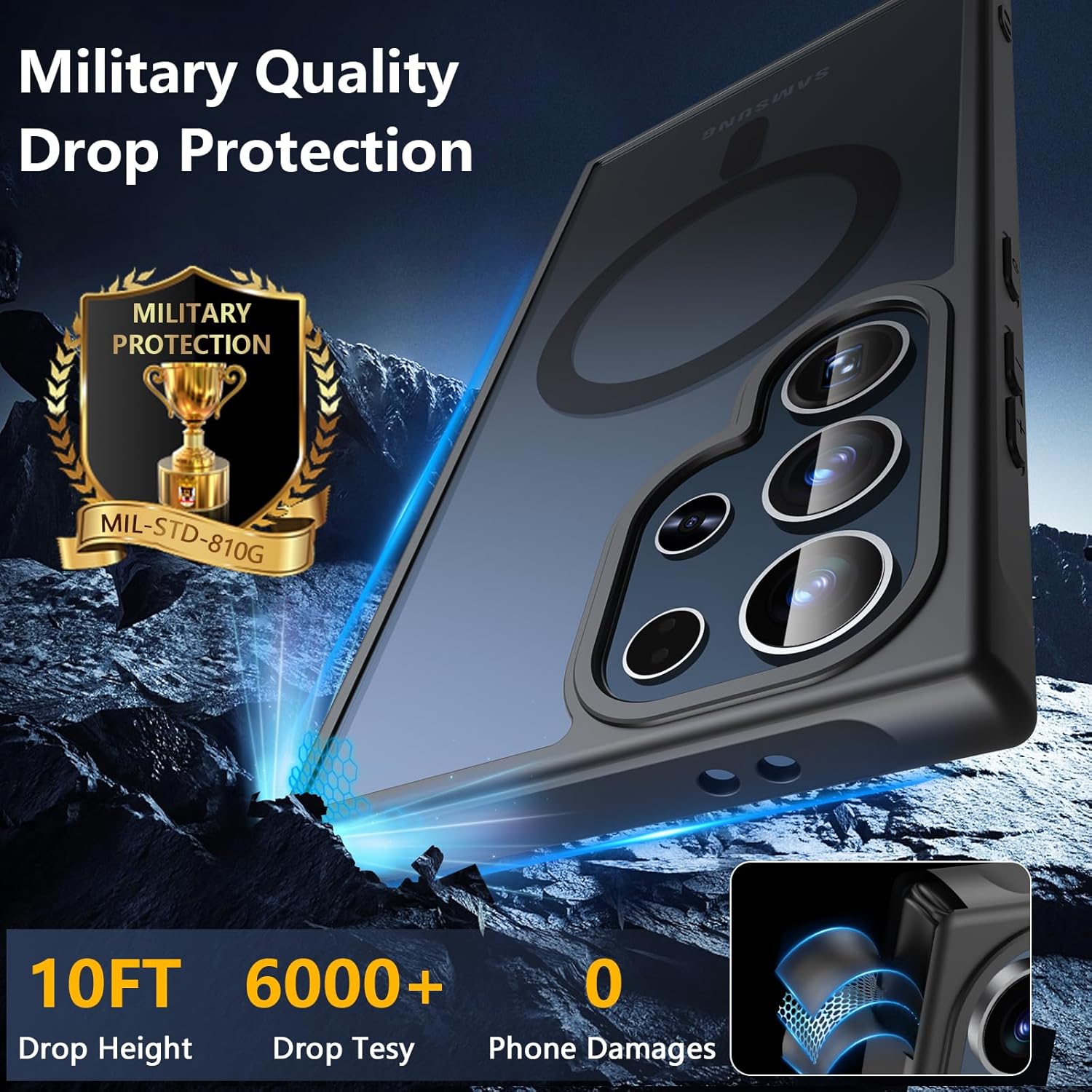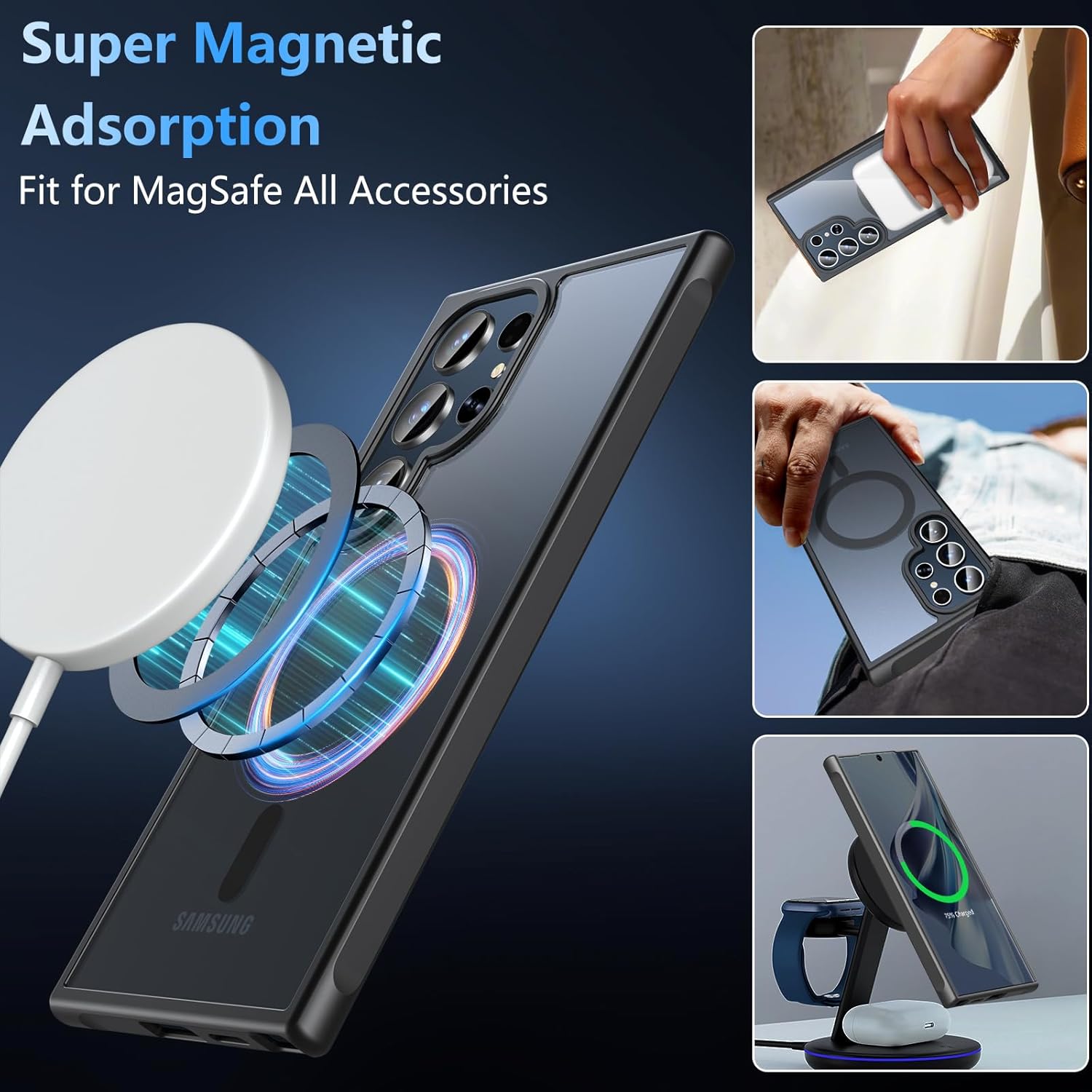 BESINPO Магнитен калъф за Samsung Galaxy S24 Ultra, със закалено стъкло, защита от военен клас, удароустойчив, здрав защитен калъф за Samsung S24 Ultra (черен)