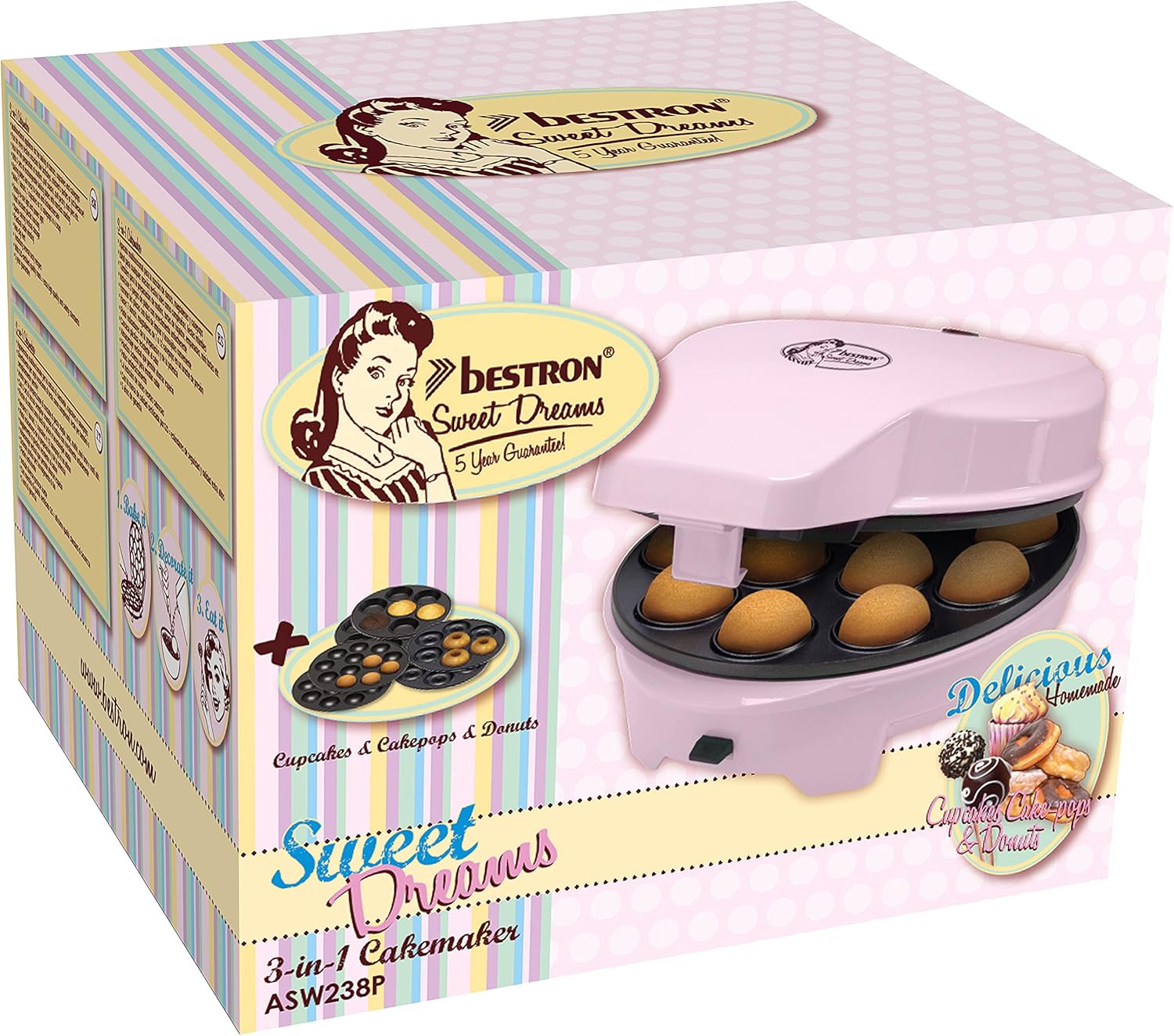 Bestron 3-в-1 ретро уред за печене с 3 сменяеми плочи за печене: понички, мъфини и кейк попс, незалепващо покритие, 700 вата, цвят: розов
