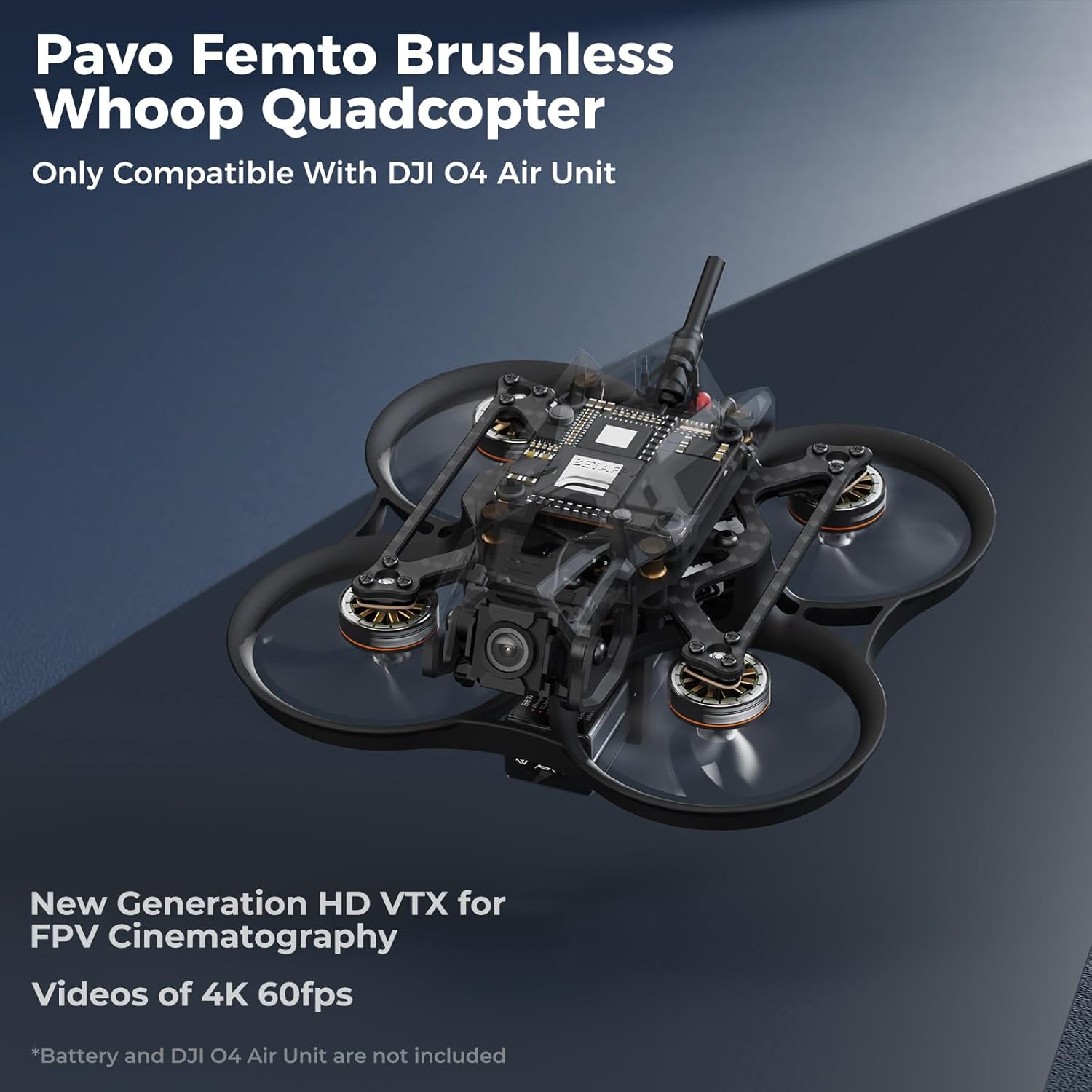• 2S 4K джобен дрон: BETAFPV Pavo Femto е 2S безчетков дрон с висока разделителна способност, разработен за DJI O4 Air Unit, осигуряващ изключителен 4K/60fps видеозапис и несравнима 2S 4K летяща производителност в компактен дизайн. С персонализируеми настройки и здрави компоненти, Pavo Femto се отличава както във фрийстайл летене, така и във въздушна видеозаснемане (по подразбиране се предлага без DJI O4 Air Unit)