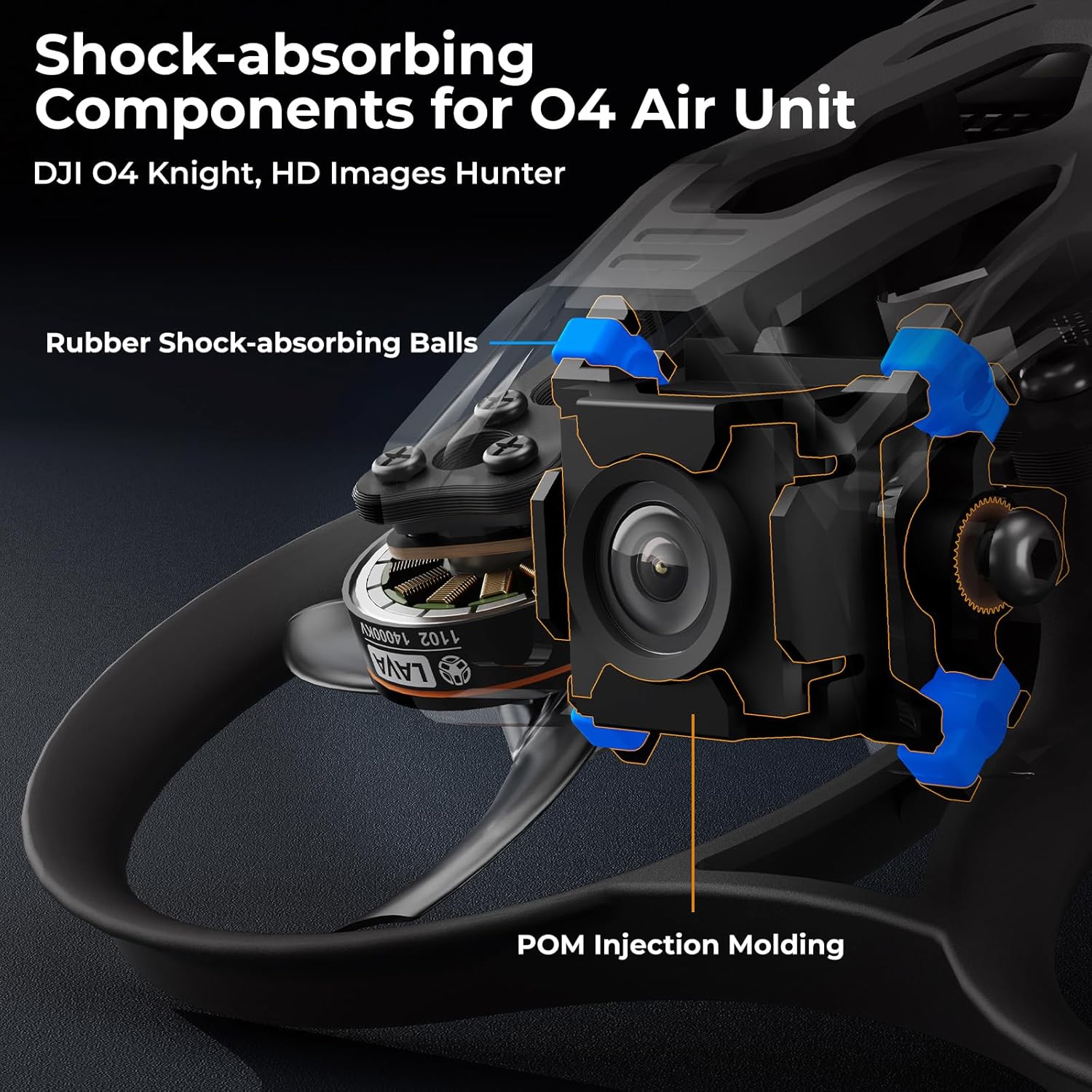 • Компоненти, абсорбиращи ударите: за да осигури кристално чисто видео, Pavo Femto включва специализирана система за абсорбиране на ударите за DJI O4 Air Unit. Изработени от ултраздрав POM материал, компонентите, абсорбиращи ударите, ефективно изолират високочестотните вибрации, намалявайки желеобразния ефект и осигурявайки стабилни кадри с професионално качество.