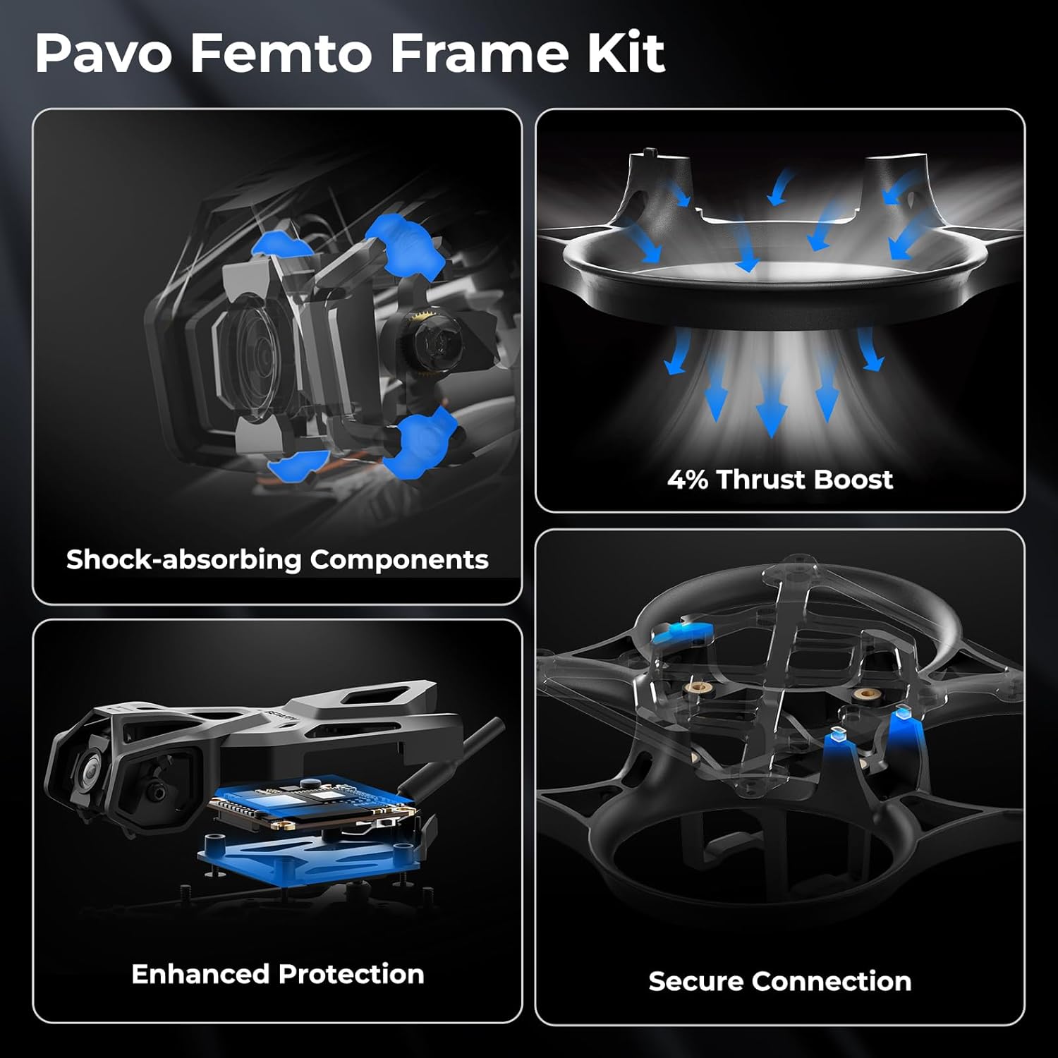 • Комплект Pavo Femto Frame: Безчетковата рамка Pavo Femto Whoop Frame осигурява 4% увеличение на тягата в компактен дизайн, предлагайки подобрена мощност и стабилност. Тя разполага с подобрени връзки между канала на рамката и плочата от въглеродни влакна с добавени опори и ограничения за сигурно сглобяване. Оптимизирана за DJI O4 Air Unit, тя включва подсилена защитна структура за платката. Същевременно модулният ѝ дизайн е съвместим с компонентите на Pavo Pico и Pavo20.