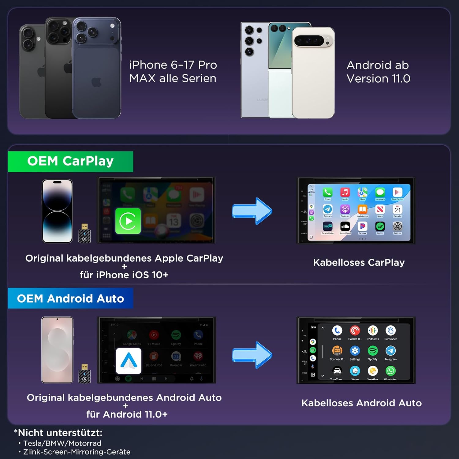 • [Лесно свързване и безпроблемно превключване] Благодарение на подобрения си чип и WiFi модул, U2AC-01 предлага наистина безжично изживяване без досадни кабели. Свържете се бързо и лесно само в три прости стъпки: Включете, сдвоете и започнете. Просто сдвоете отново Bluetooth на продукта и той безпроблемно ще превключва между безжичния Android Auto и безжичния CarPlay, в зависимост от това кой телефон (Android или iOS) е сдвоен. Превключването между 2-в-1 никога не е било толкова гладко!
