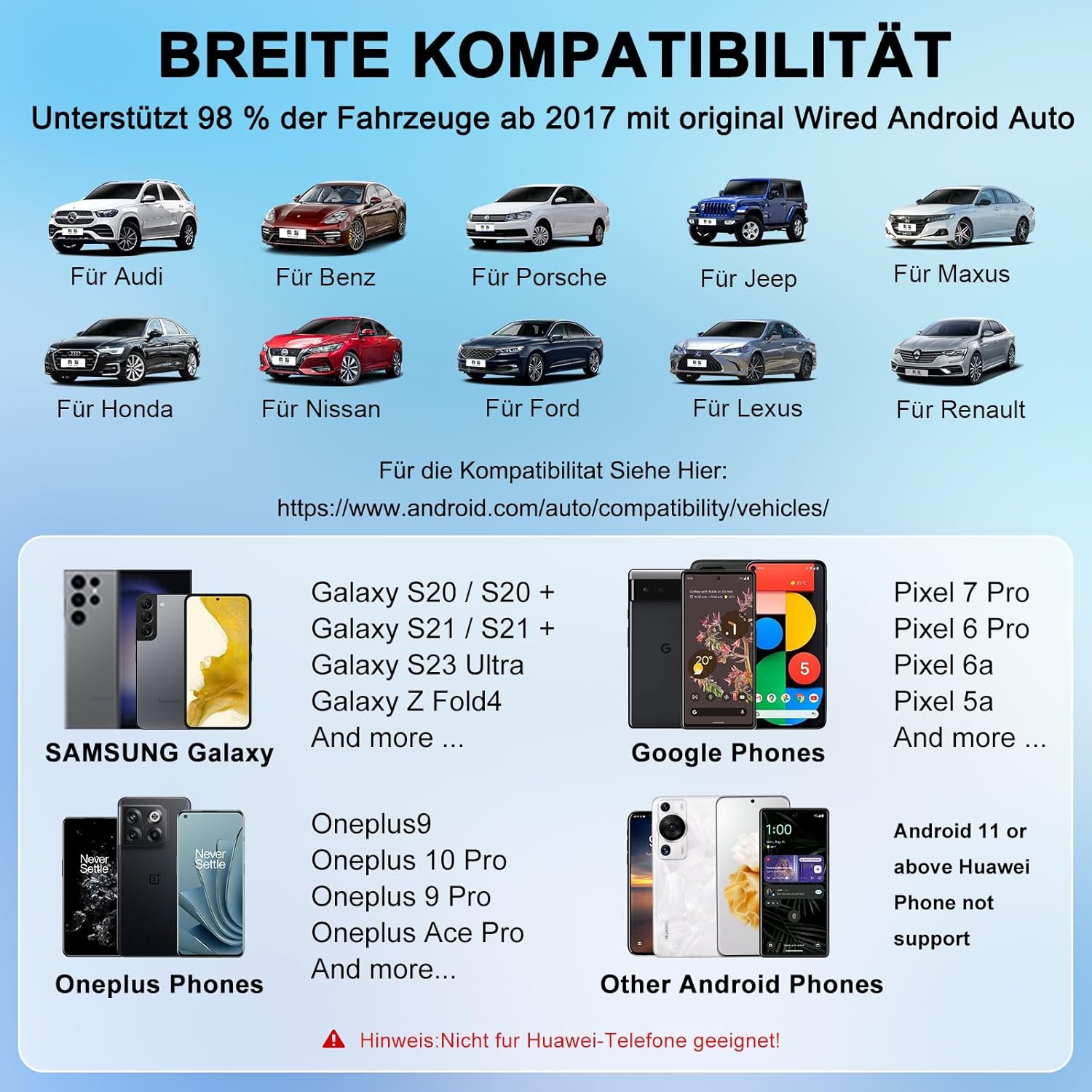• 【Универсална съвместимост】Адаптерът за Android Auto е съвместим с автомобили, оборудвани с кабелен Android Auto, и поддържа телефони с Android, работещи с Android 11 и по-нова версия. CarPlay/iOS не се поддържа. (Моля, уверете се, че колата ви поддържа Android Auto, преди да закупите.)